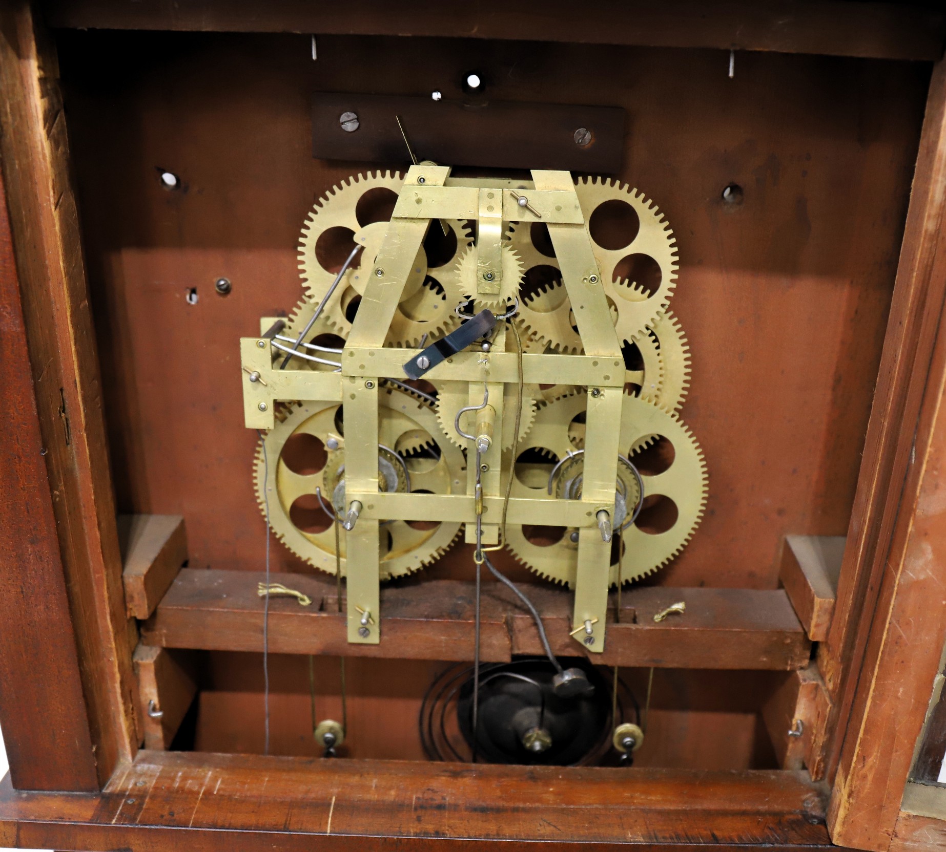 a wire gong. The winding arbors are connected to the wagon spring arms with compounded cords running through small brass