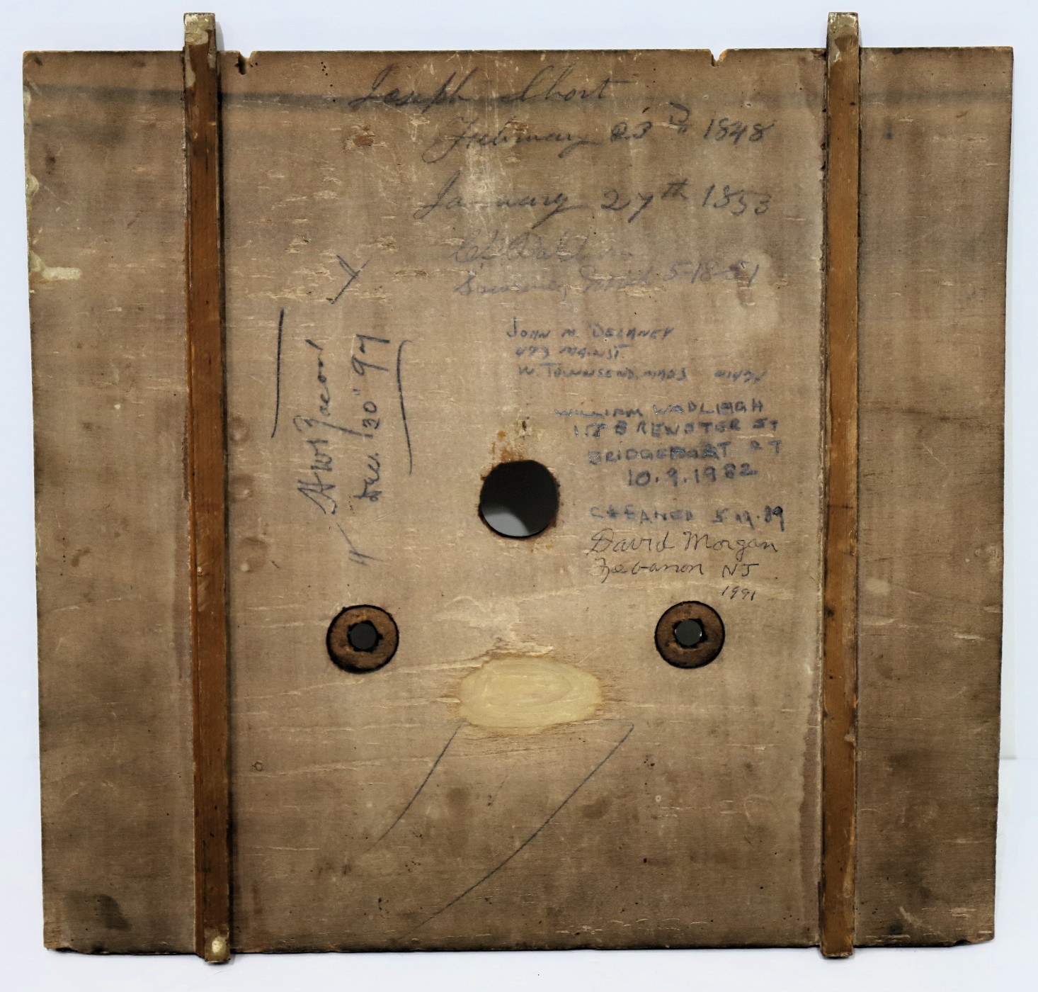 Delaney, whose name I have seen before. He must have owned a lot of clocks. The hands are period and proper. The strap brass 8-day, time-and-strike movement is unsigned, with large brass wheels. It is running, barely, and striking on