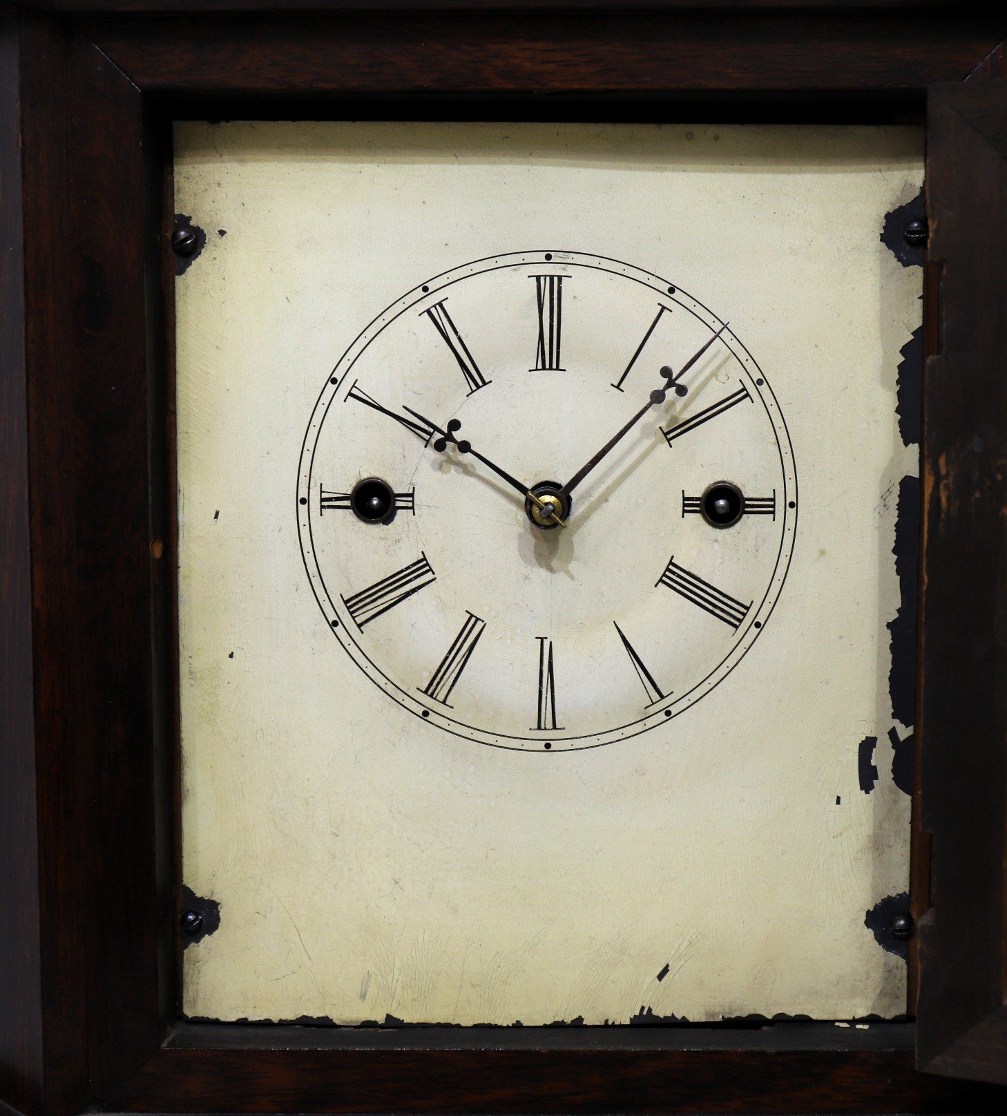 unsigned 30-day round movement is clean and running, driven by the Joseph Ives lever-spring (wagon spring) movement in the base. The