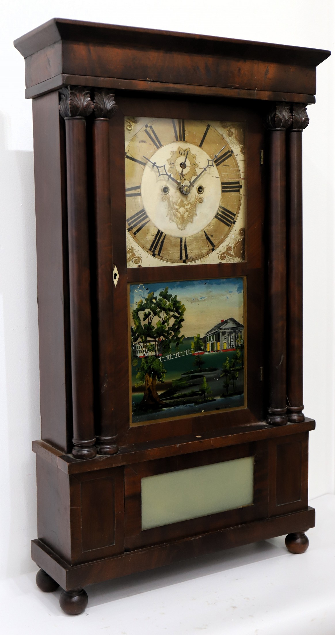 Brass Clock, 1829-1832. An impressive empire shelf clock with two full columns on each side, a cornice top, and mahogany