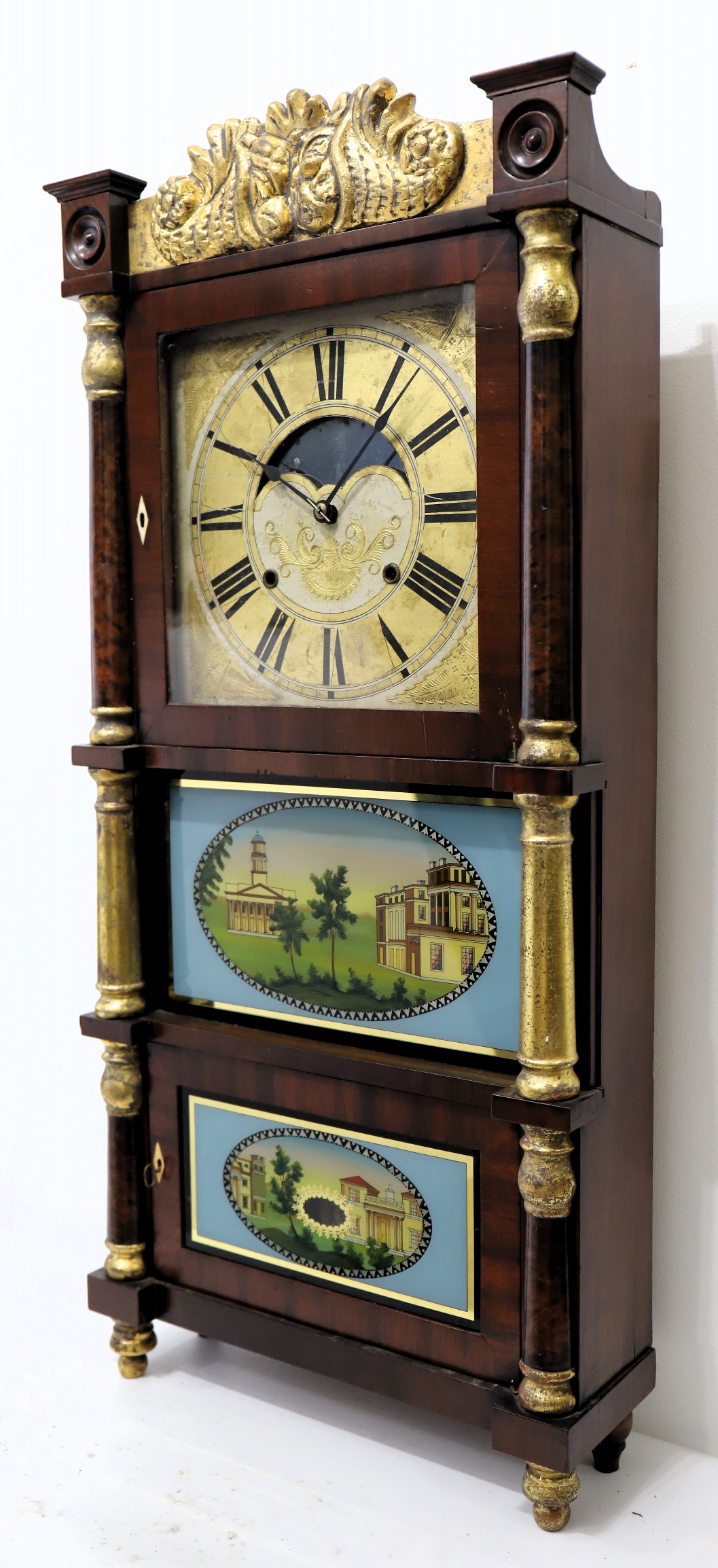 with side-arm and the triple decker style are consistent with other clocks from this firm (see here, here, and here). The 37.5-inch