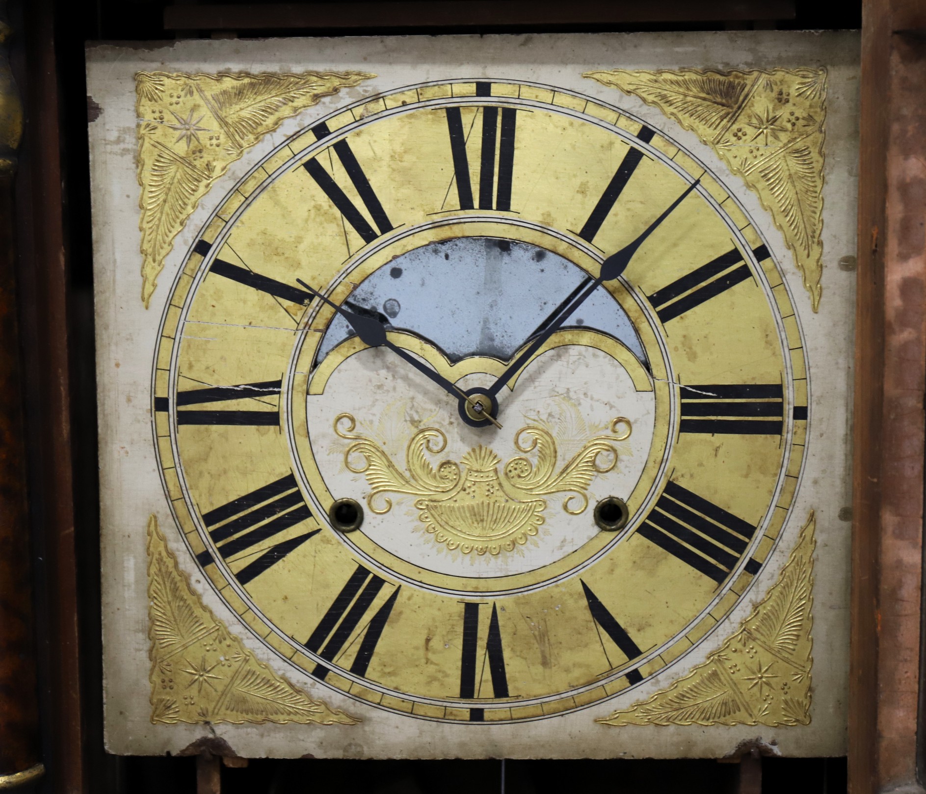 tall case is remarkably original, except for the two repainted tablets (Moberg) on the old/original glass. The mahogany veneer