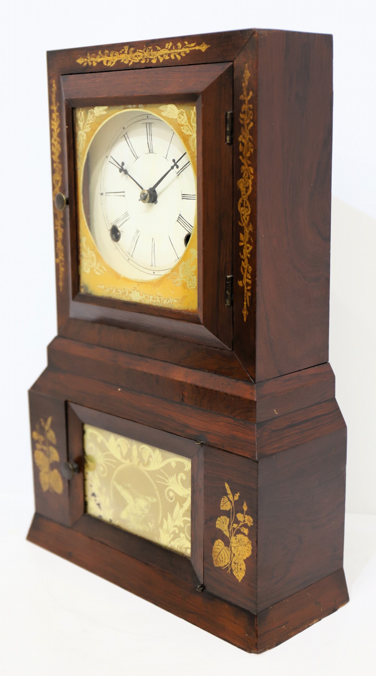 examples had a wagon spring movement; this clock has an unsigned 8-day, time-and-strike standard spring movement). The gilt