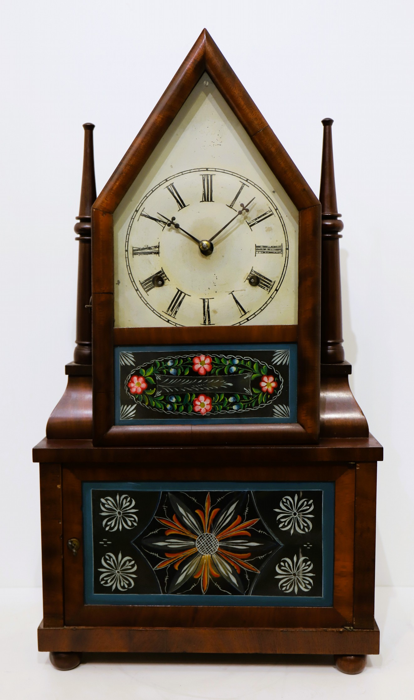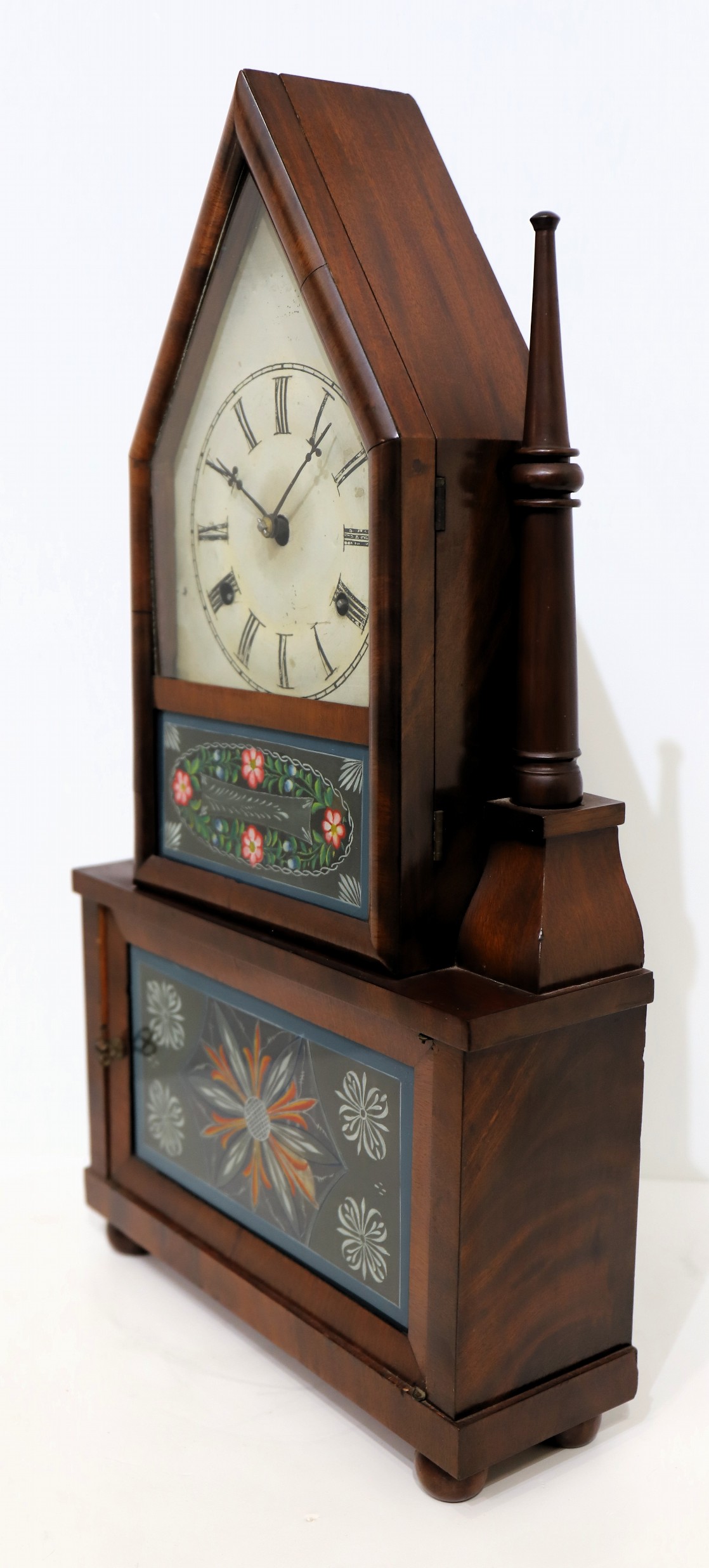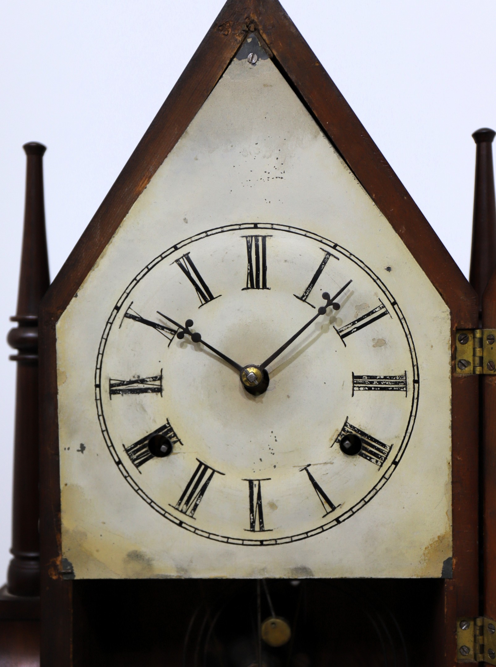 wagon-spring movement, here in a “sharp gothic” case. The case is 21.75 inches tall and 11.75 inches wide with mahogany