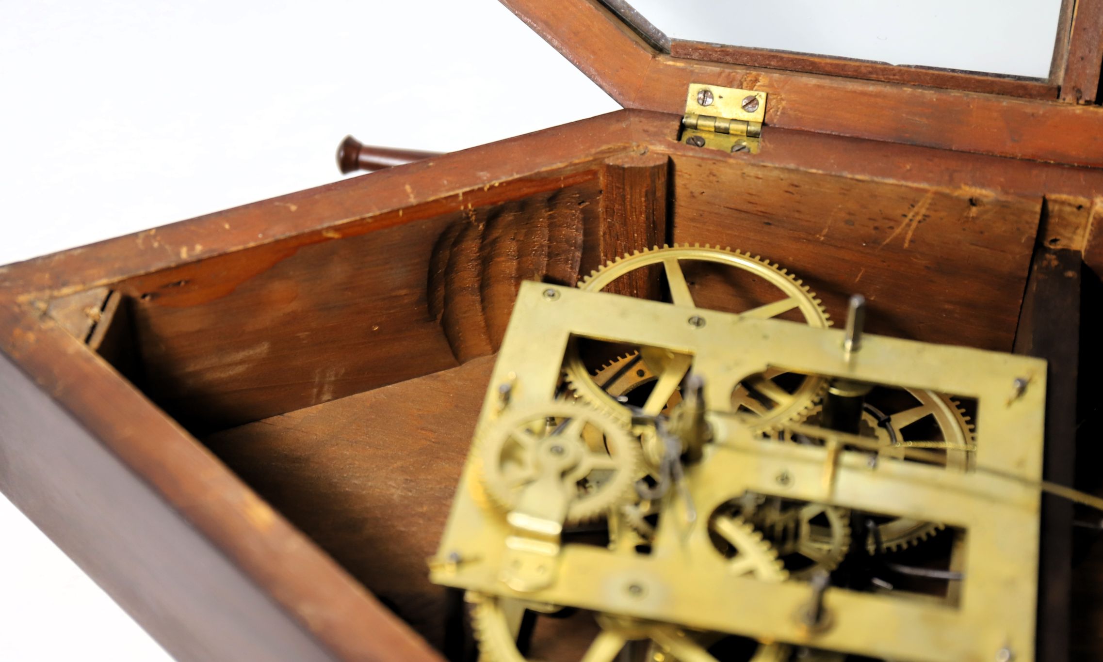 the hands are likely original. The 30-hour time-and-strike movement is unusual in that the time and strike trains are reversed,