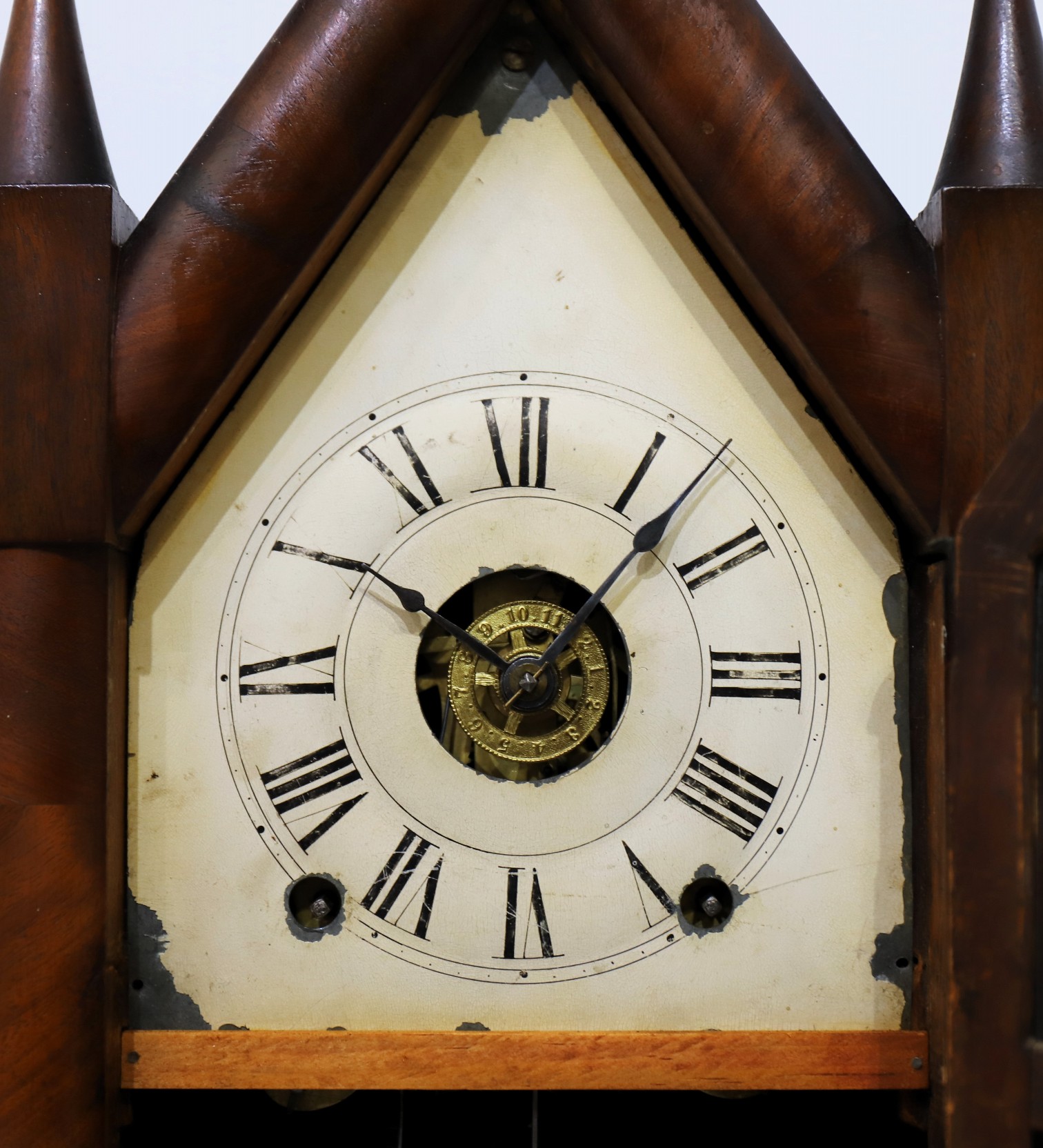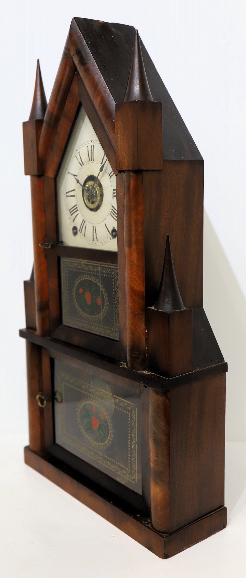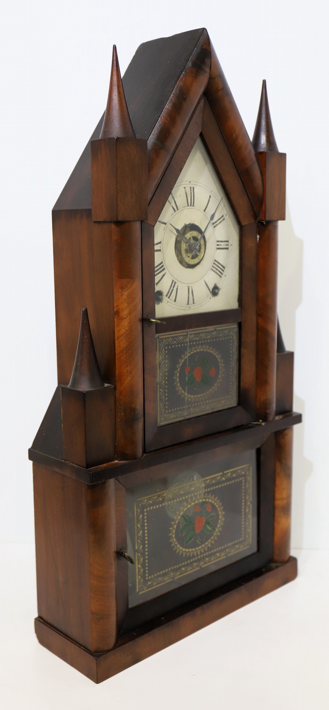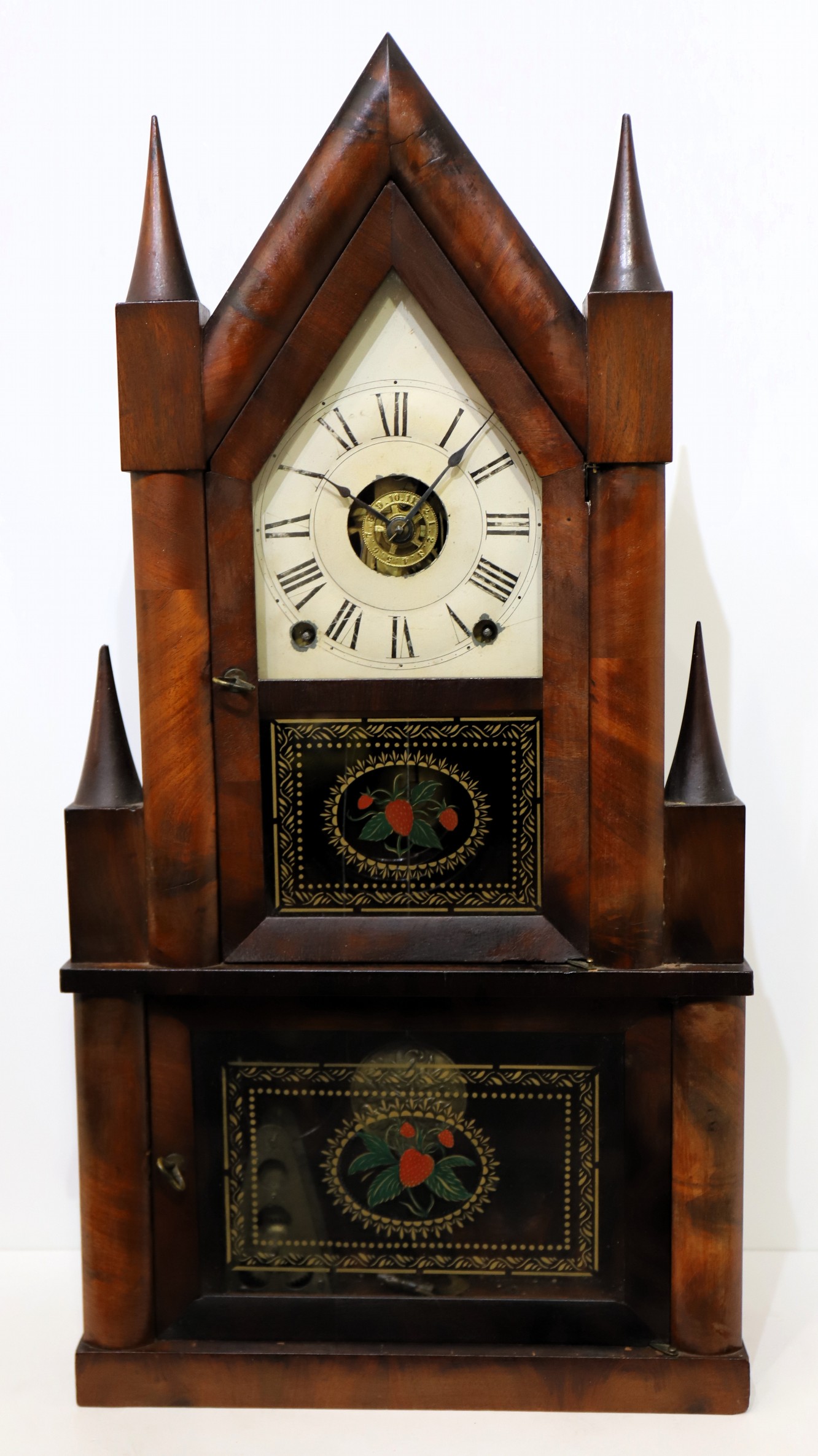 Terry & Andrews double steeple, 1842-1850. Simple double steeples like this are not uncommon, with 14 sales listed on LiveAuctioneers. The 29-inch case is veneered in