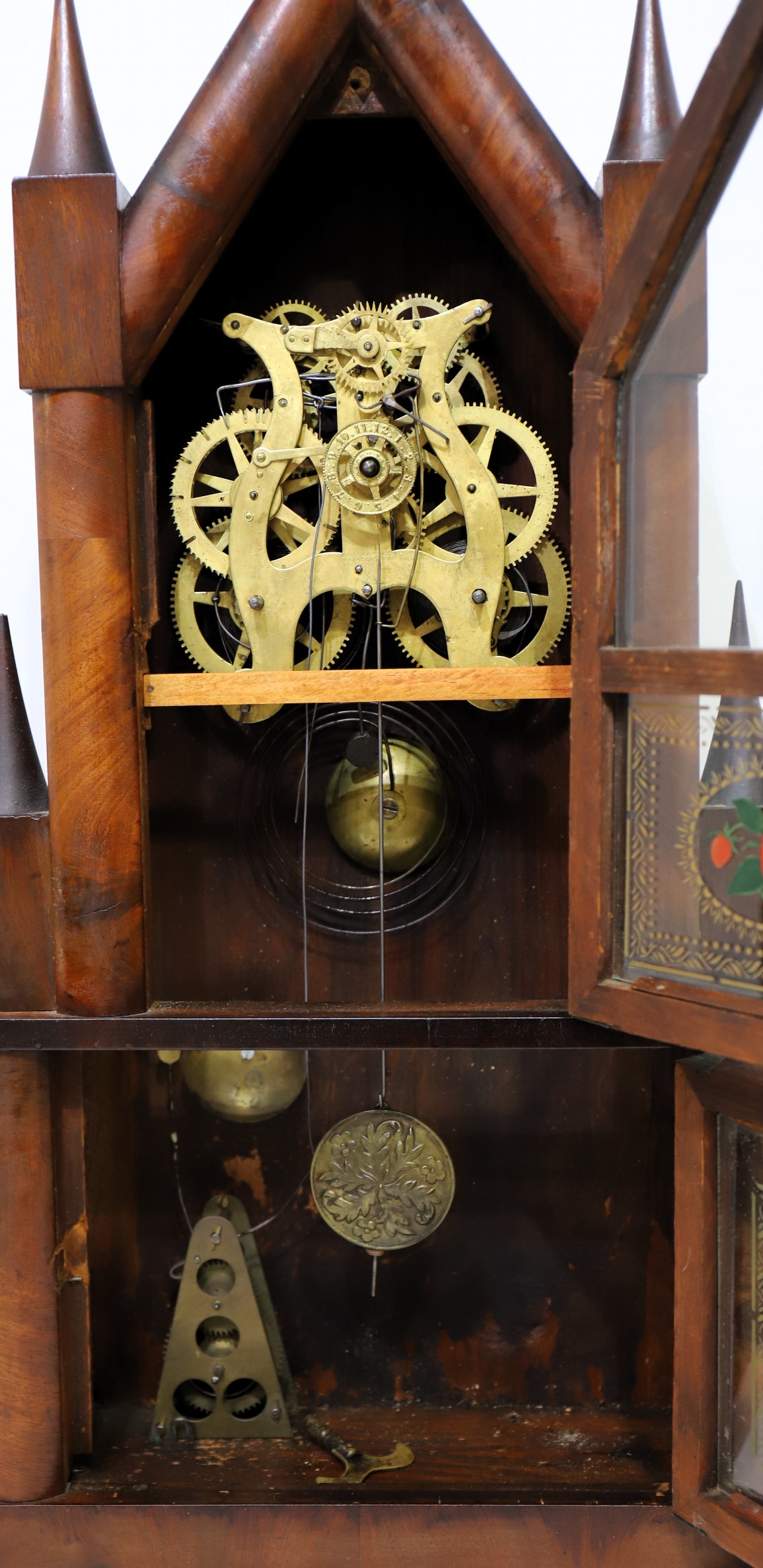 time-and-strike brass movement is die-stamped with the makers and Bristol, CT. It is running and striking on the wire gong without