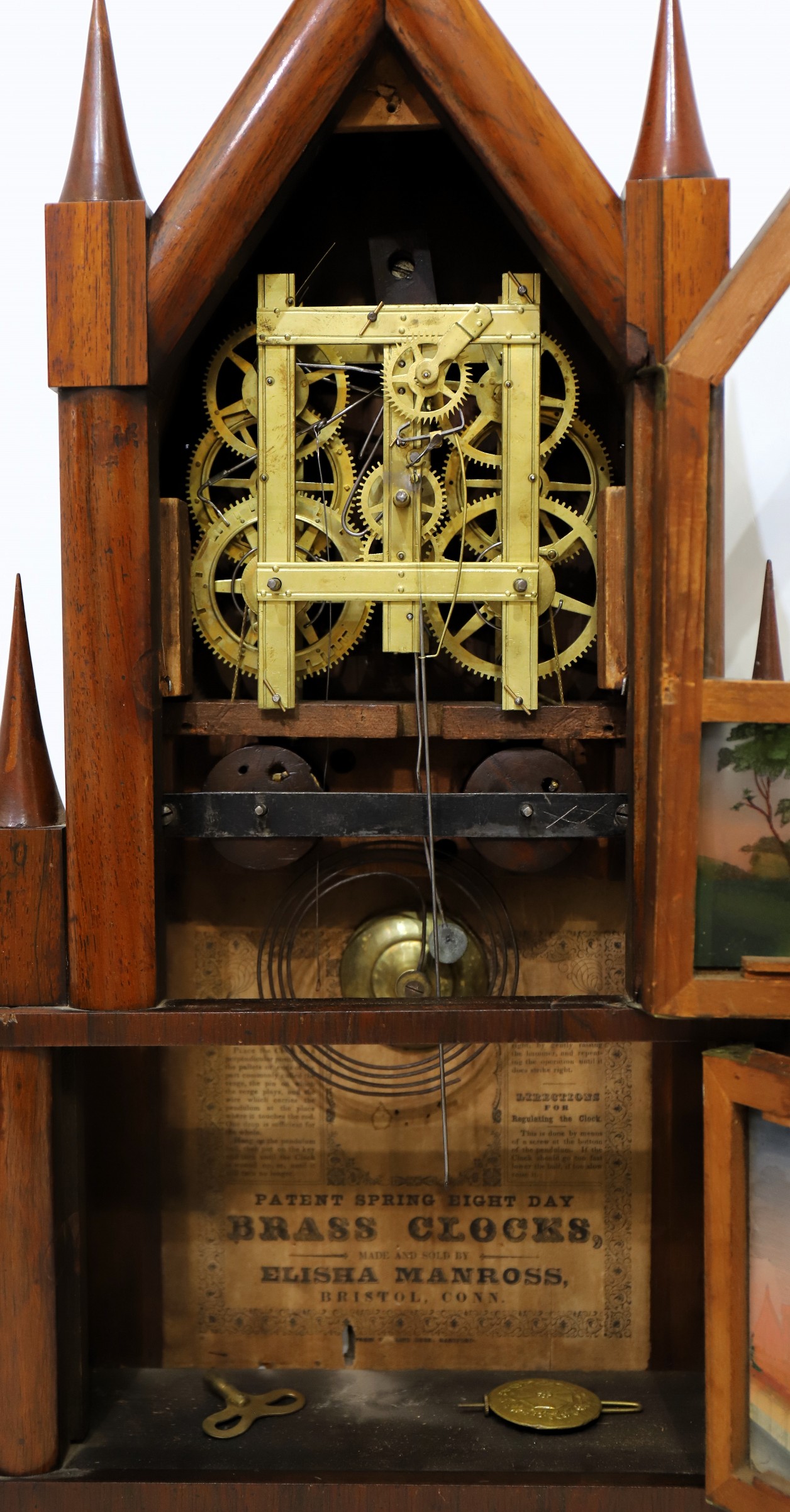 8-day time-and-strike movement is unsigned, as is typical; it is running, but not strongly, and striking on a wire gong. Note