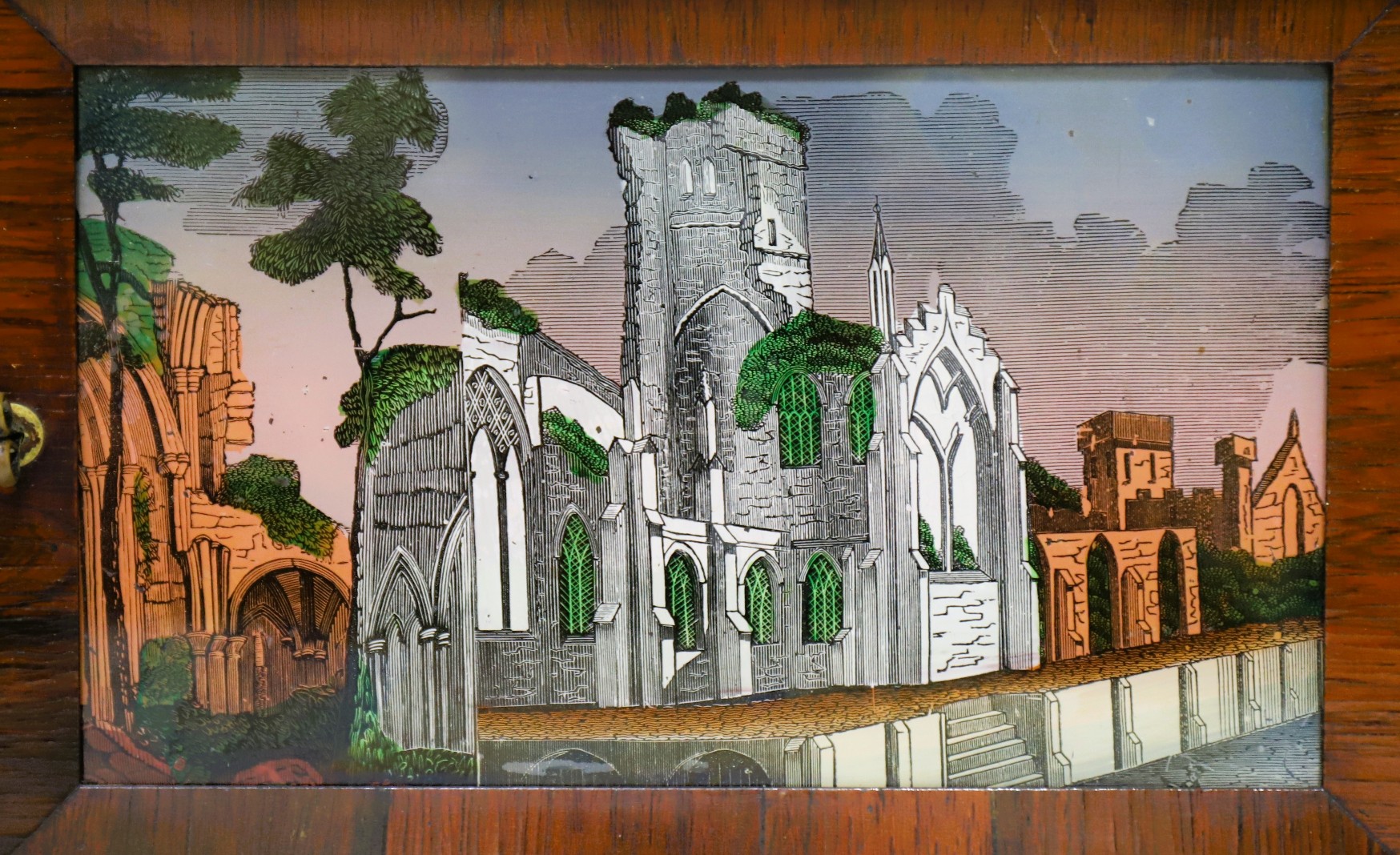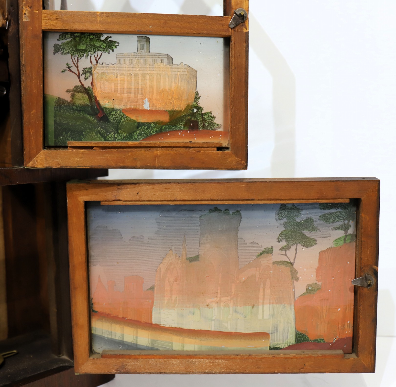 clean, polished finish. The three glasses are period if not original, with spectacular decalcomania tablets. These