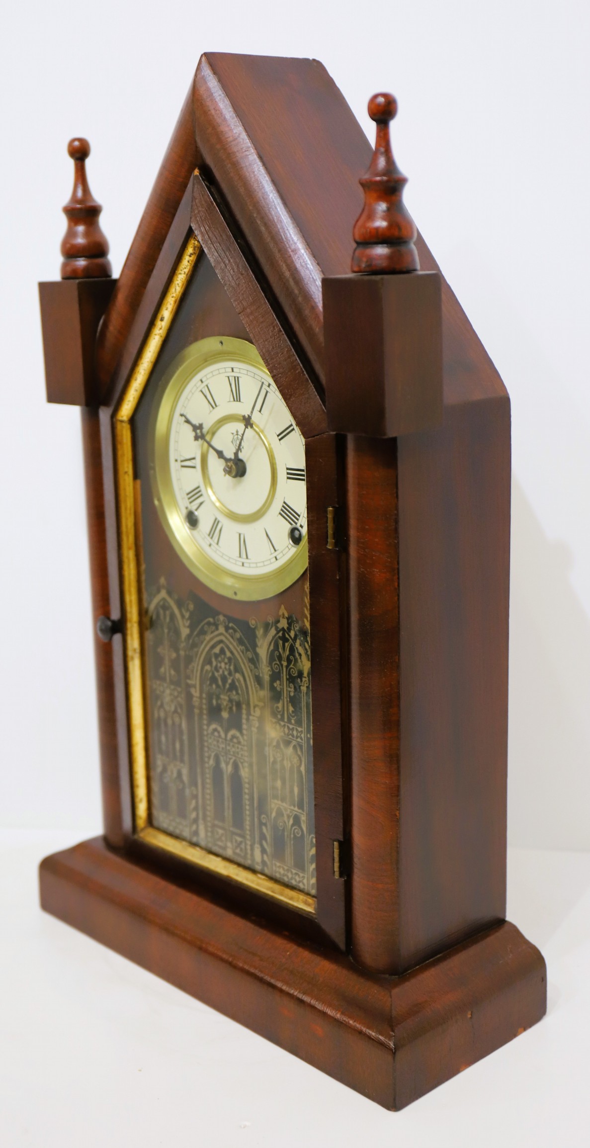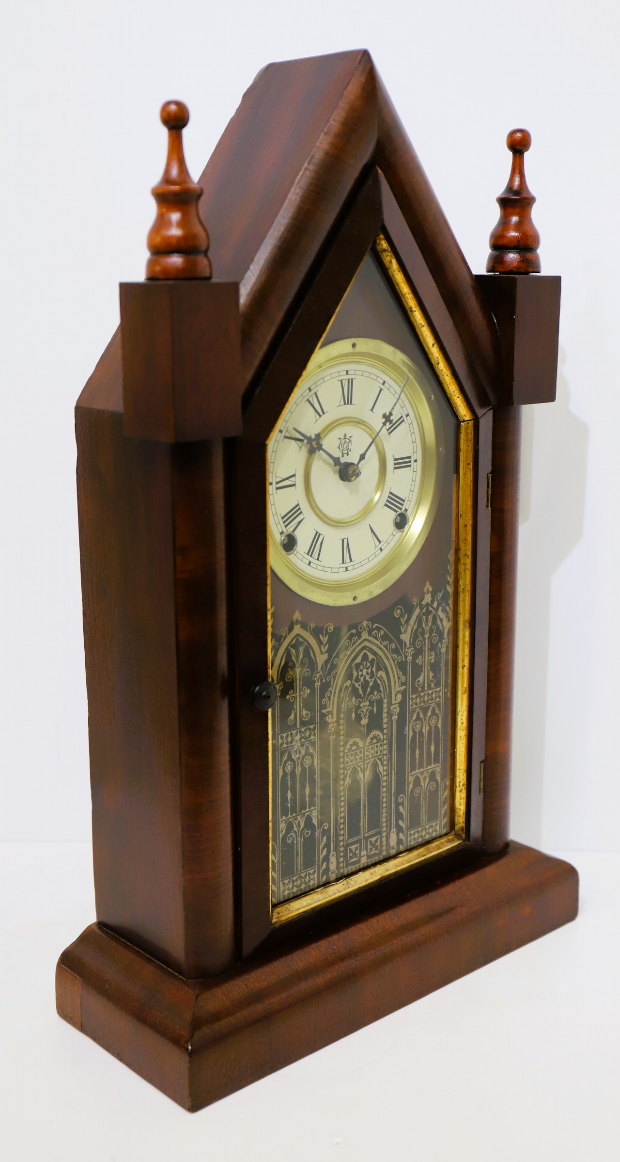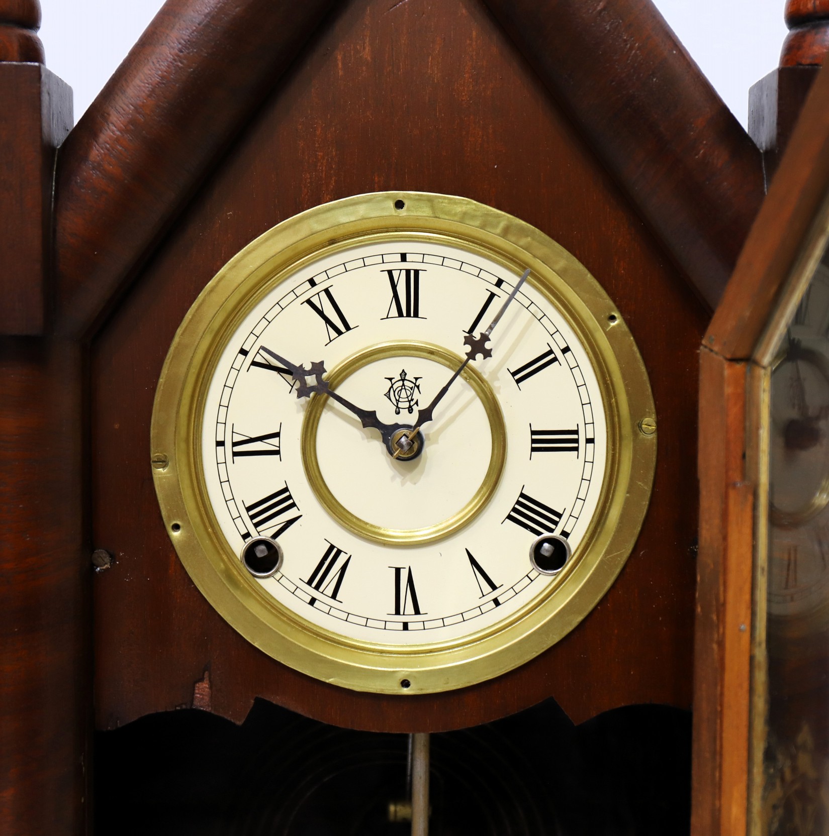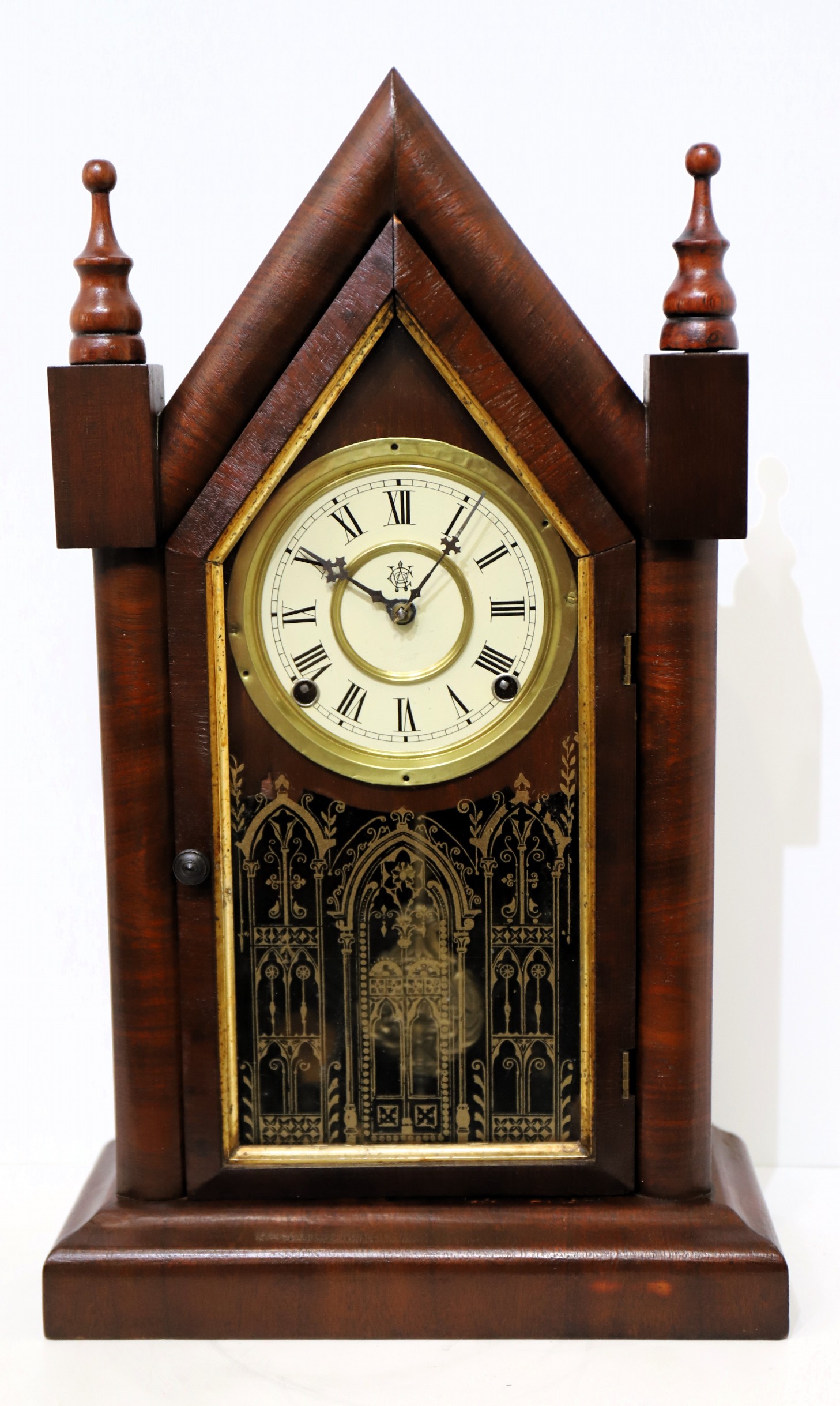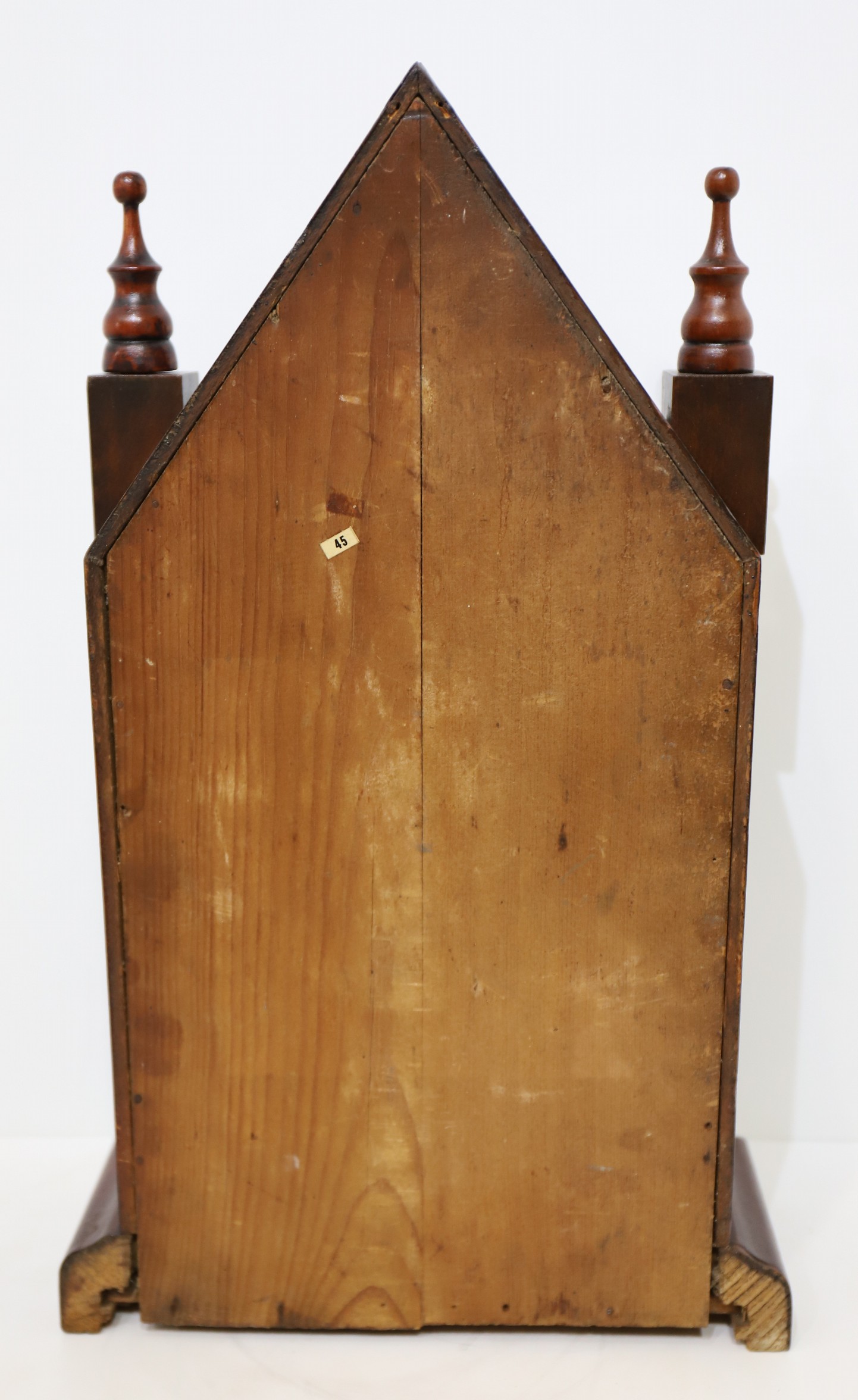 1883. A 19.5-inch case veneered in mahogany with a clean finish and proper finials. The door glass is old but the image