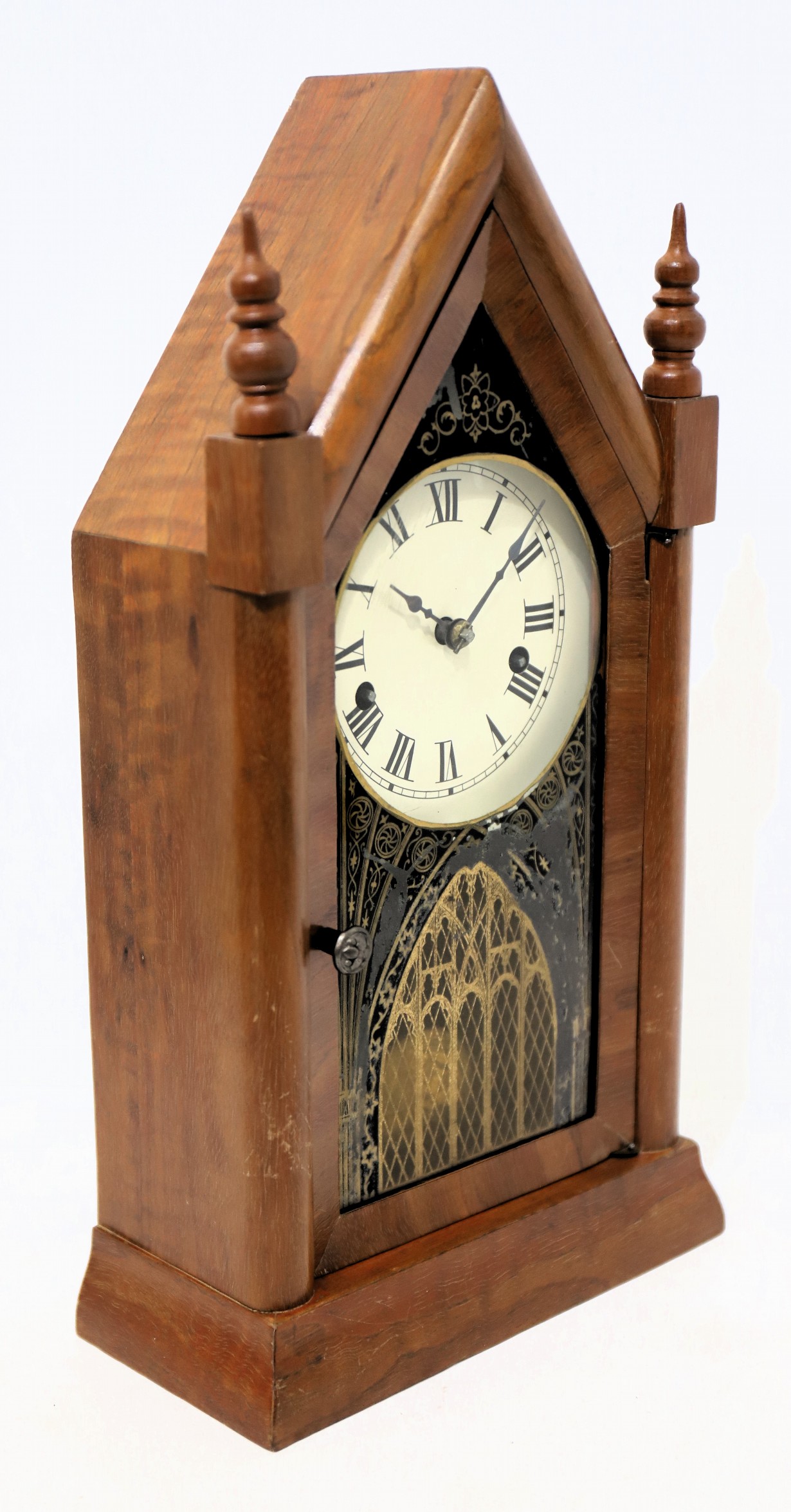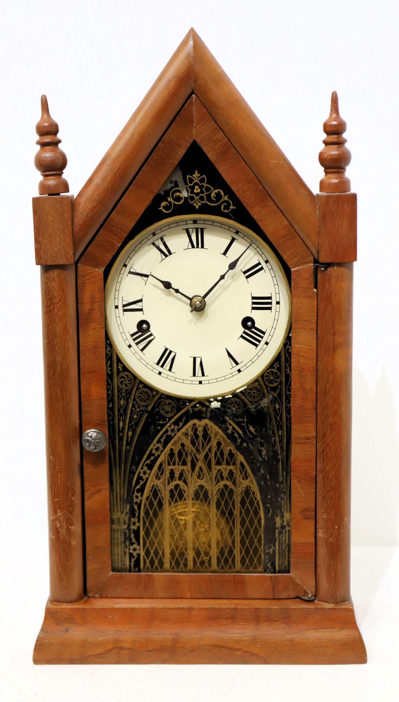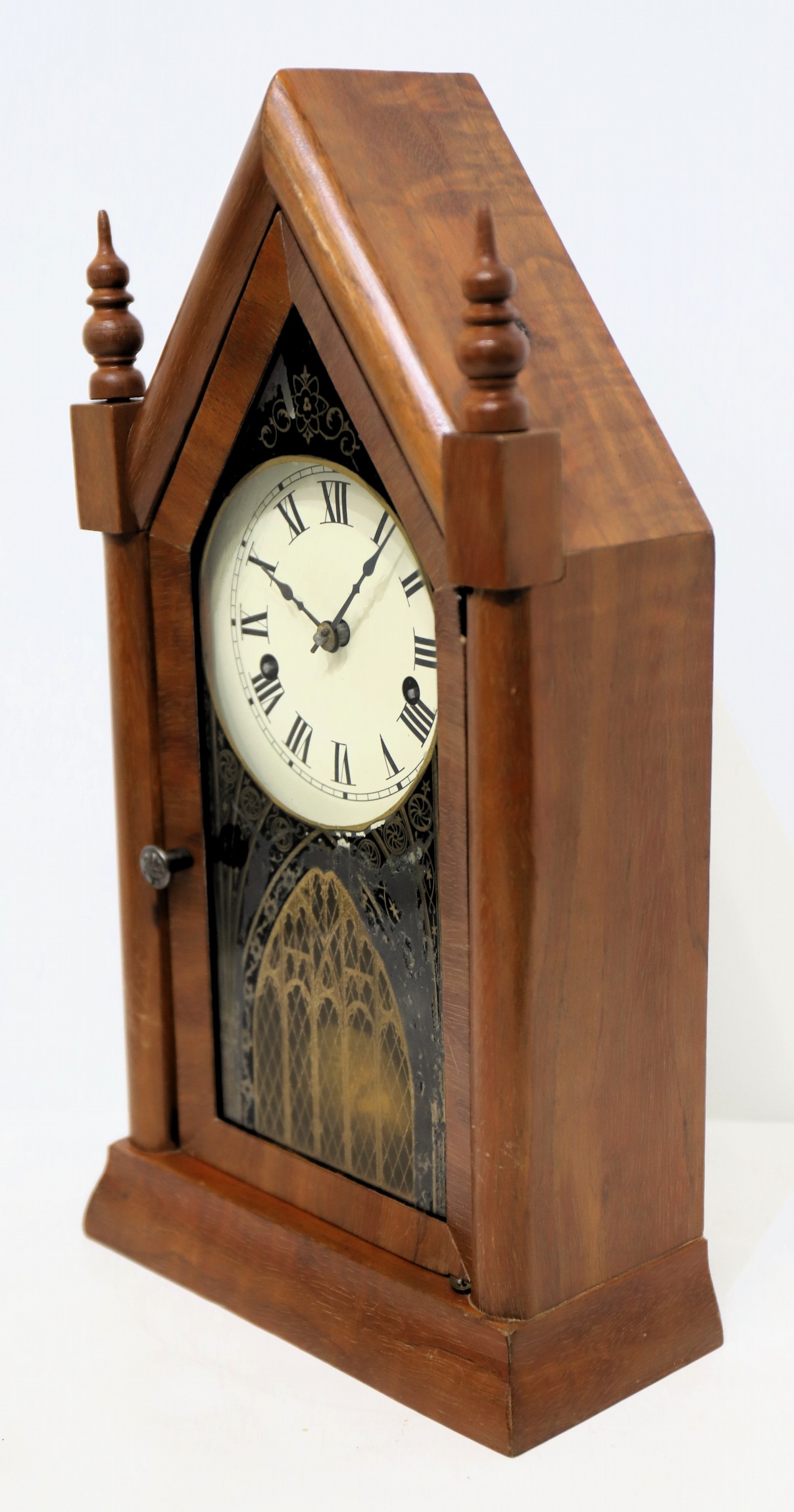 they purchased J&C in 1857. The 15.5-inch mahogany case has a clean, light finish and a period/original door glass with