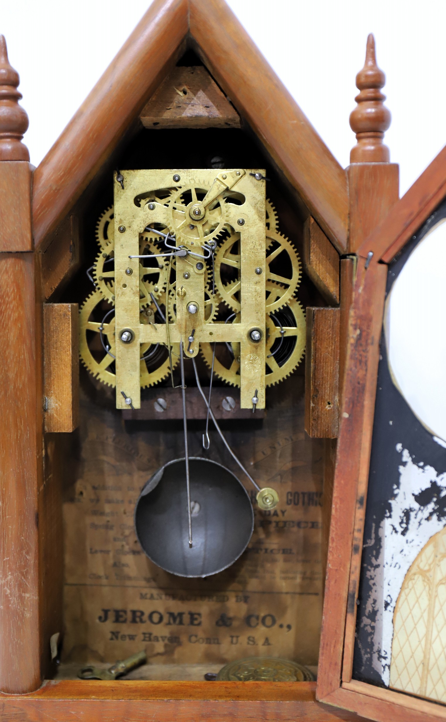 Jerome & Co. miniature steeple, ca. 1860. The label says Jerome & Co. but the movement is die-stamped New Haven Clock Co. NHCC continued to use the J&C name after