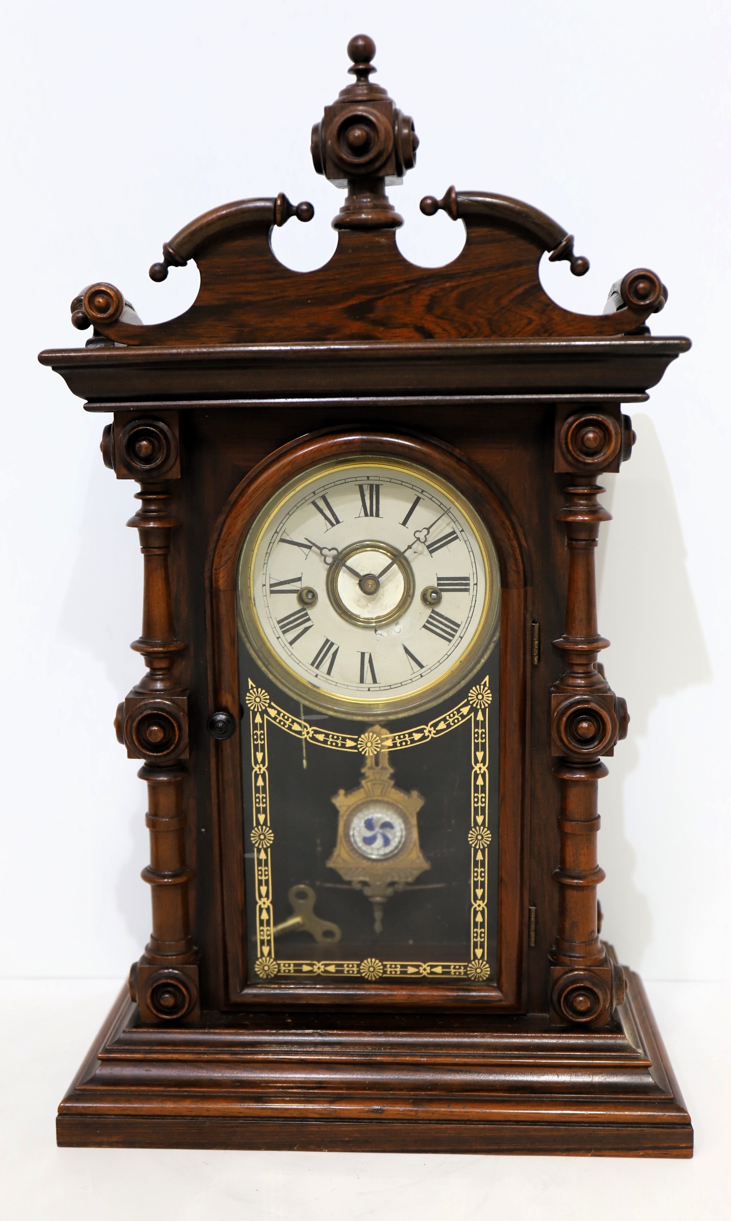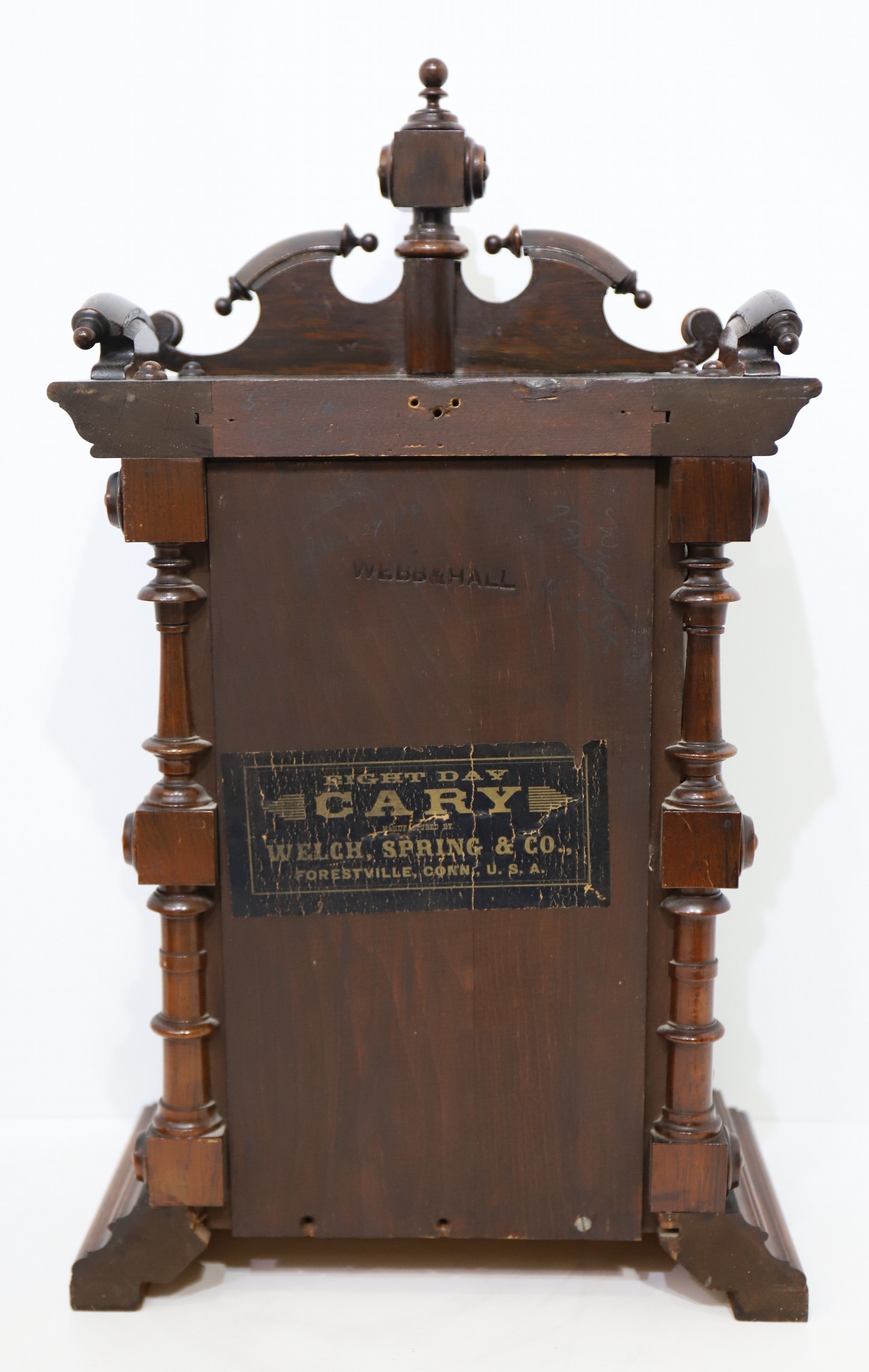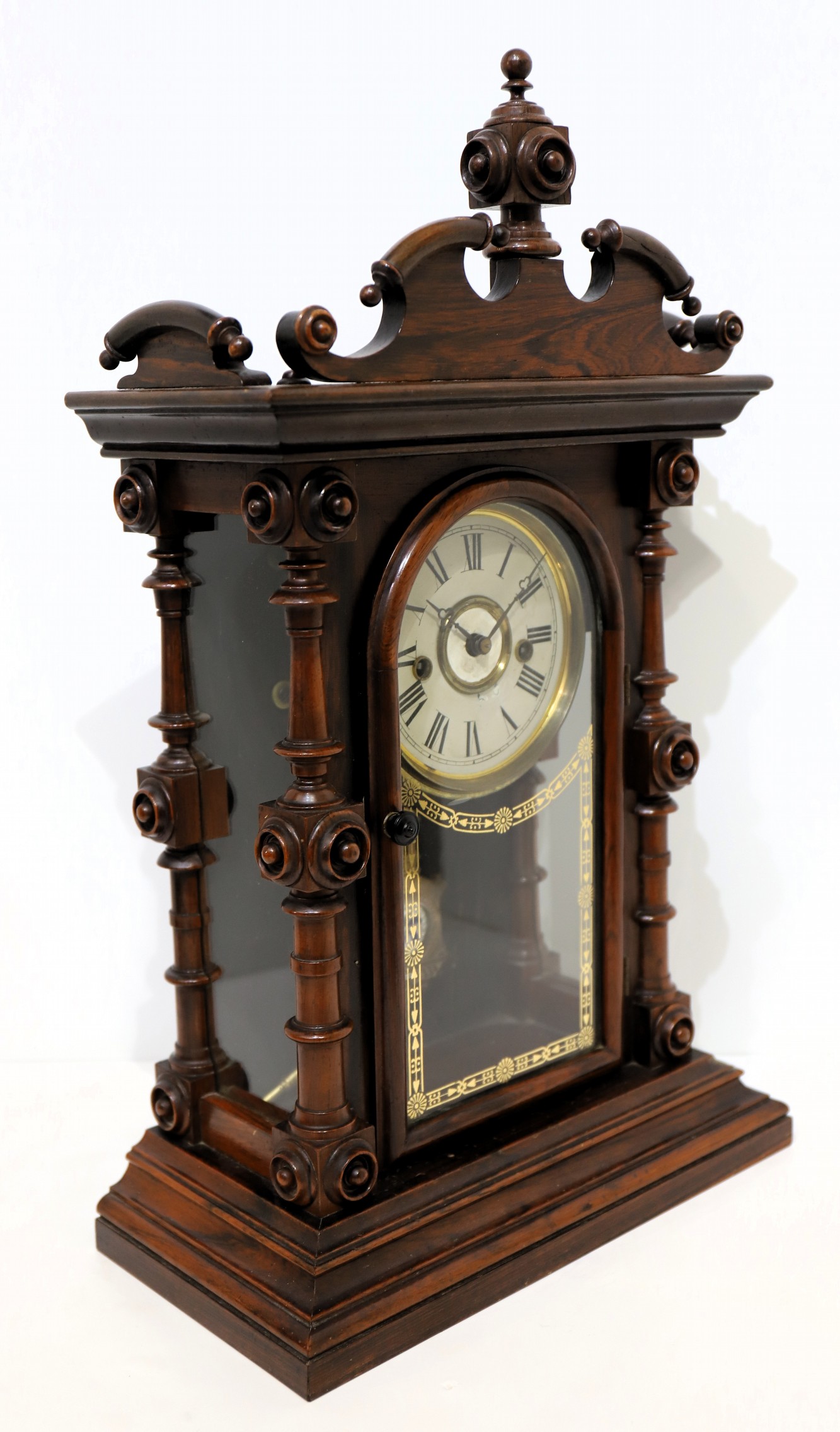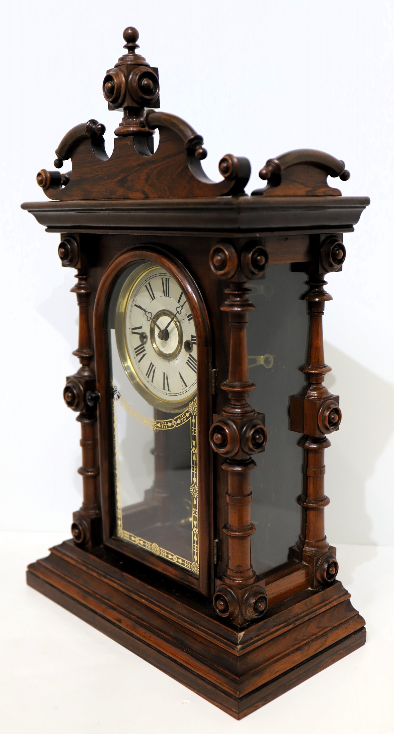 Welch, Spring & Co. “Cary, V.P.”, ca. 1880. A beautiful 20.5-inch polished rosewood case with three original glasses. I see no damage or missing ornaments. The