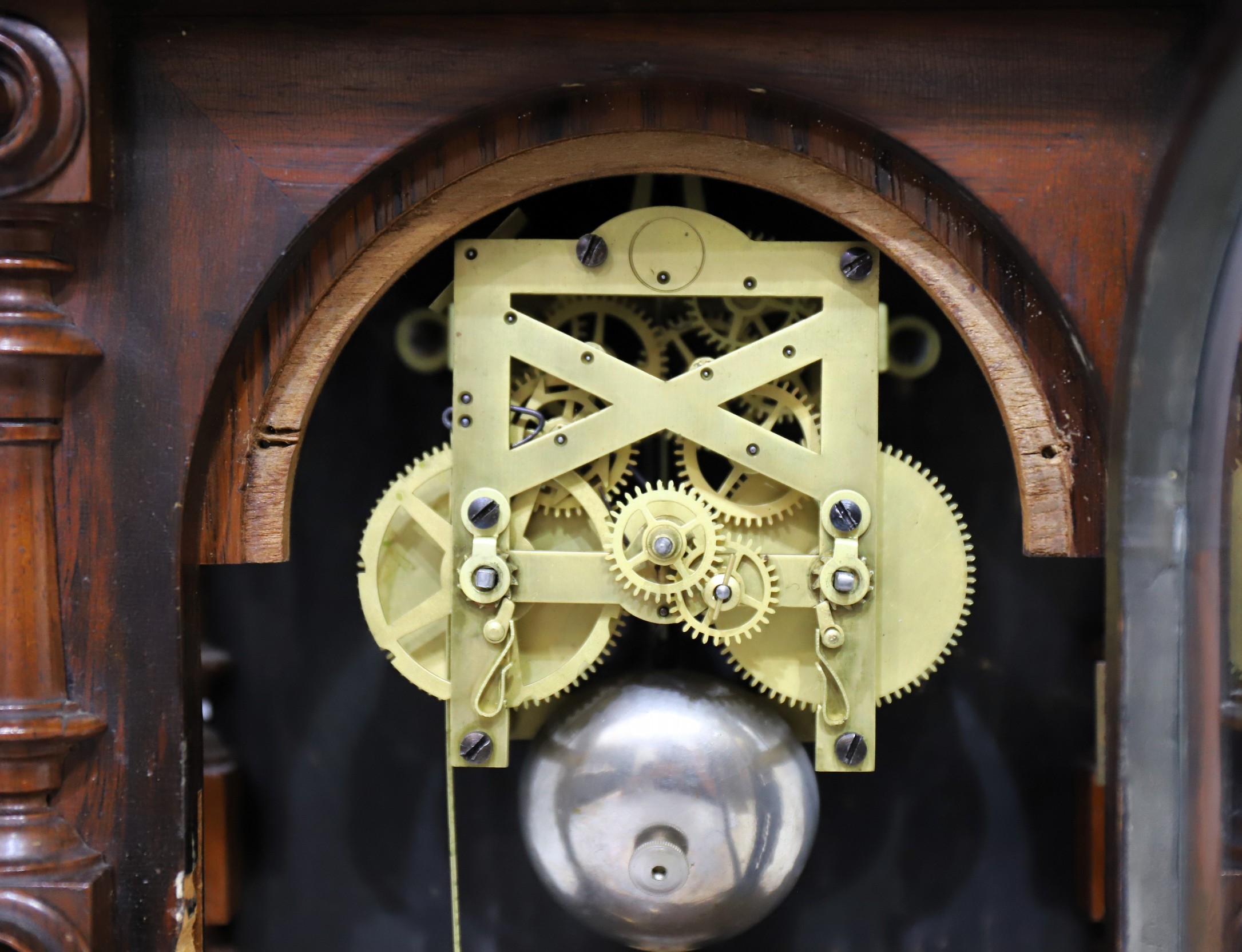 but the click-stop on the time side is loose and winding it can be an adventure. There is a sandwich-glass pendulum and a good