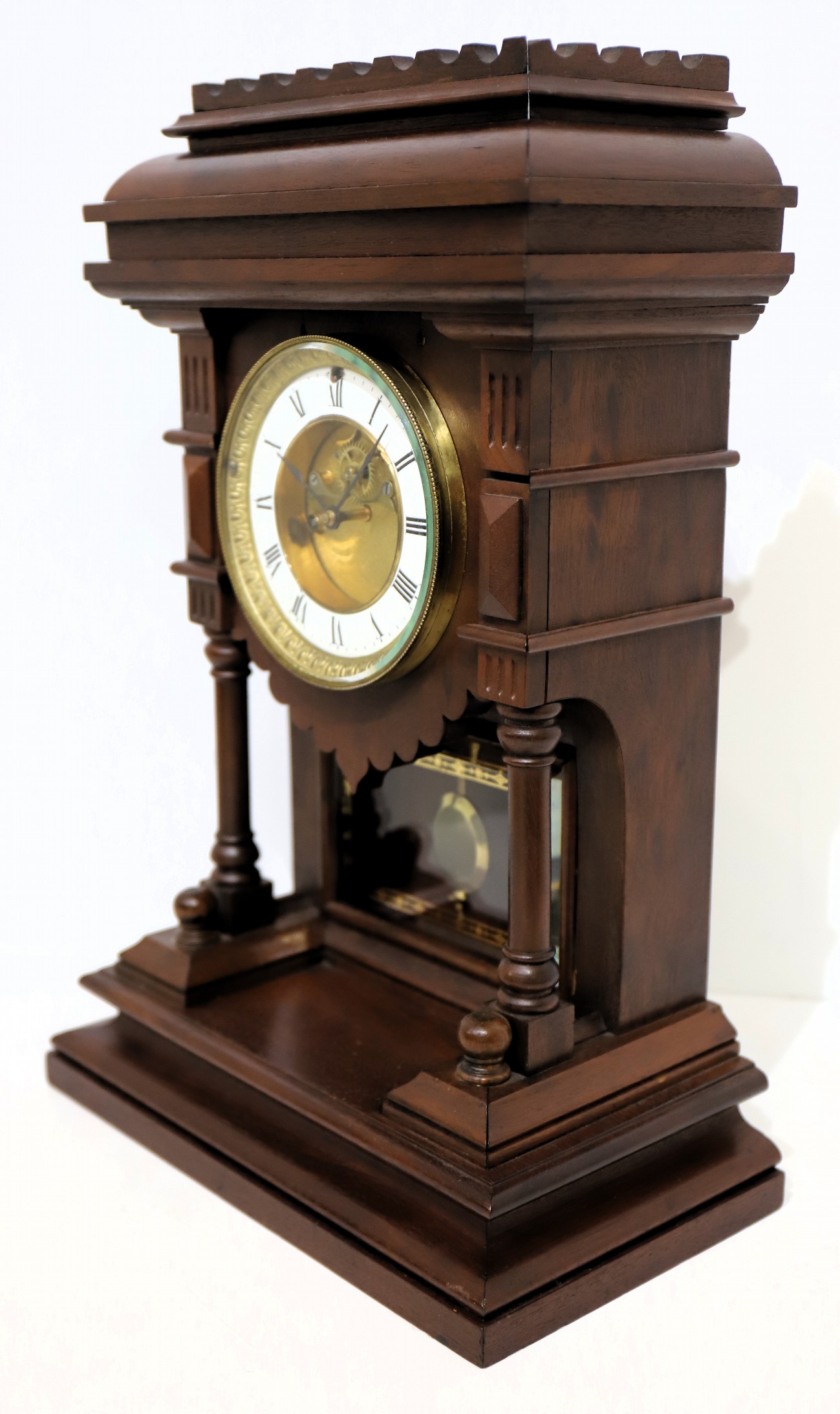 in the bottom well in front of the brass pendulum; note the gilt border. Not all of these came with the visible escapement. The