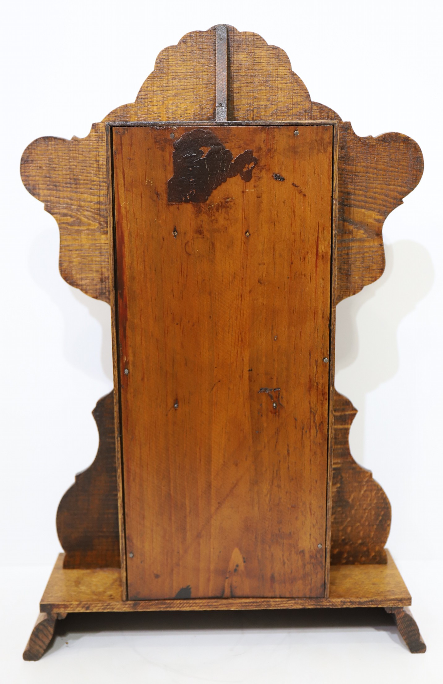 E. Ingraham Co. “Maine”, ca. 1899. A difficult model to find in the Ingraham series on the Spanish-American War; there are only two sales on LiveAuctioneers, most recently (2024) for $530. The refinished oak case is 22.5 inches tall with the battleship “Maine” shown in the crest; it is also depicted on the original door glass. The glossy paper dial is signed, the hands are as shown in the catalog illustration (Ly, Ingraham Clocks & Watches, page 304). The 8-day time-and-strike movement is signed and running, striking on a wire gong. Remnants of a label on the back. $250–$500.