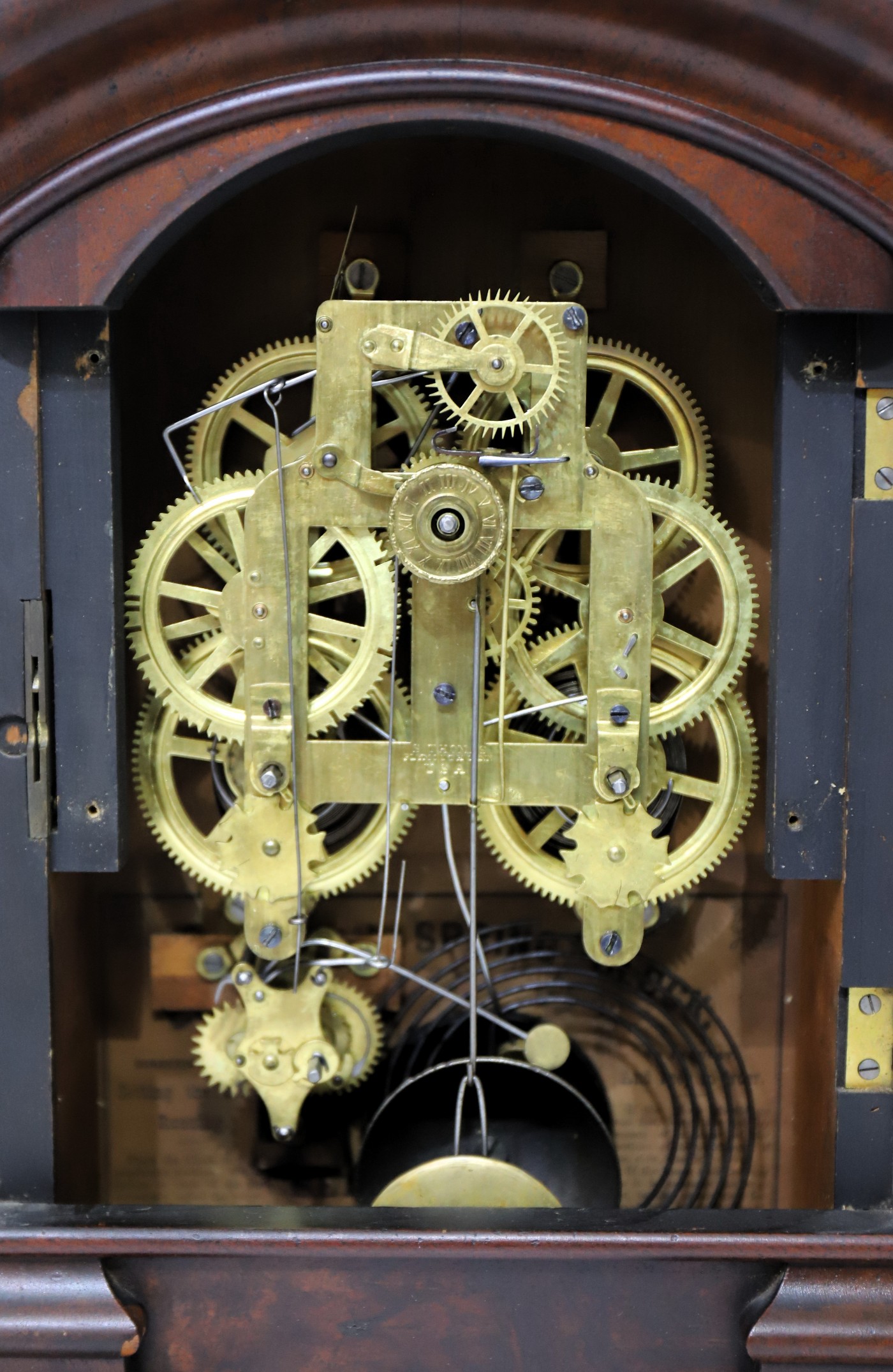 8-day, time-and-strike movement is signed and running, striking on a wire gong; there is an alarm hooked up (untested) that strikes
