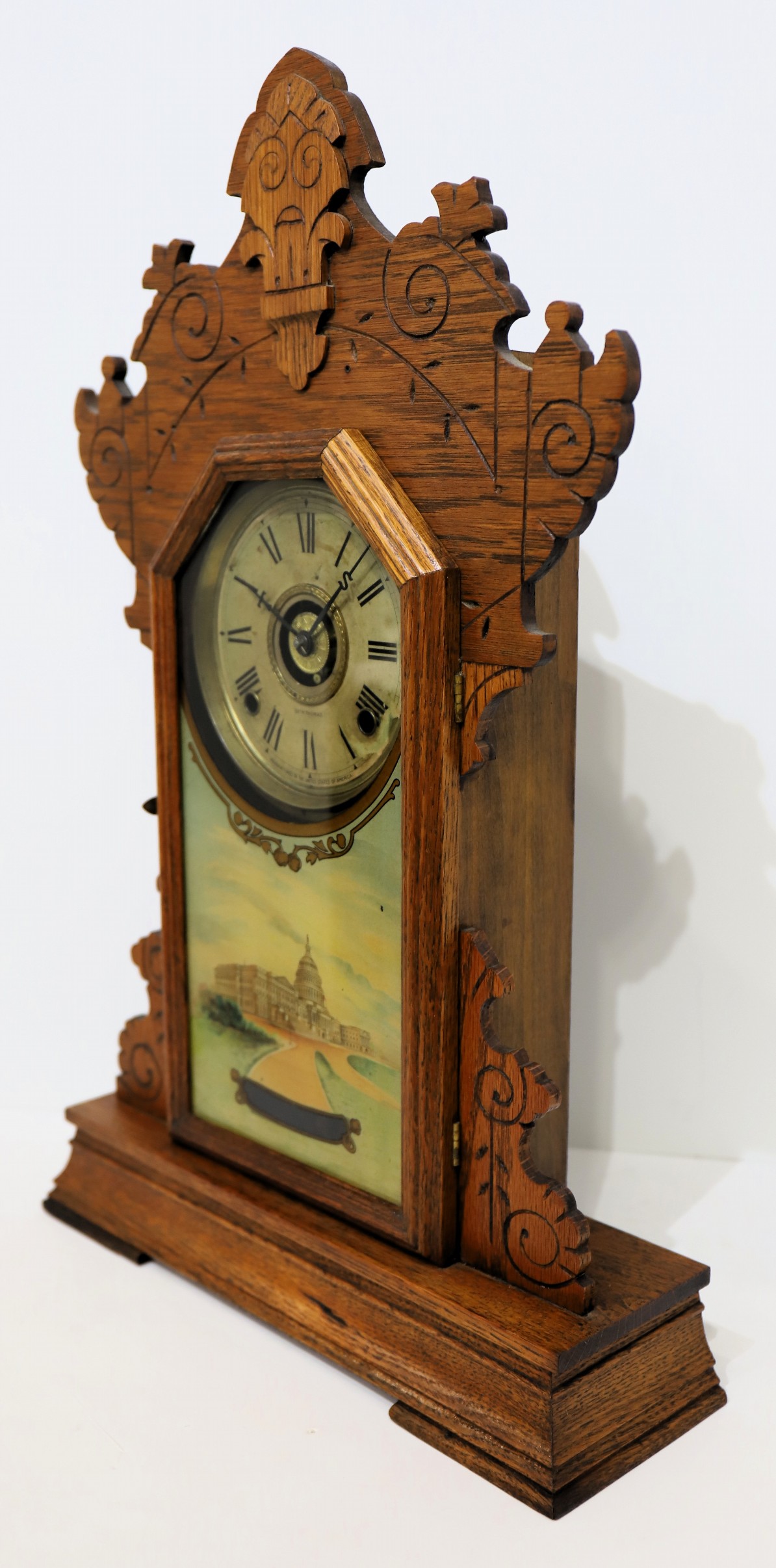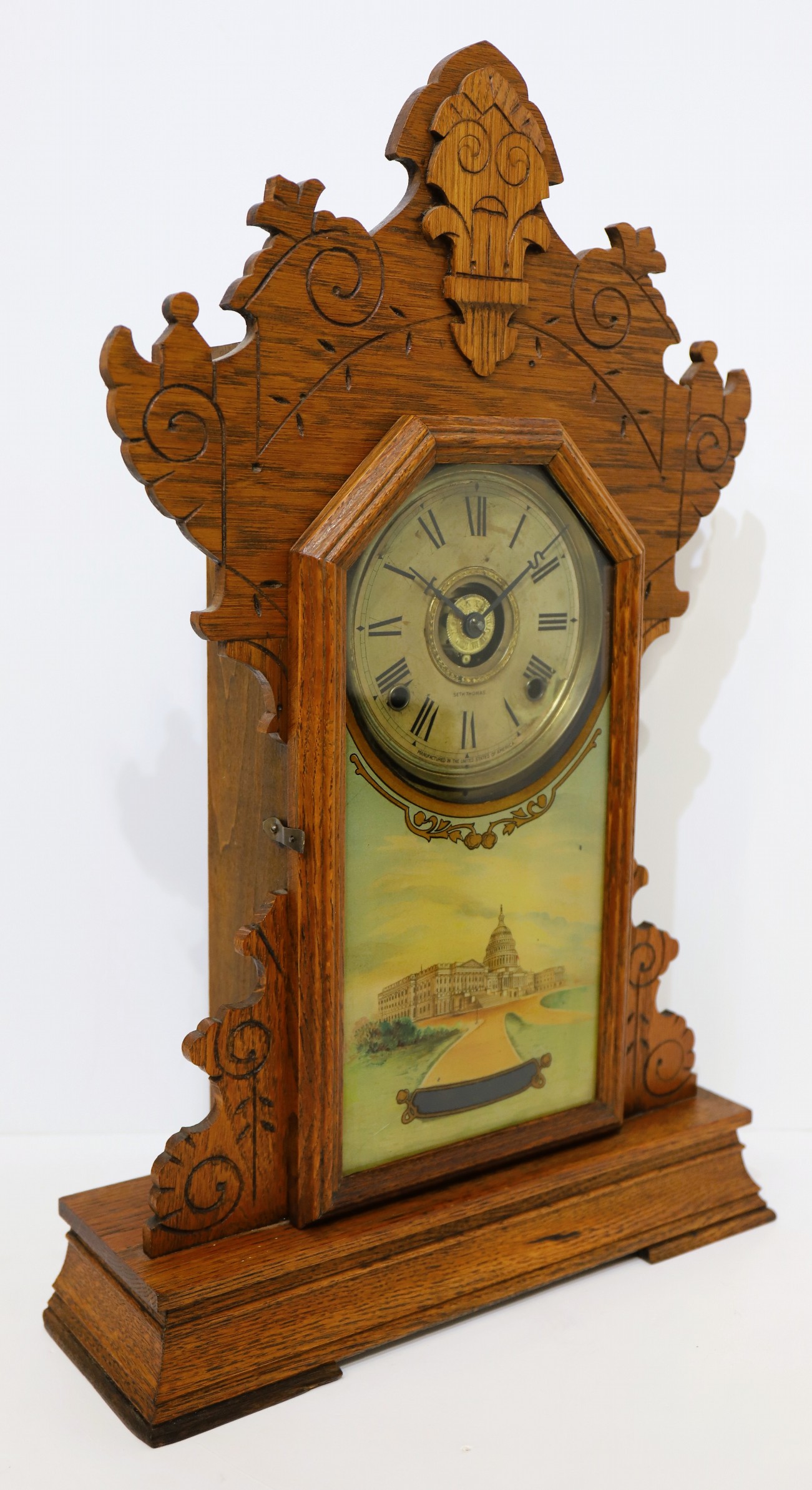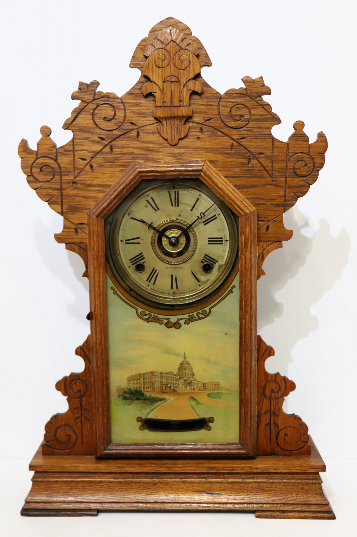 oak case with a clean finish, incisings, and applied ornaments. Seth Thomas offered this as one of six clocks in the “Capitol