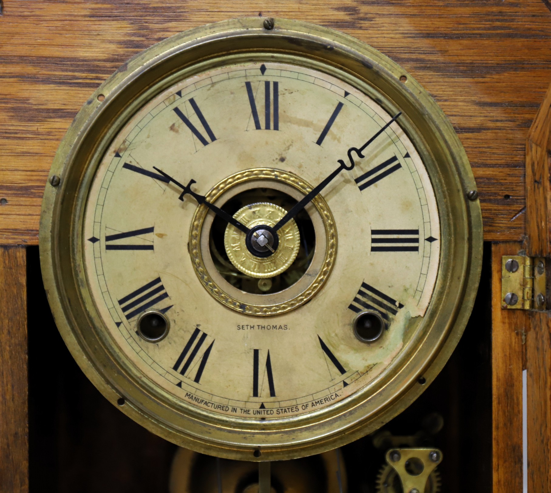 etc. Tran Ly notes that the cases were the same as those used in the College Series clocks, but with painted tablets. The paper dial is discolored and is signed; the hands are Seth Thomas but are not as shown in the catalog illustration (Ly, Seth Thomas