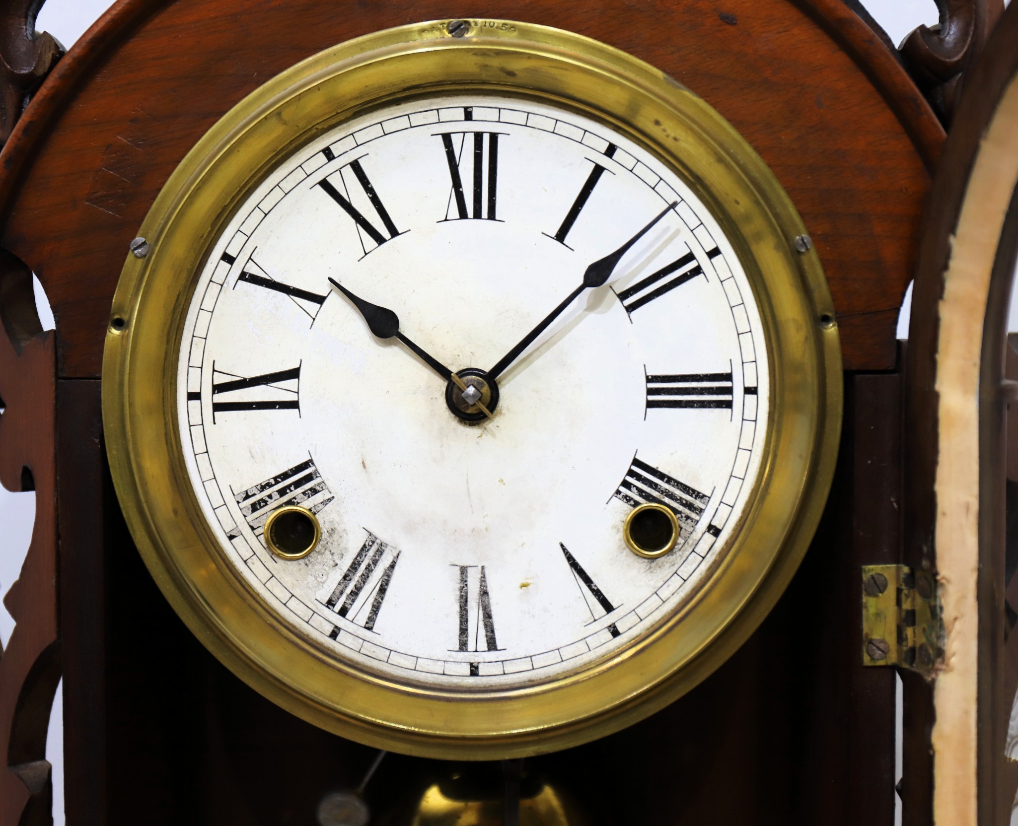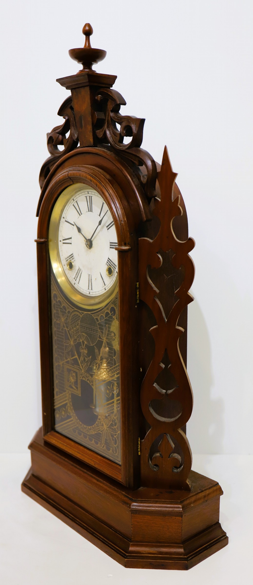 an old finish; the door glass is a modern replacement. The dial is glossy paper with replacement hands. The 8-day, time-and-strike