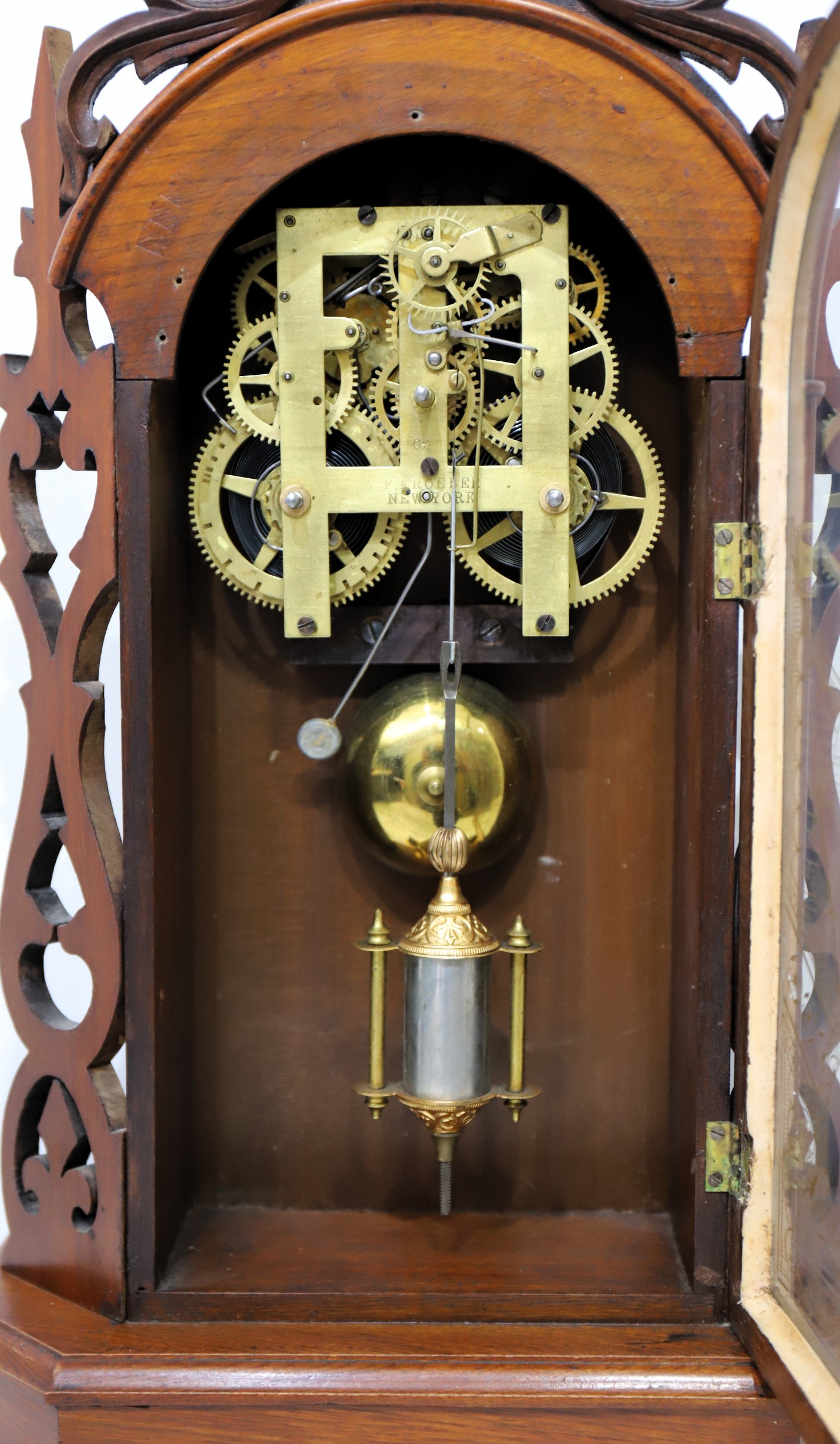 movement is signed and running, striking on a brass bell and regulated by a large single barrel pendulum. No label; shown on