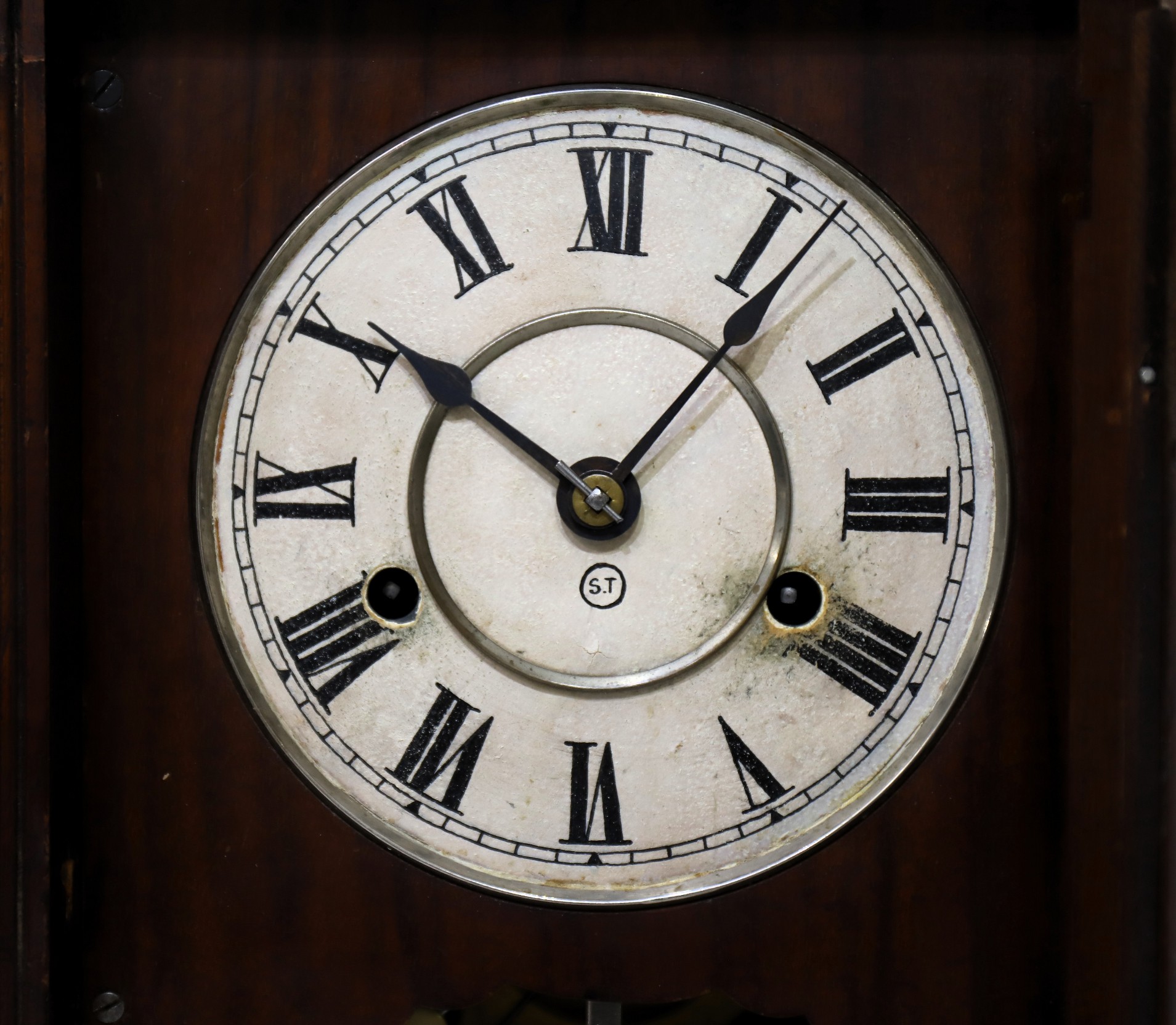 quite up to today’s standards. The hands are ST issue. The 8-day, time-and-strike ST movement is running and striking