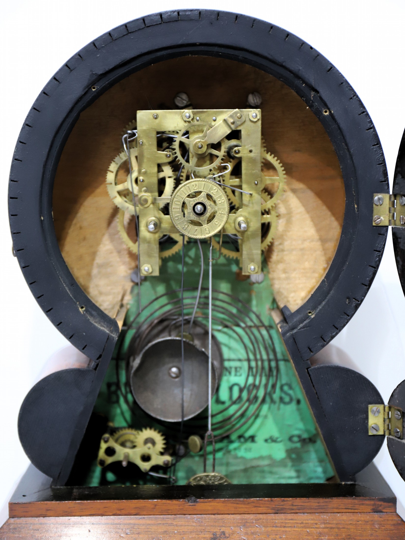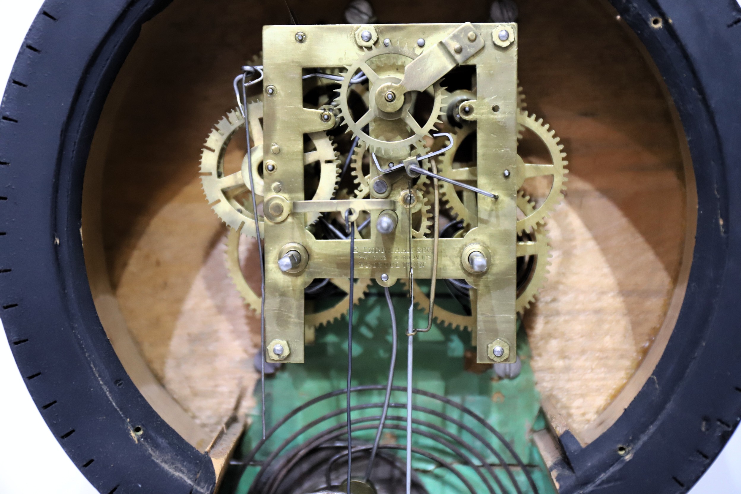 is on a new brass dial pan. The hands not quite sized correctly, but acceptable. The 30-hour time-and-strike movement