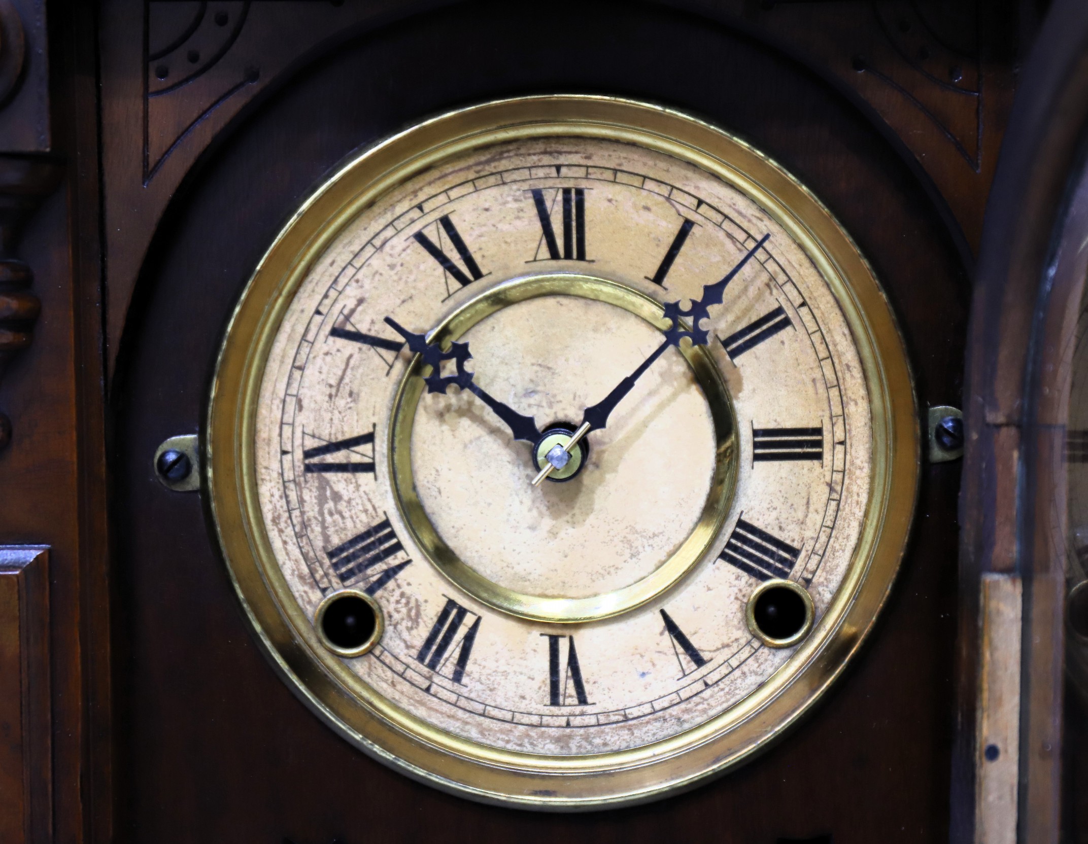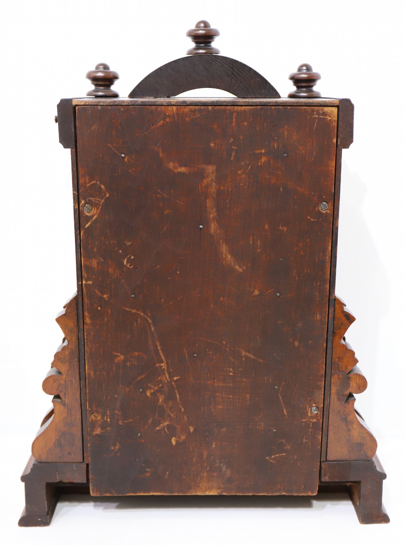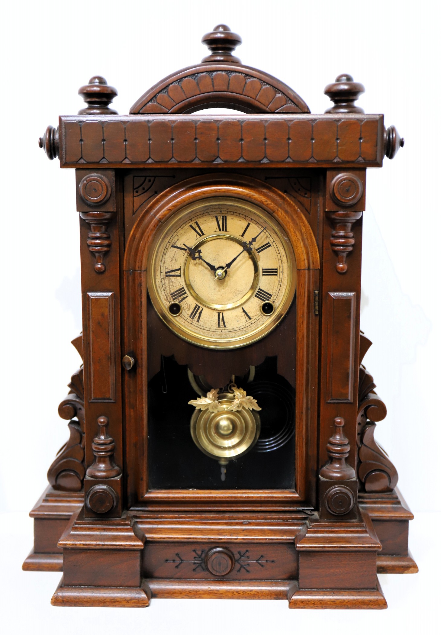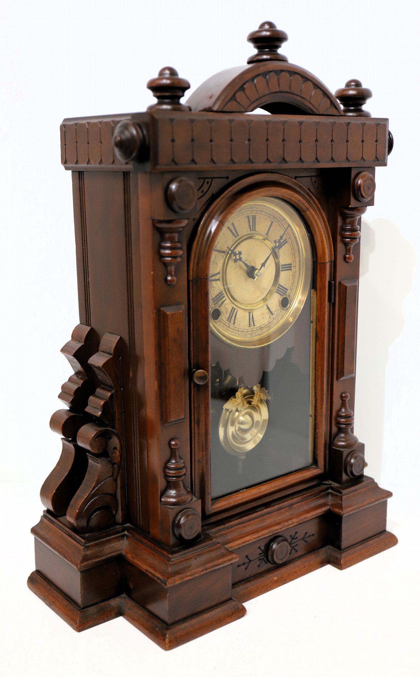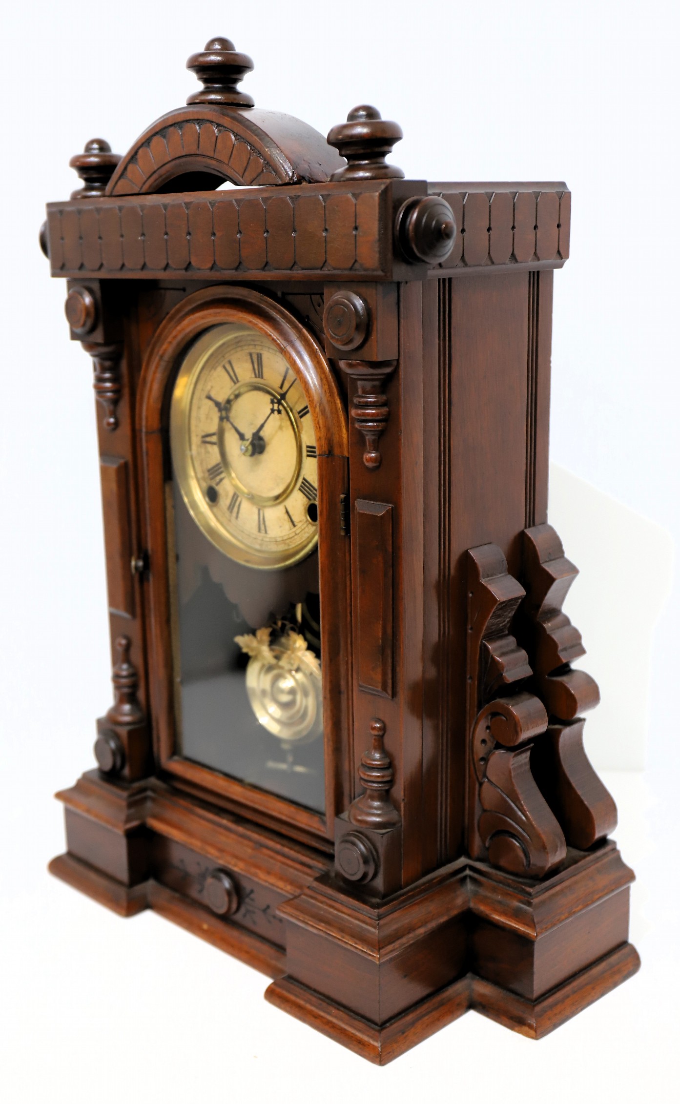 from Ingraham in this unique architectural style; the “Polished Walnut” case is 18 inches tall with a deep, rich, patinaed finish. The door glass is period, the paper dial discolored with wear, the Maltese hands as shown in the catalog illustration (Ly, Ingraham