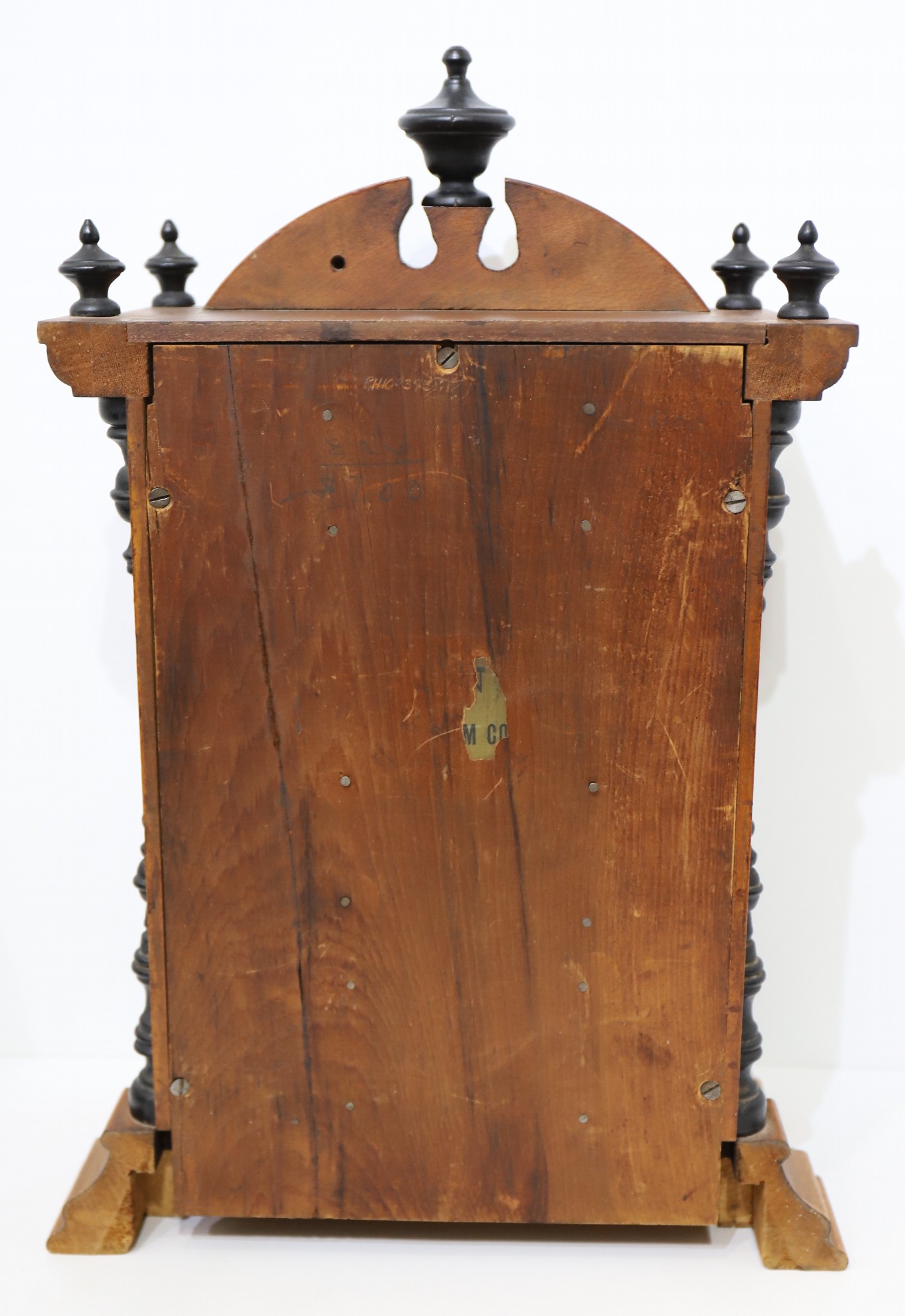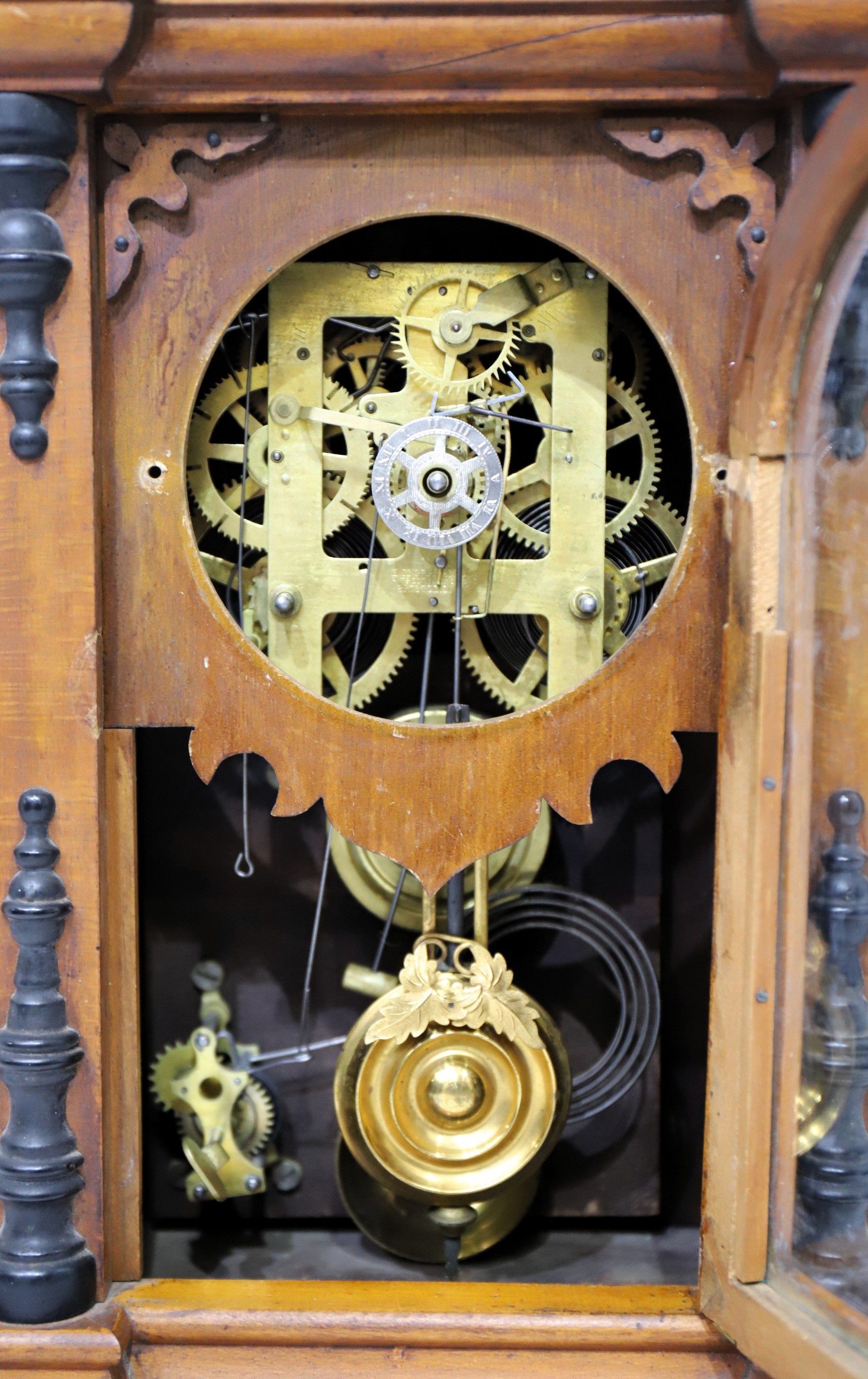 or lacquer. The door glass is old, the paper dial likely original and darkly toned, with wear. The hands are correct. The 8-day, time-and-strike movement is signed and running, striking on a cathedral gong and with a proper pendulum. This clock