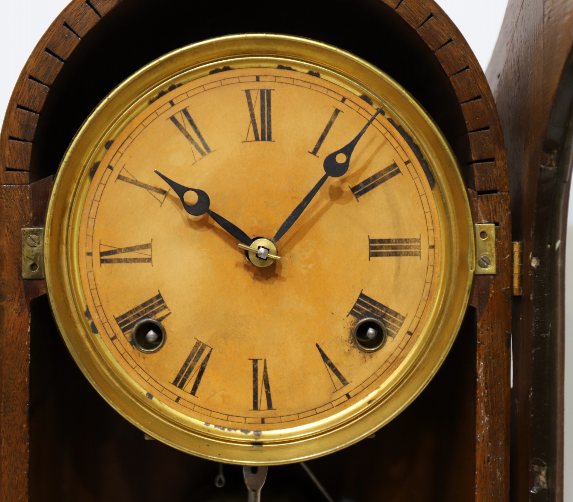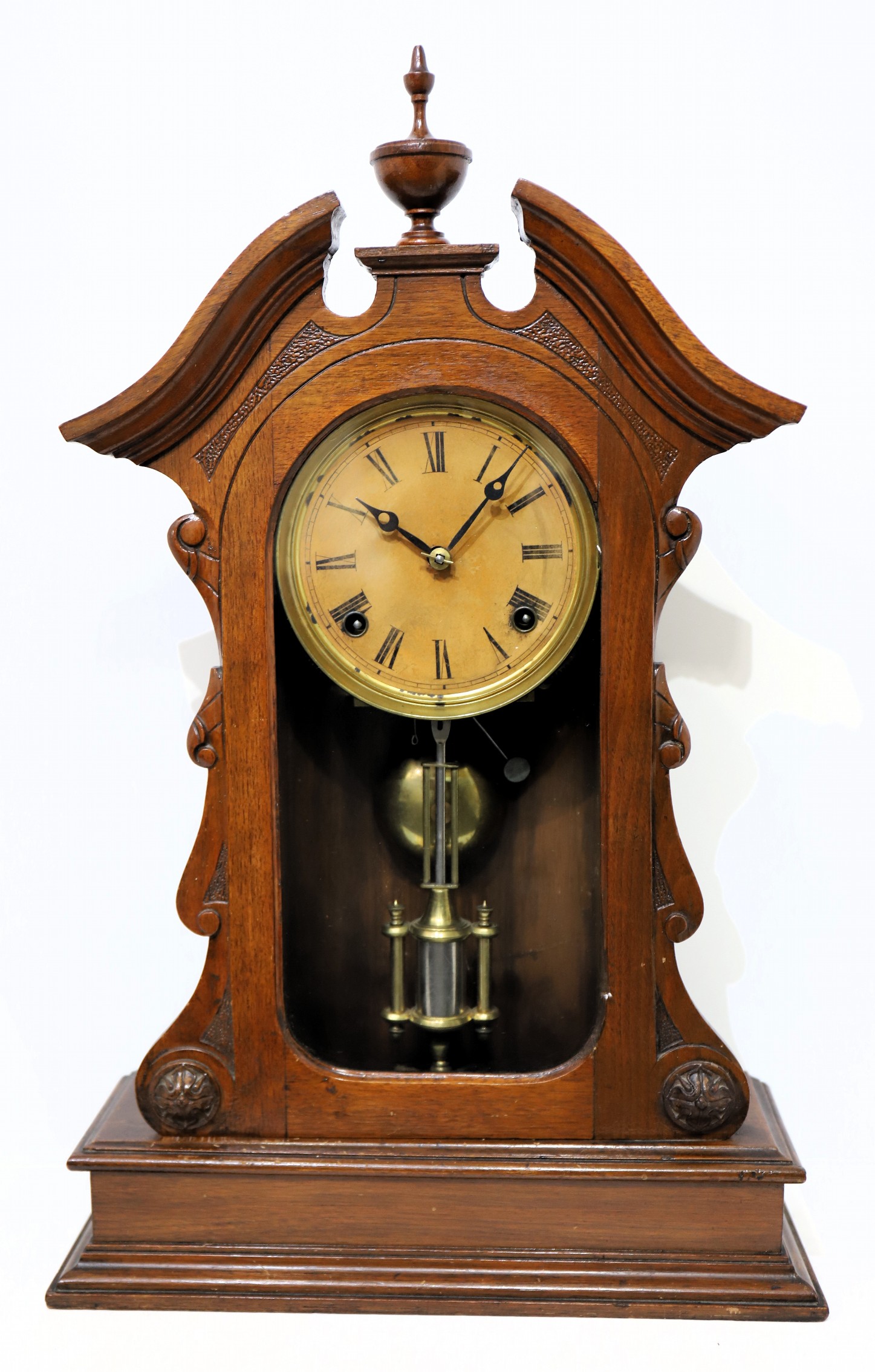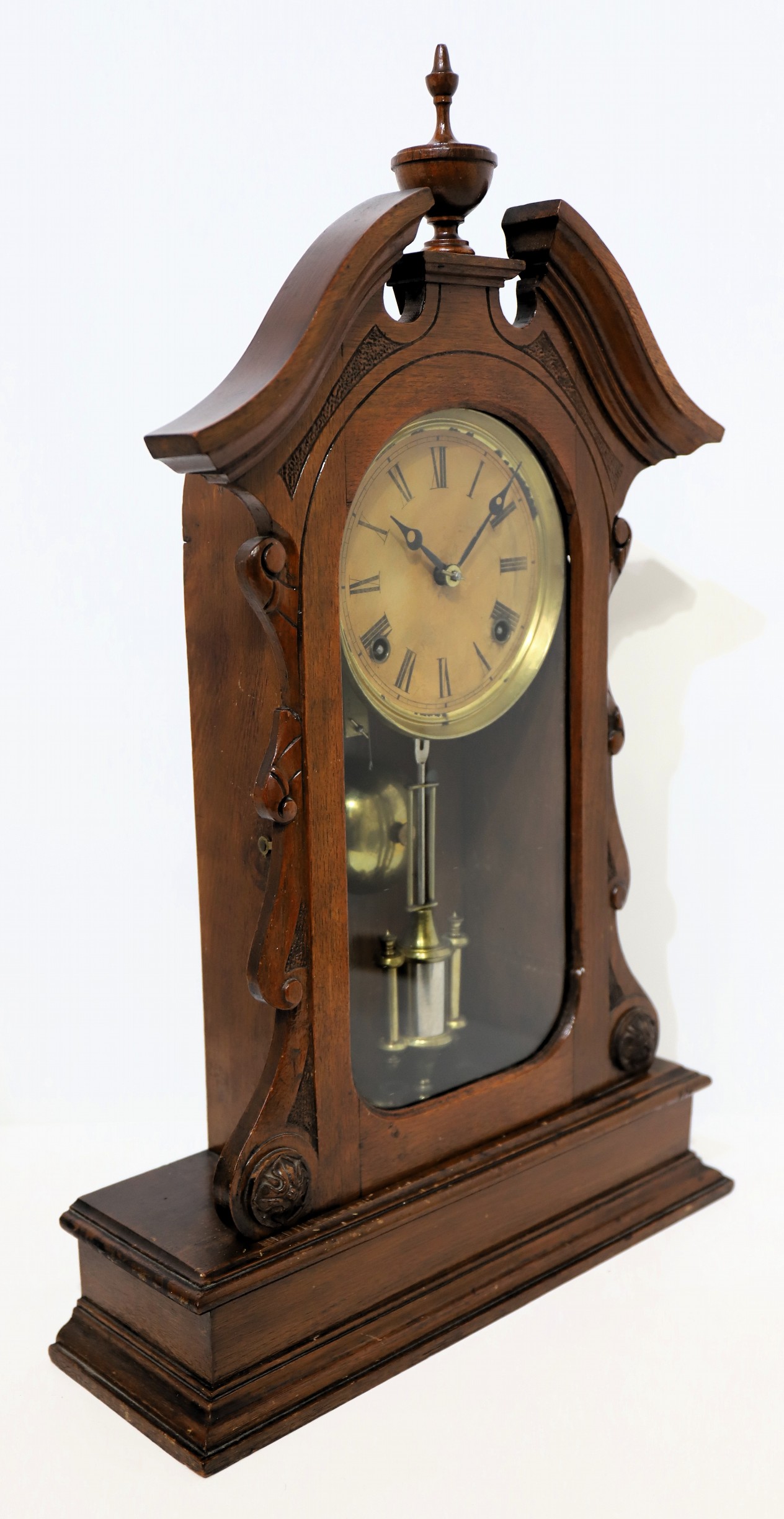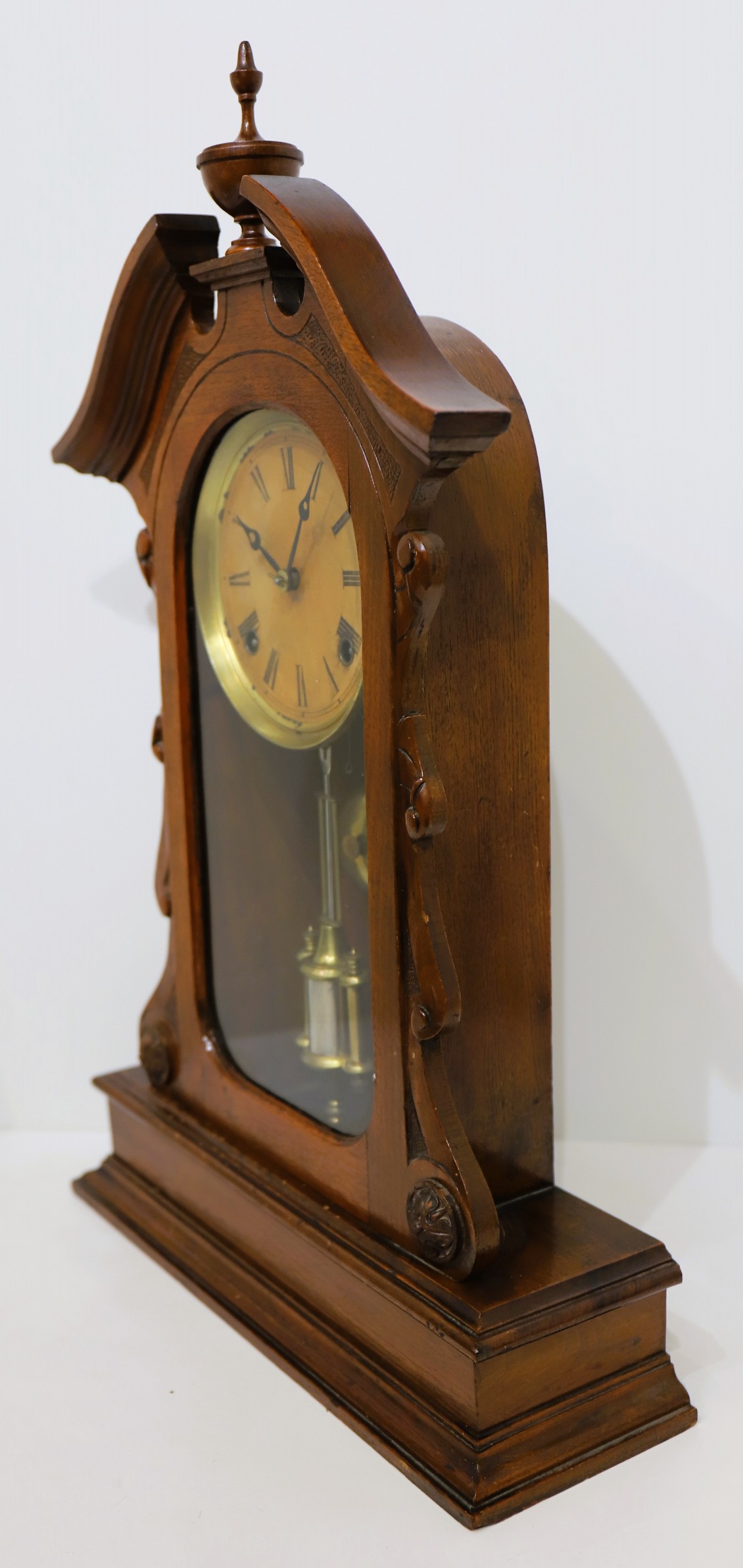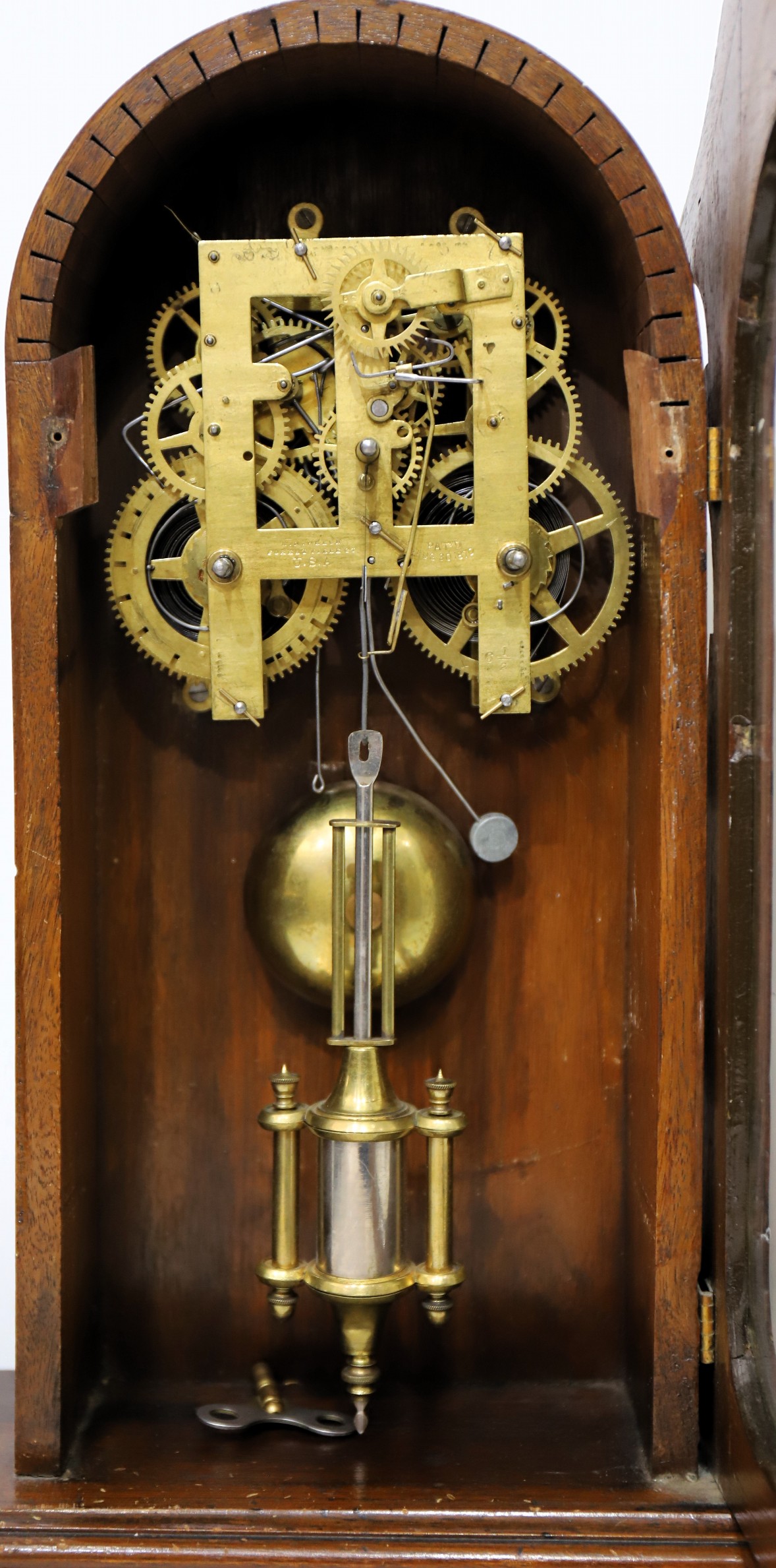 Welch, Forestville Conn and is running and striking on a brass bell; it is regulated by a single barrel pendulum. There is no
