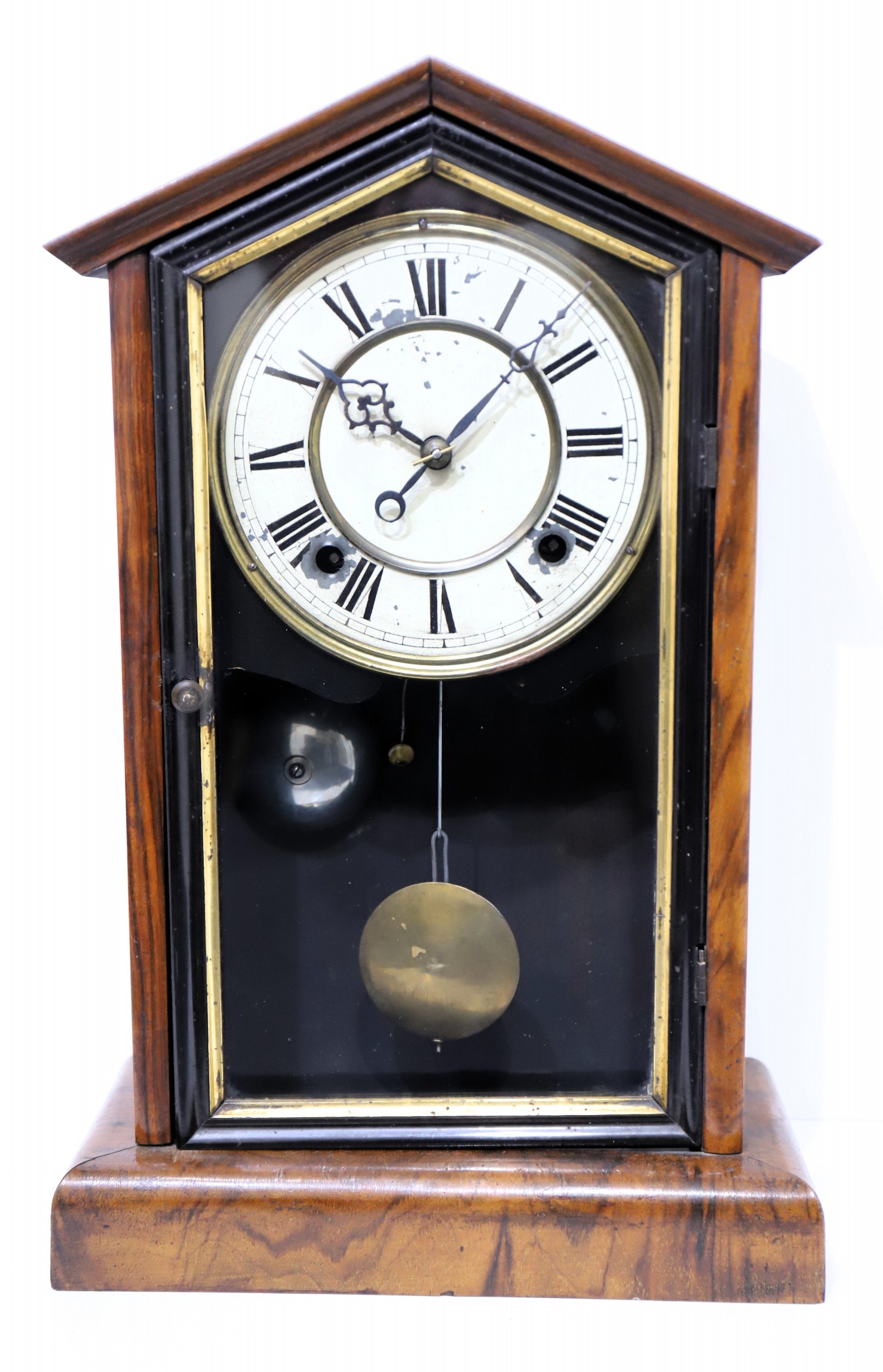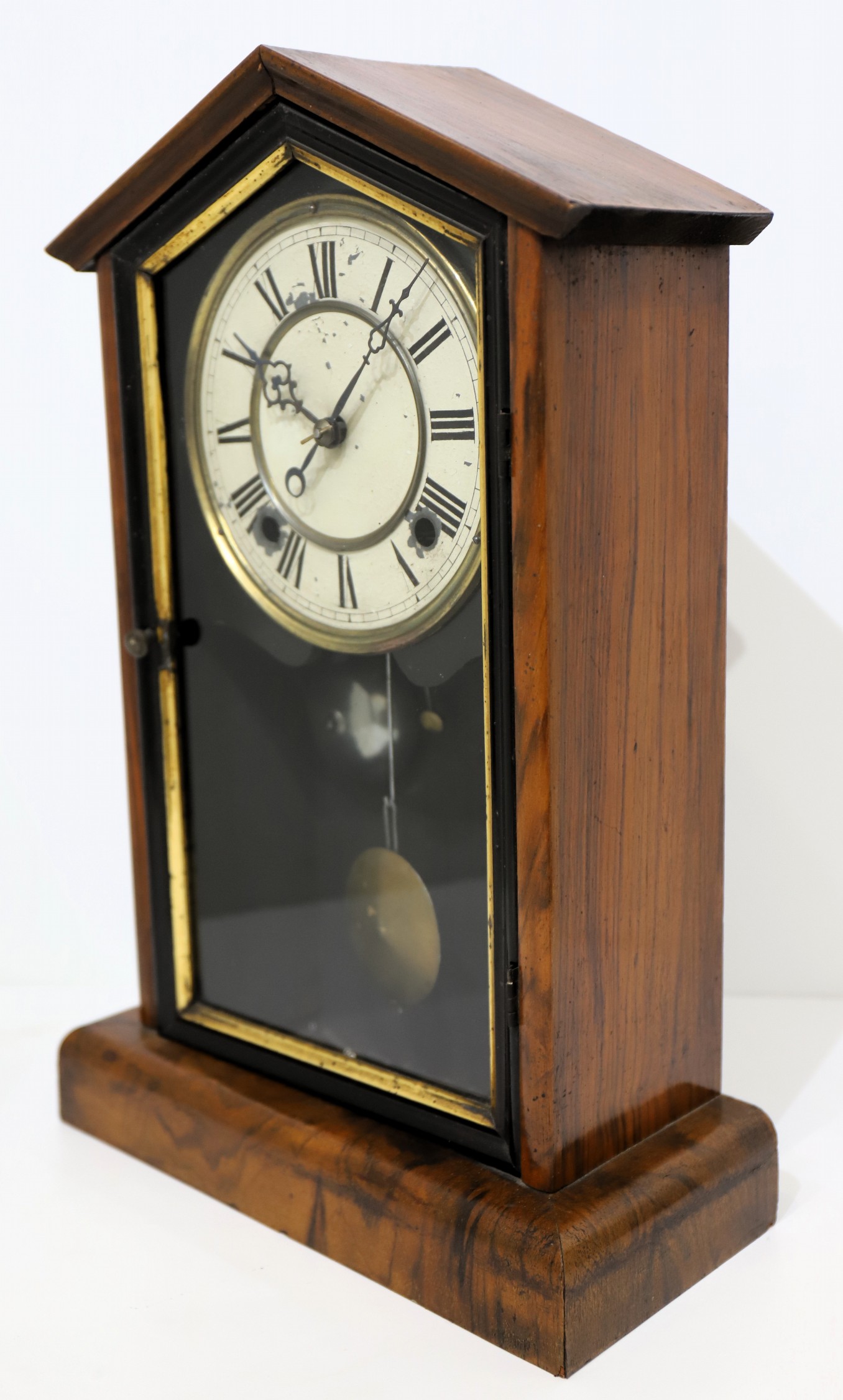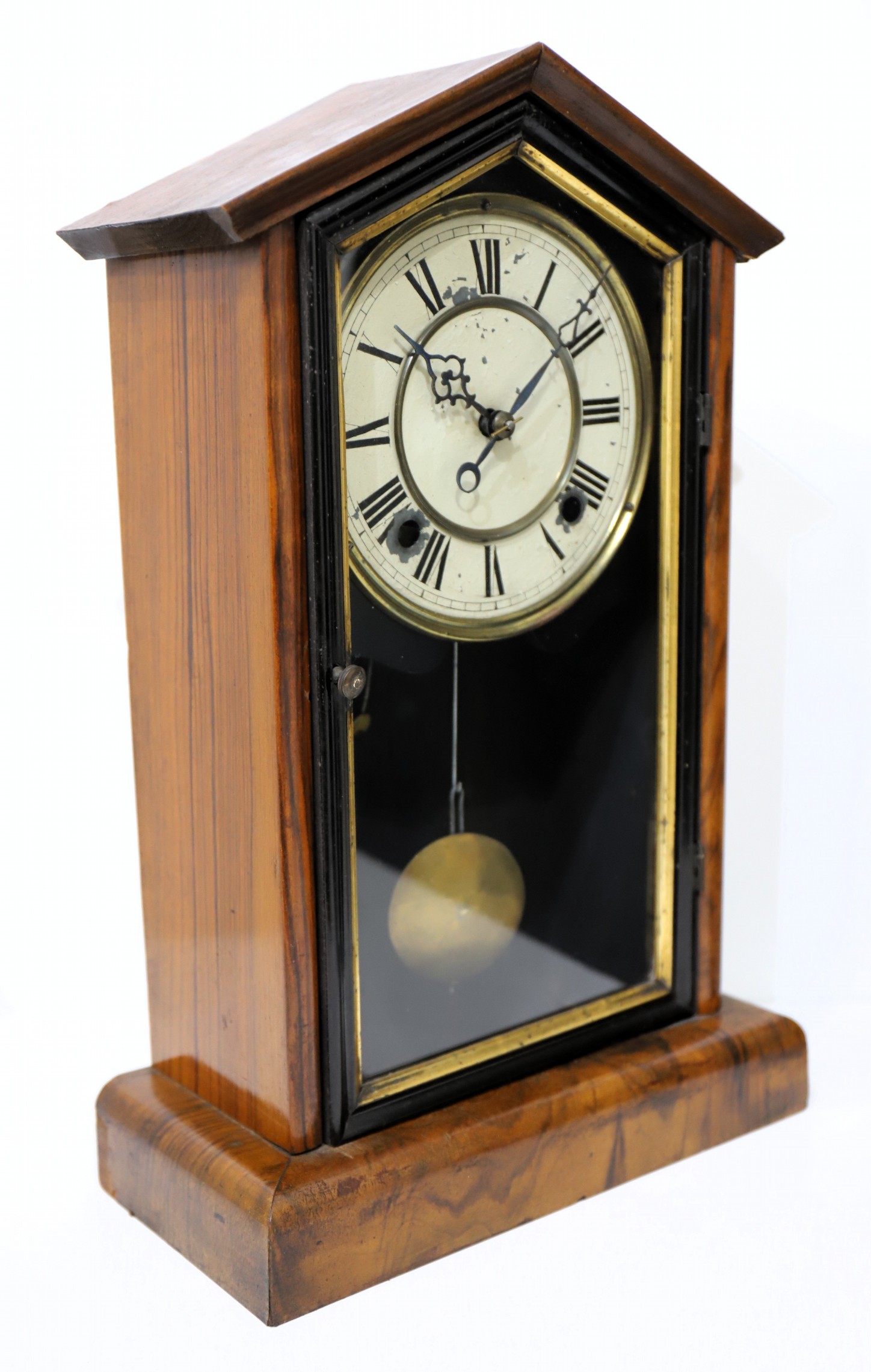veneer and a clean, polished finish. The door glass is old in a dark wood frame with gilded trim; the painted metal dial is