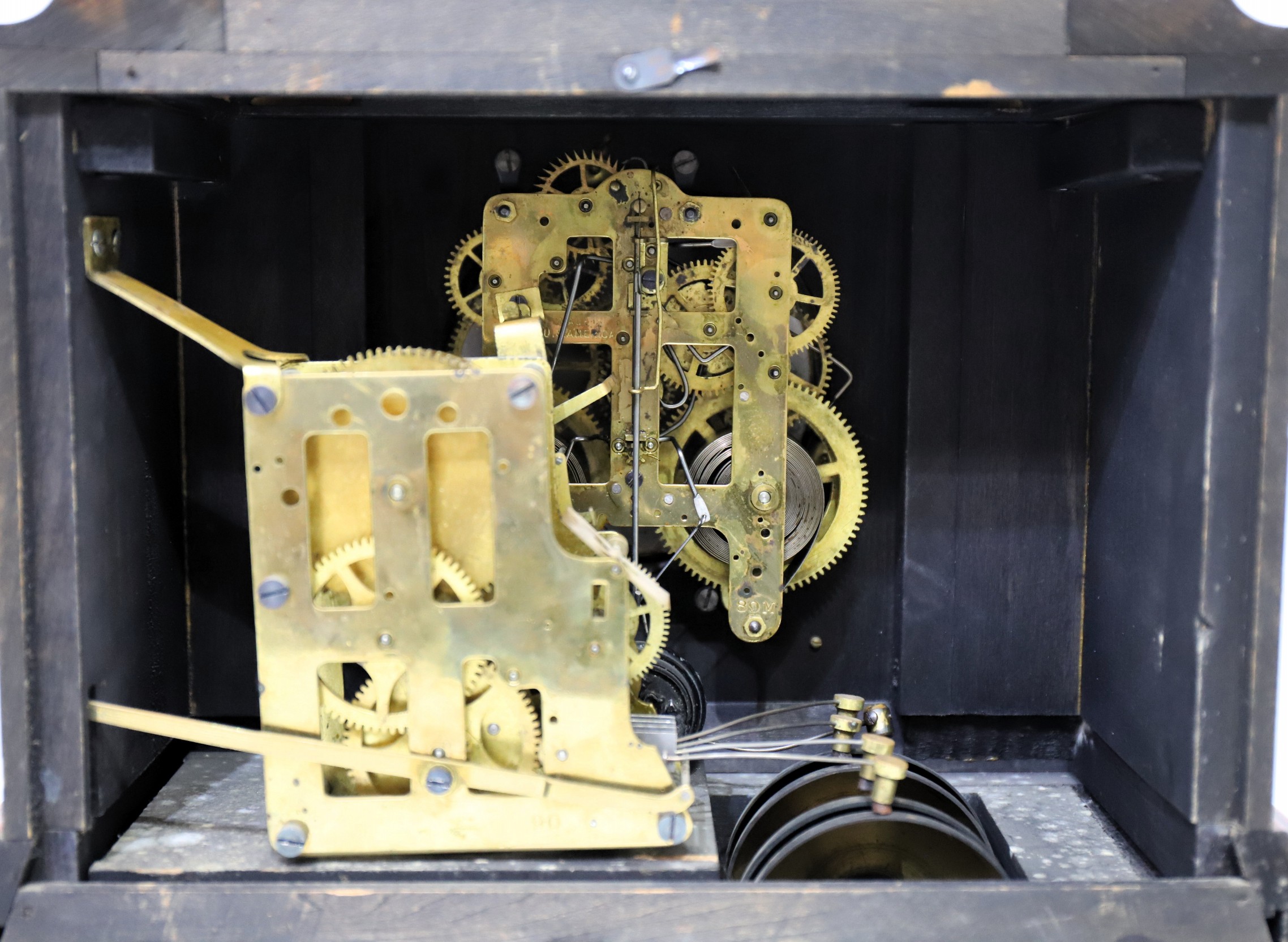 arbor is a bit difficult to access but can be accomplished by pushing it down from inside after taking off the back, a simple operation. Four-bell chimes generally sell for around $250; AAC sold a Chime Clock No. 1 in 2023 for $228. $200–$300.