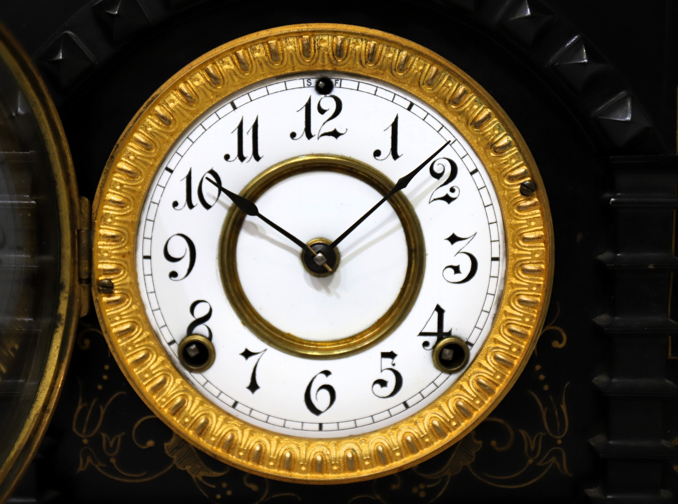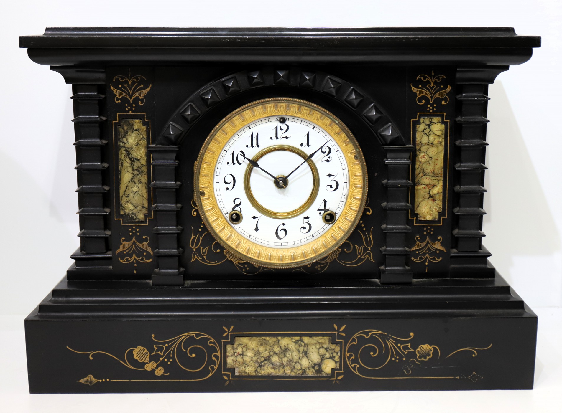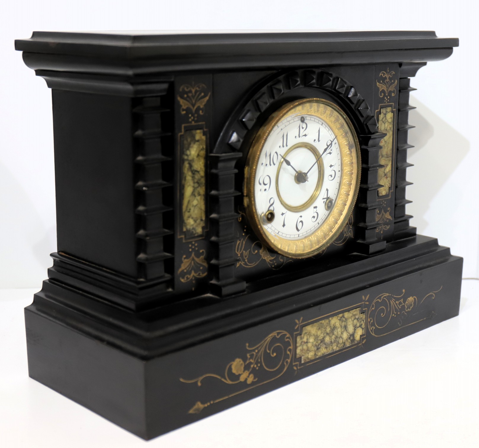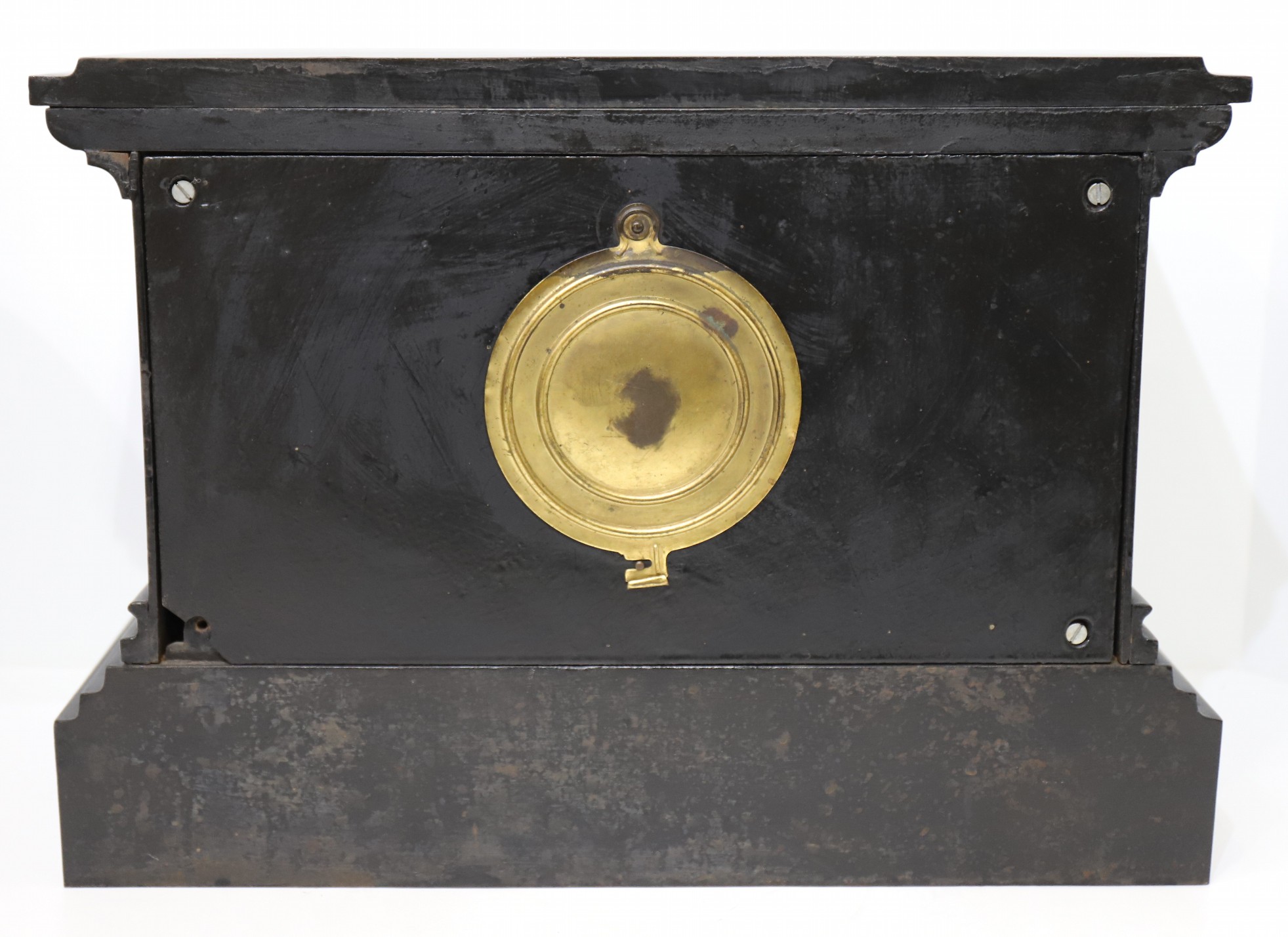 enameled iron-case clock from the company that loved black mantel clocks. The case is almost 17 inches wide by 12 inches tall