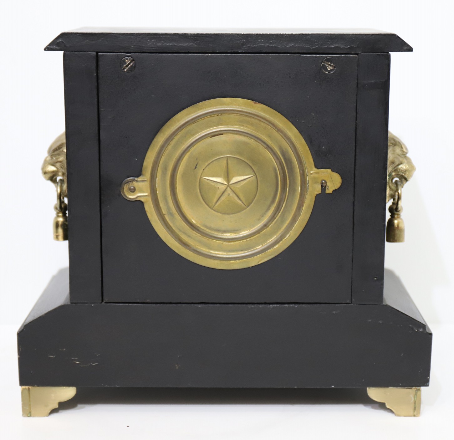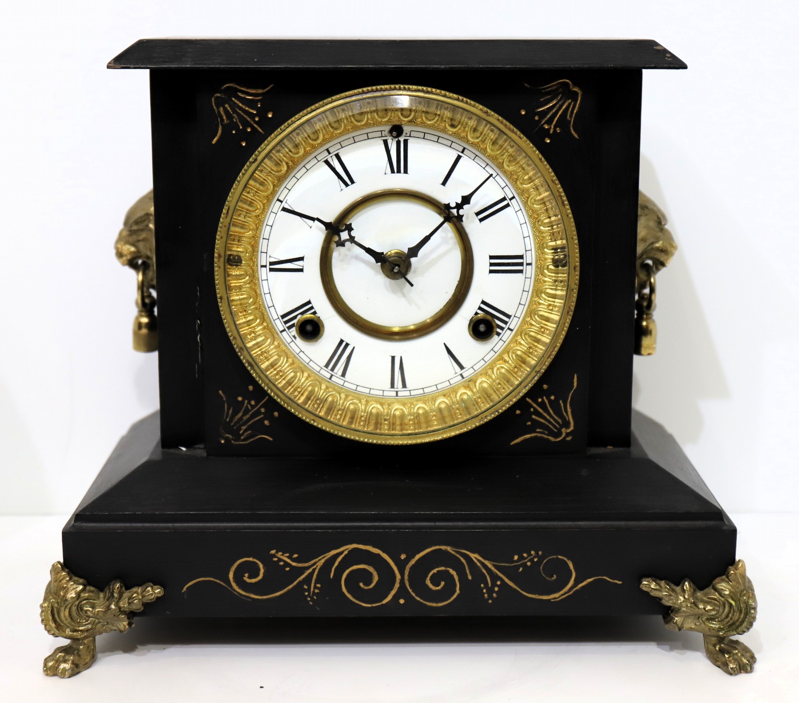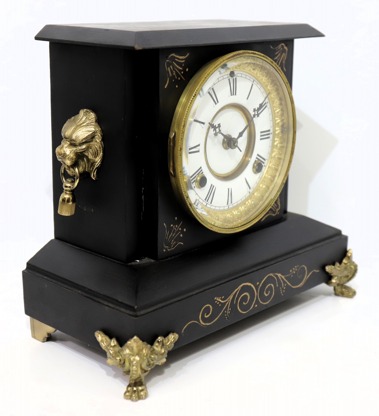 Waterbury Clock Co. “Atlas” enameled iron case, ca. 1893. A 10-inch tall (11.5 inches wide) cast iron case that has been repainted, with polished brass lion’s head side ornaments and feet. The brass bezel is bright with a beveled flat glass over a porcelain dial and replacement hands. The 8-day, time-and-strike