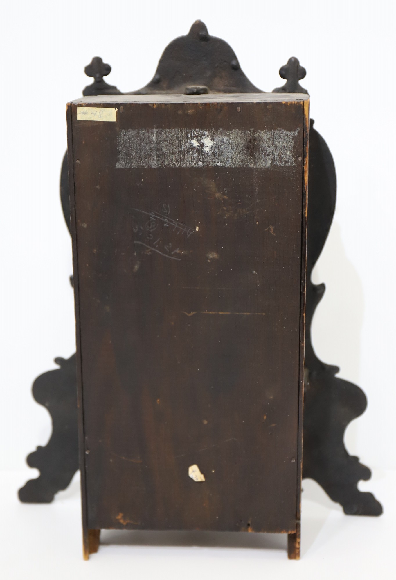 paper dial badly yellowed, and the hands are acceptable but not original. The 30-hour time-and-strike movement is unsigned;