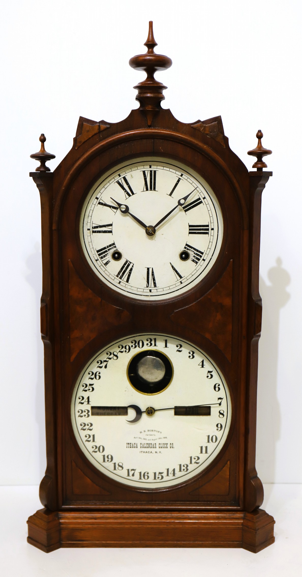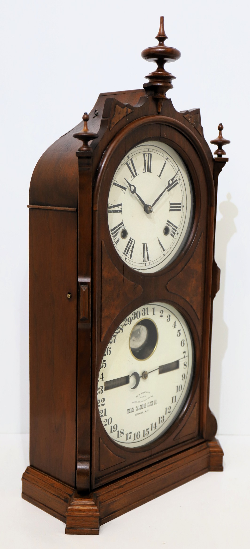 uncommon Ithaca in all-original condition. The 24-inch walnut case is clean, the finials are proper but may be replacements.