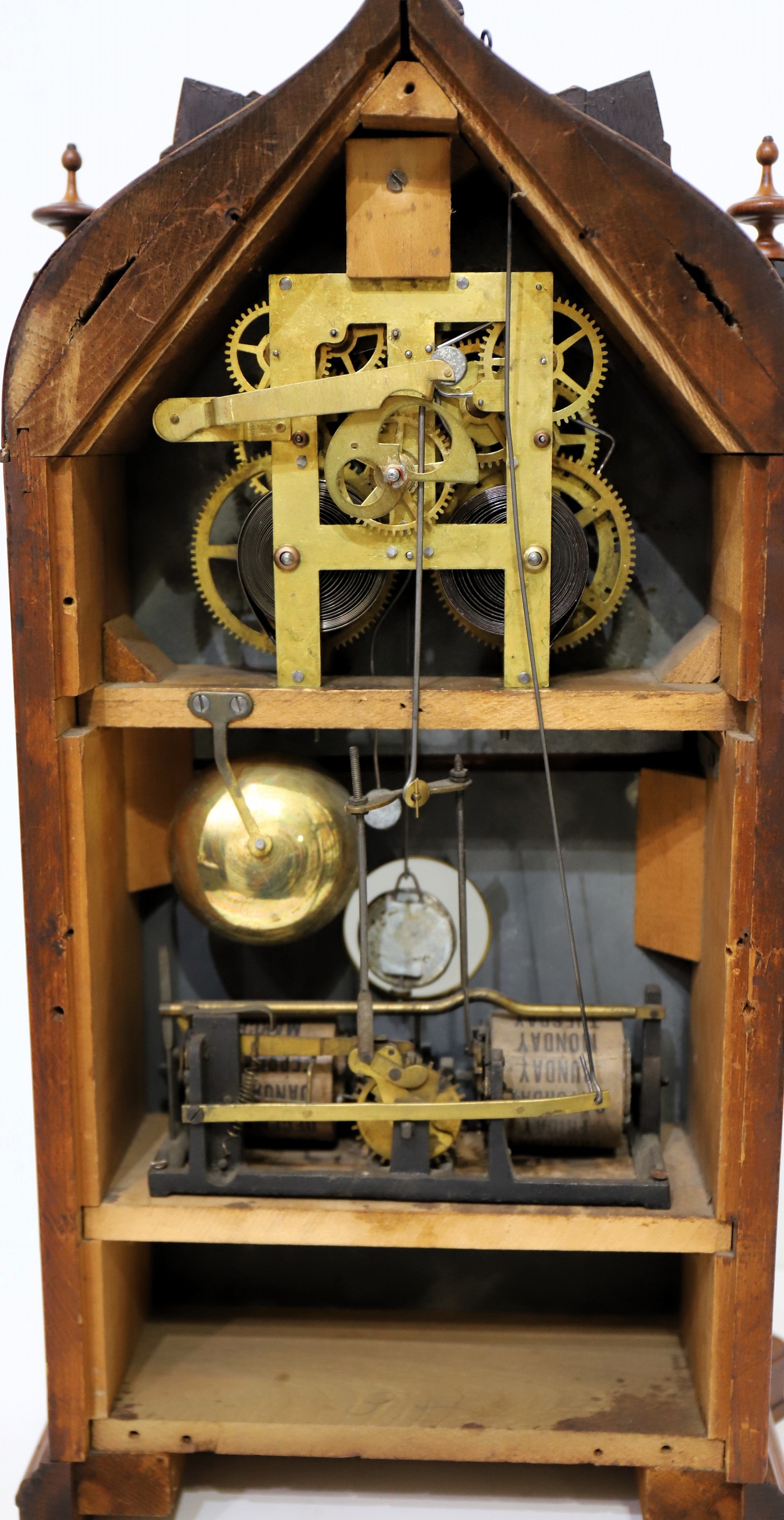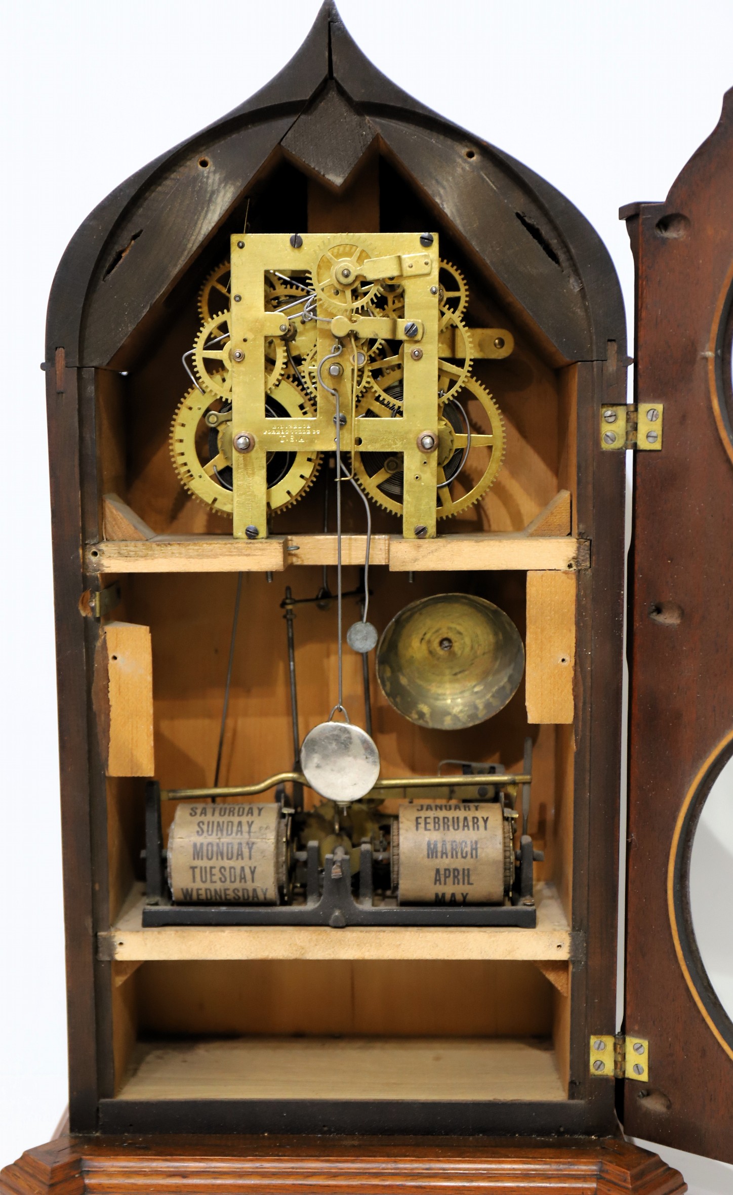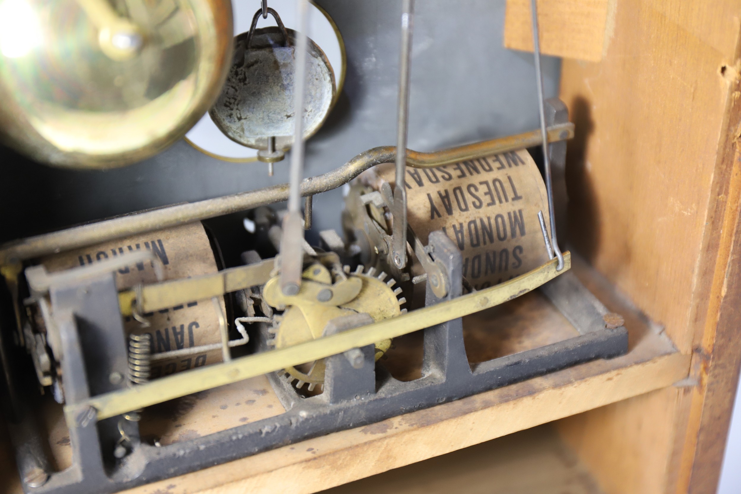 is running and striking on a brass bell, regulated by a proper nickel pendulum bob; the calendar date hand is advancing, but the weekday