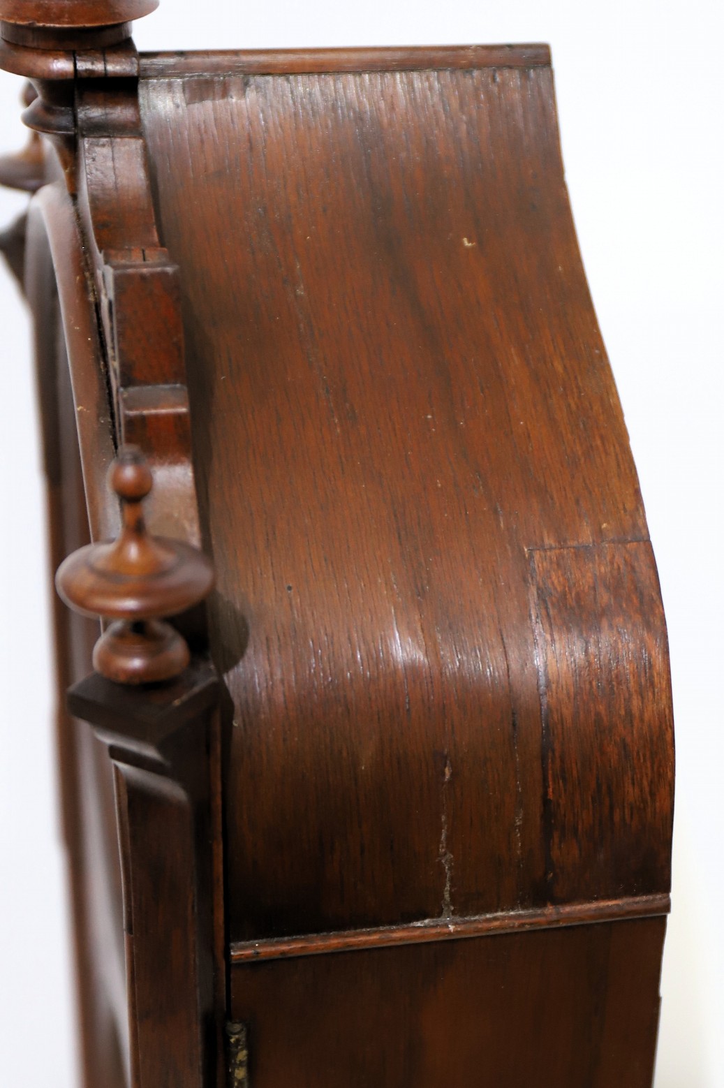 There is a repair to the veneer on the top right side. The burl on the front indicates it is a later edition, replacing the