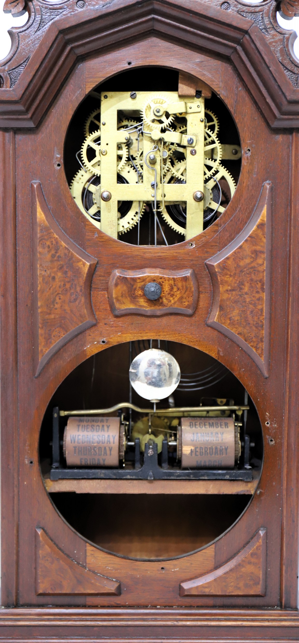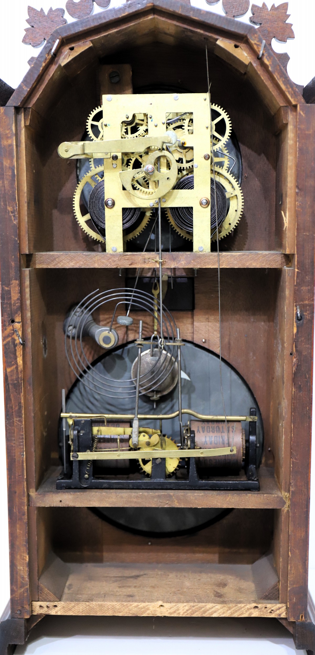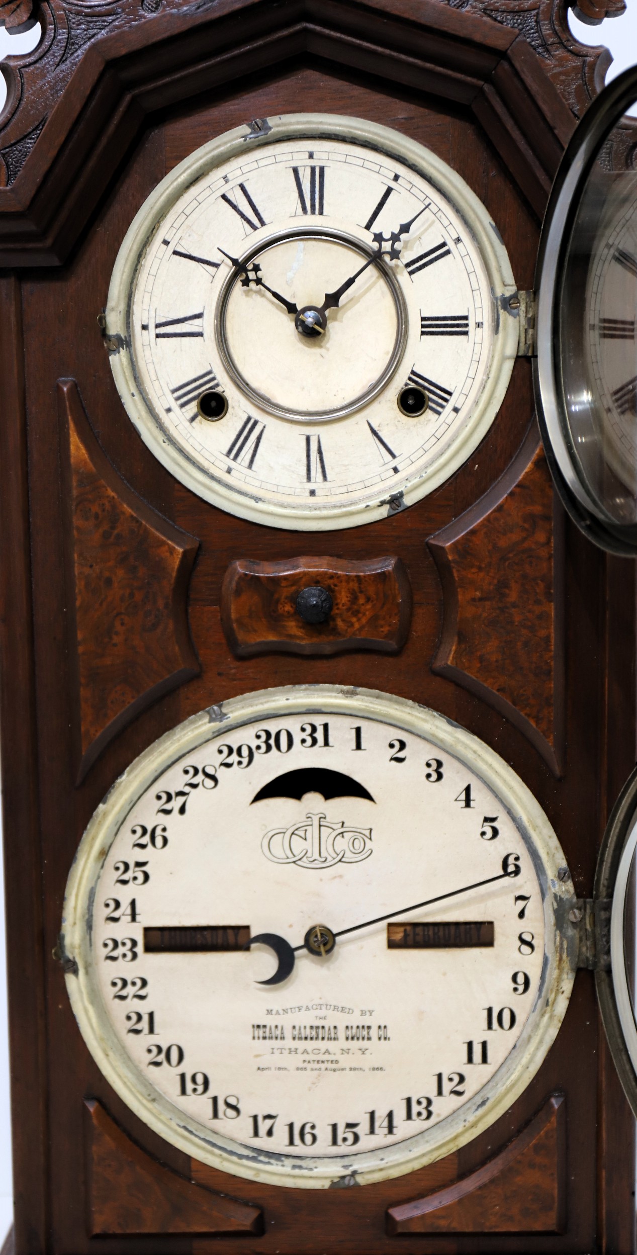 extensions, and the gong is the early wire type (see Warren, Ithaca’s Clock Makers, page 112). The walnut case is