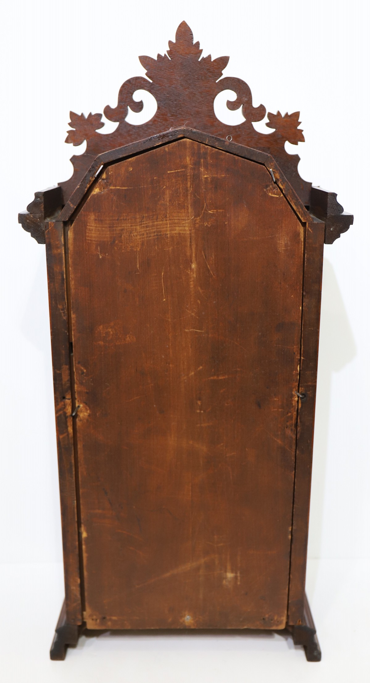 is an early version of the Shelf Library: the Welch movement is mounted with seat hooks, the carved crest is mounted without case