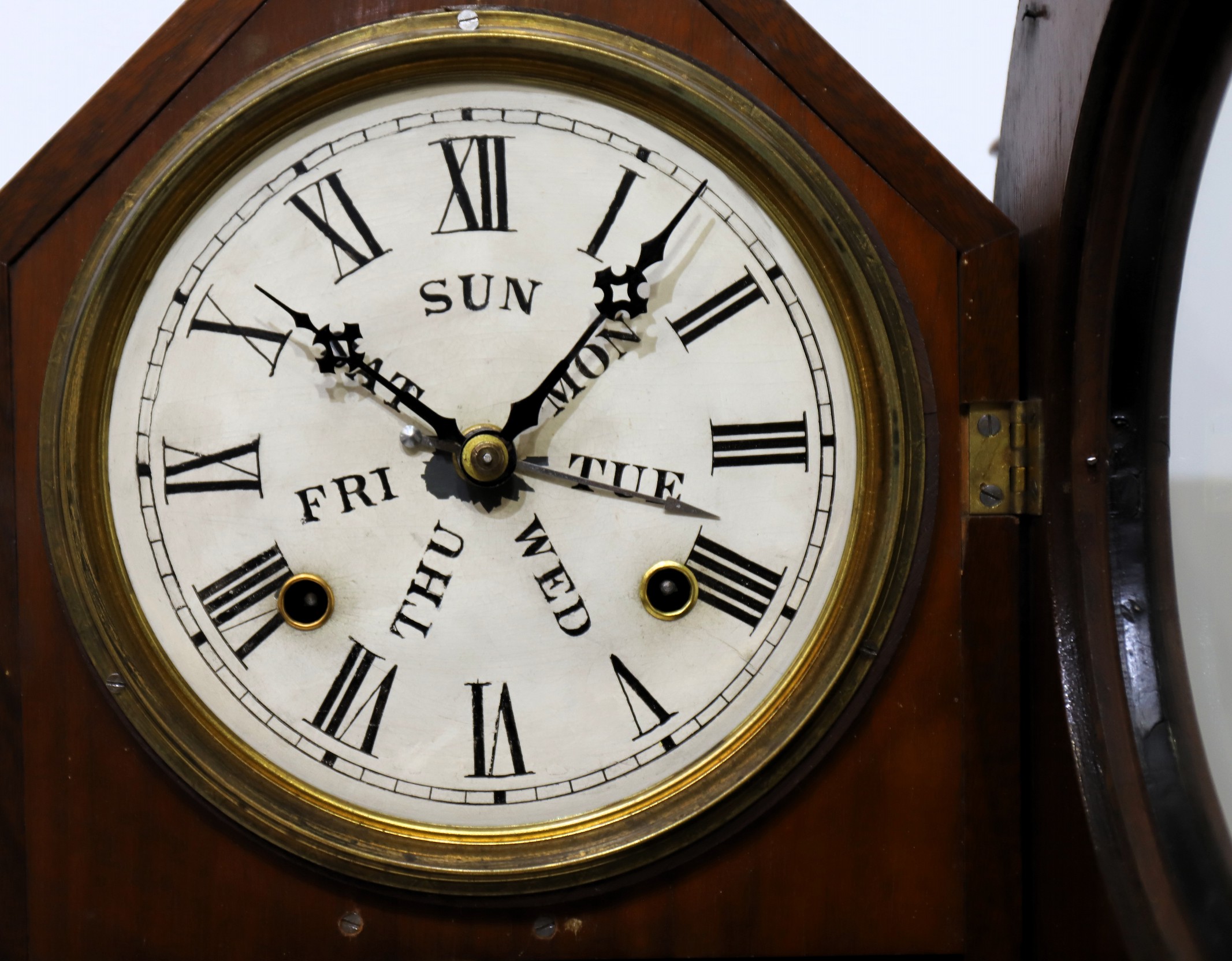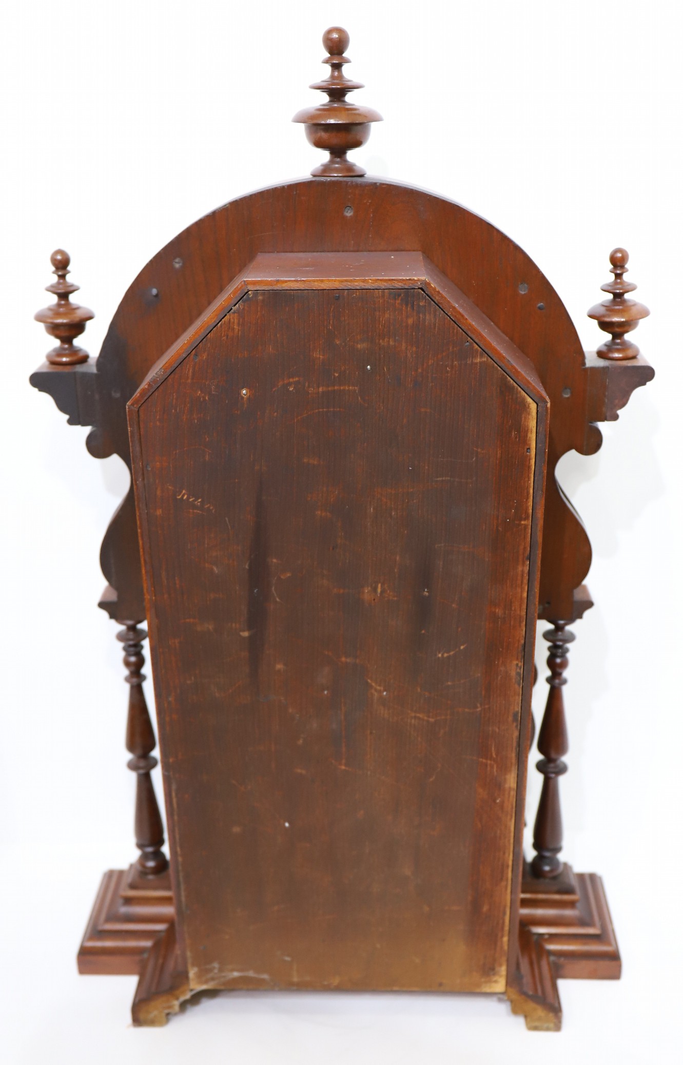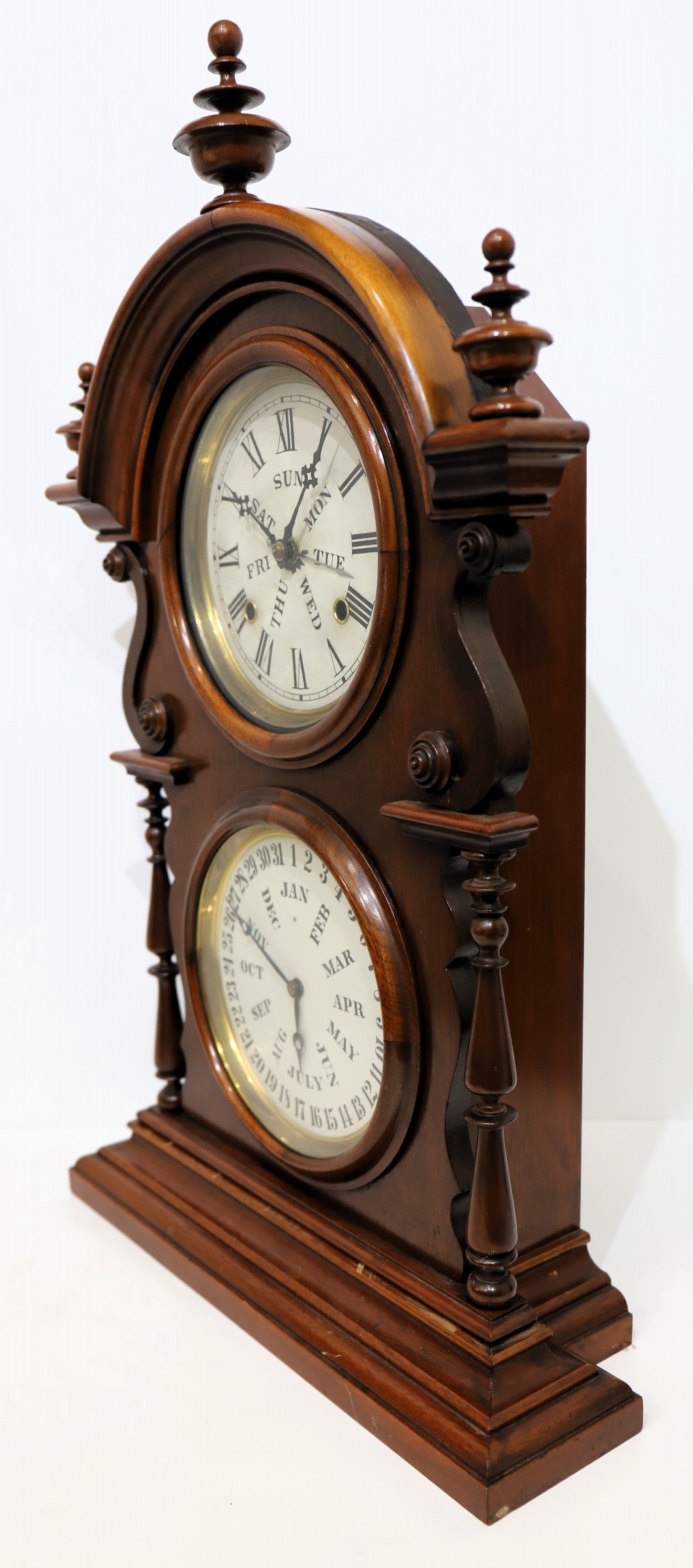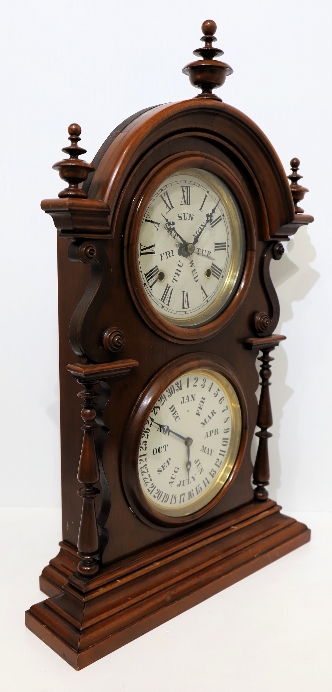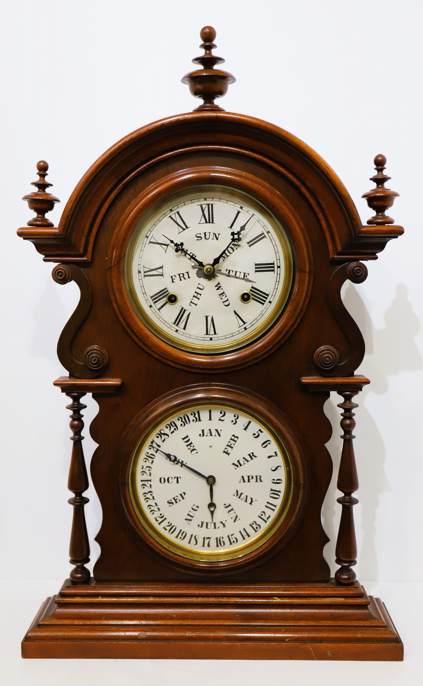 Welch, Spring & Co. “Wagner Mantel B.W.”, ca. 1878. More common as a wall clock, the shelf version of this calendar clock is 26 inches tall with a clean, polished finish and light patina. The dial glasses are likely original, the painted dials as well, with some strengthening to the numbering on the time dial. The hands on the time dial are replacements. The 8-day, time-and-strike movement is signed but the die-stamp is obscured by