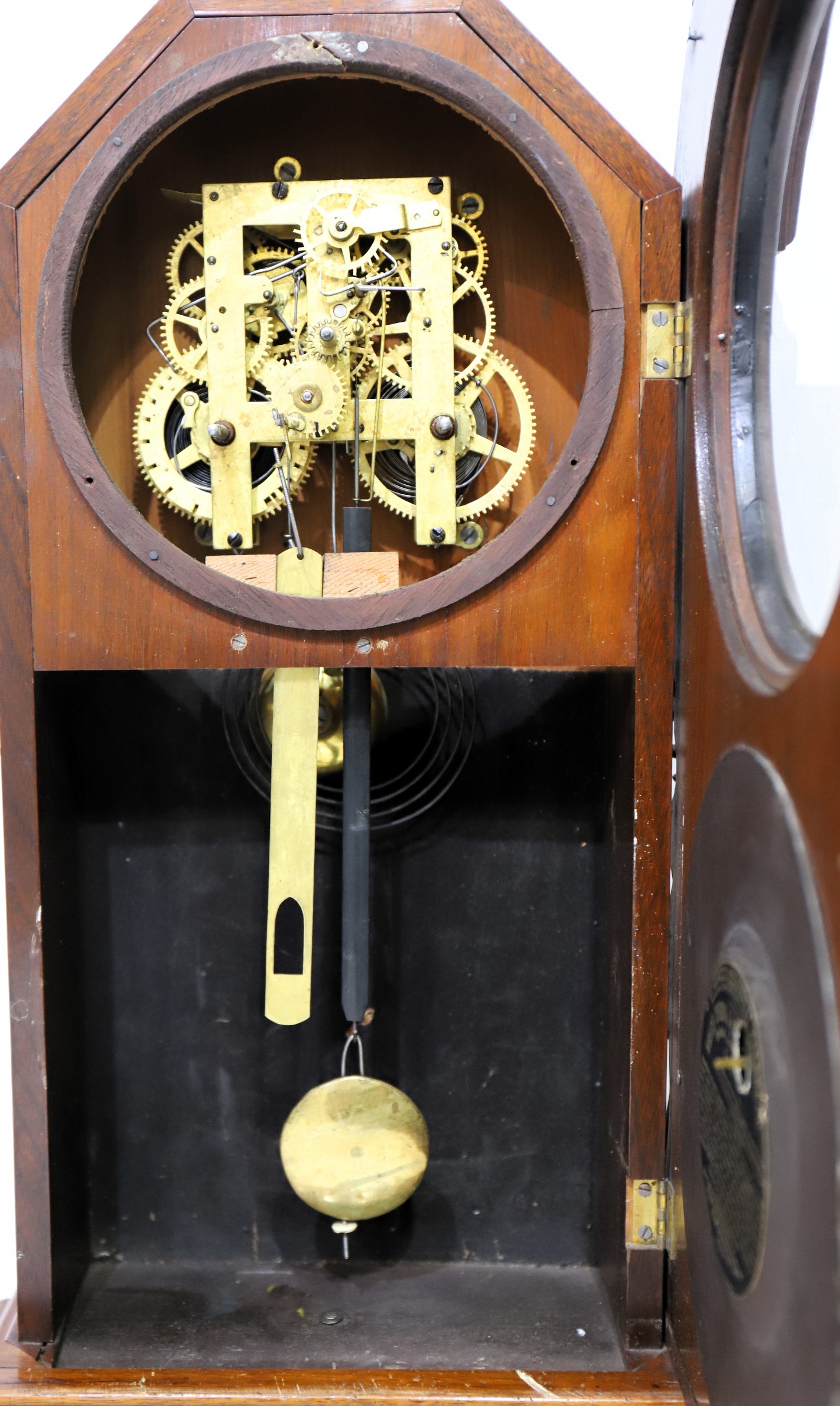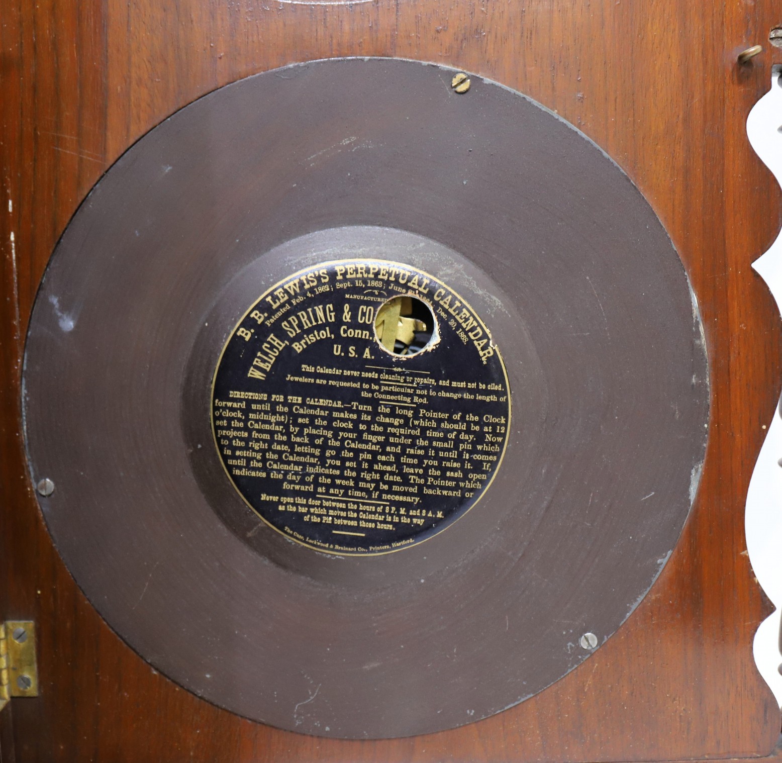 the calendar wheel; it is running and striking on a wire gong. There is a B.B. Lewis label on the calendar mechanism cover;