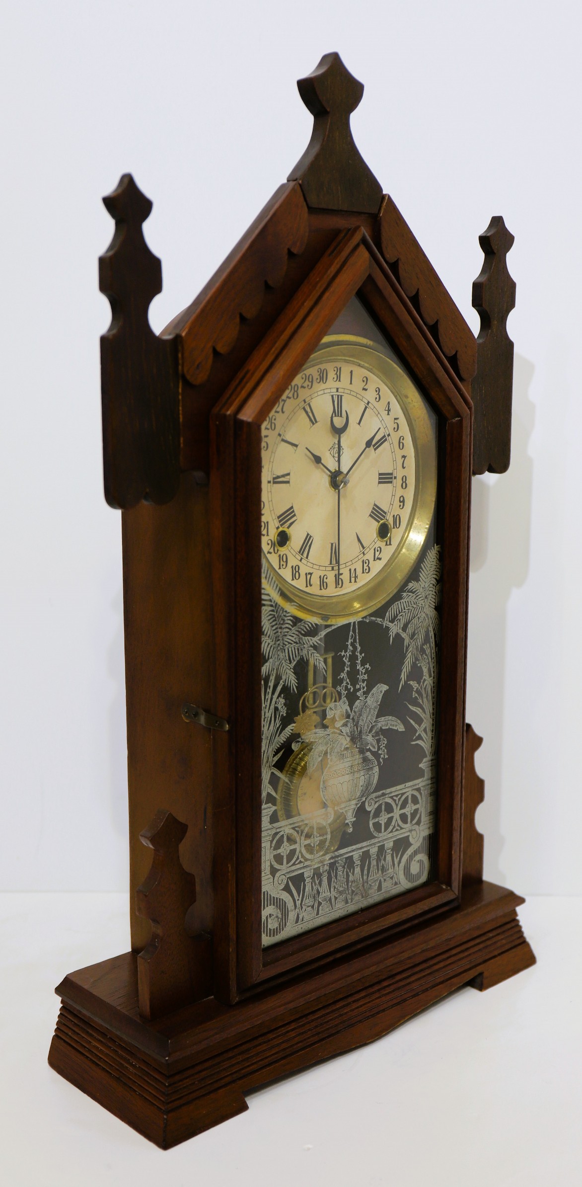 an old finish. The door glass is period/original, the paper dial is yellowed and has the Ansonia logo. The hands are period