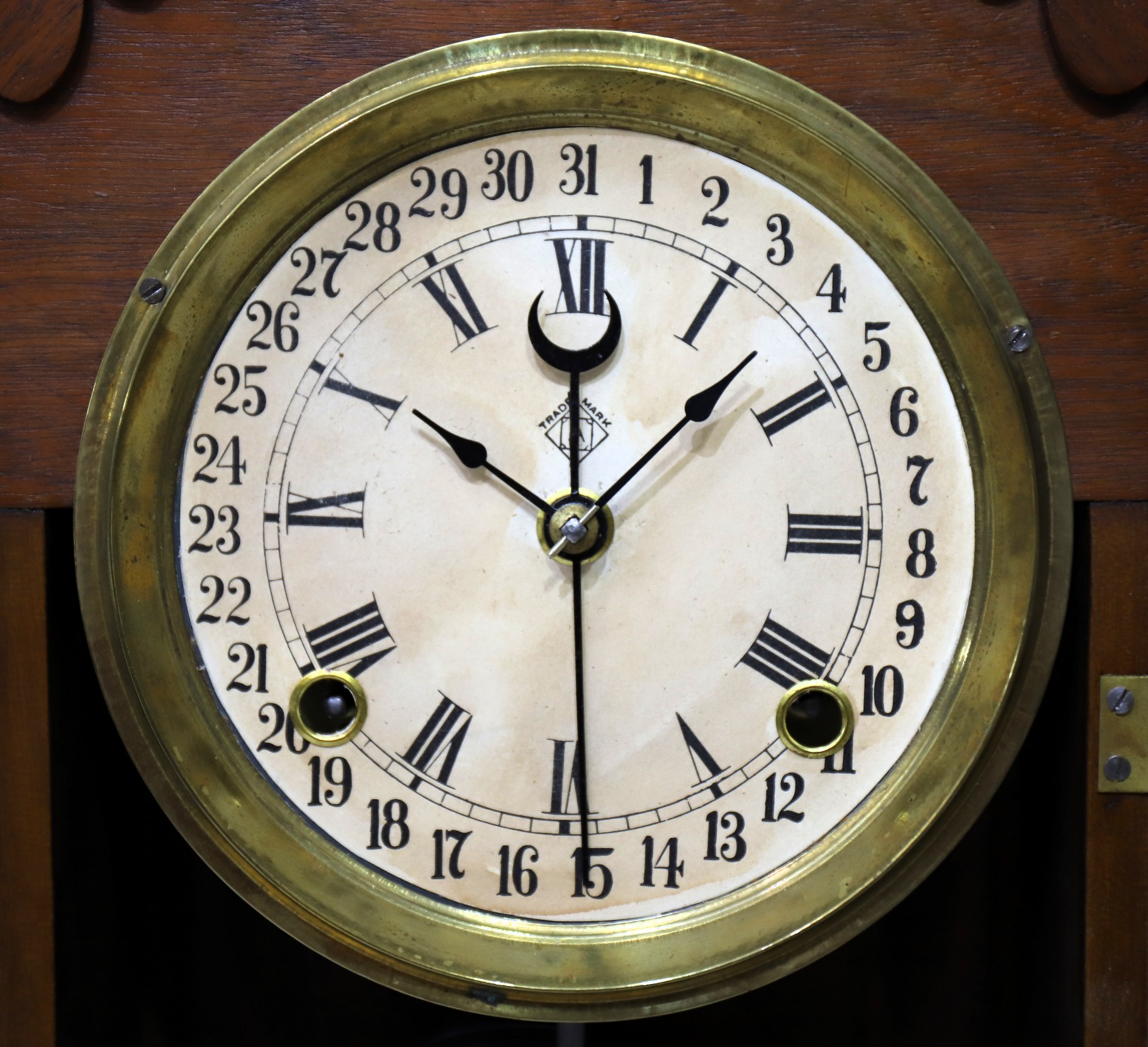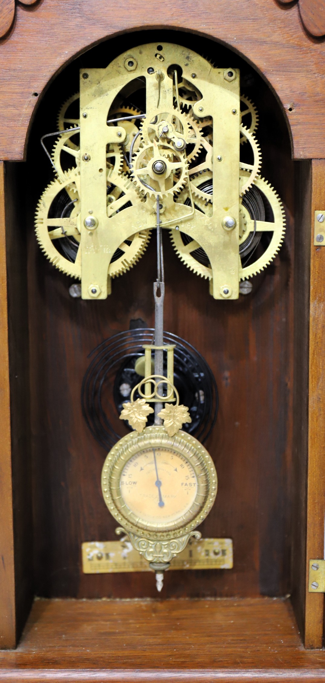 but the calendar hand is advancing with each hour and will need adjustment. There is a fancy Ansonia dial-indicator pendulum,