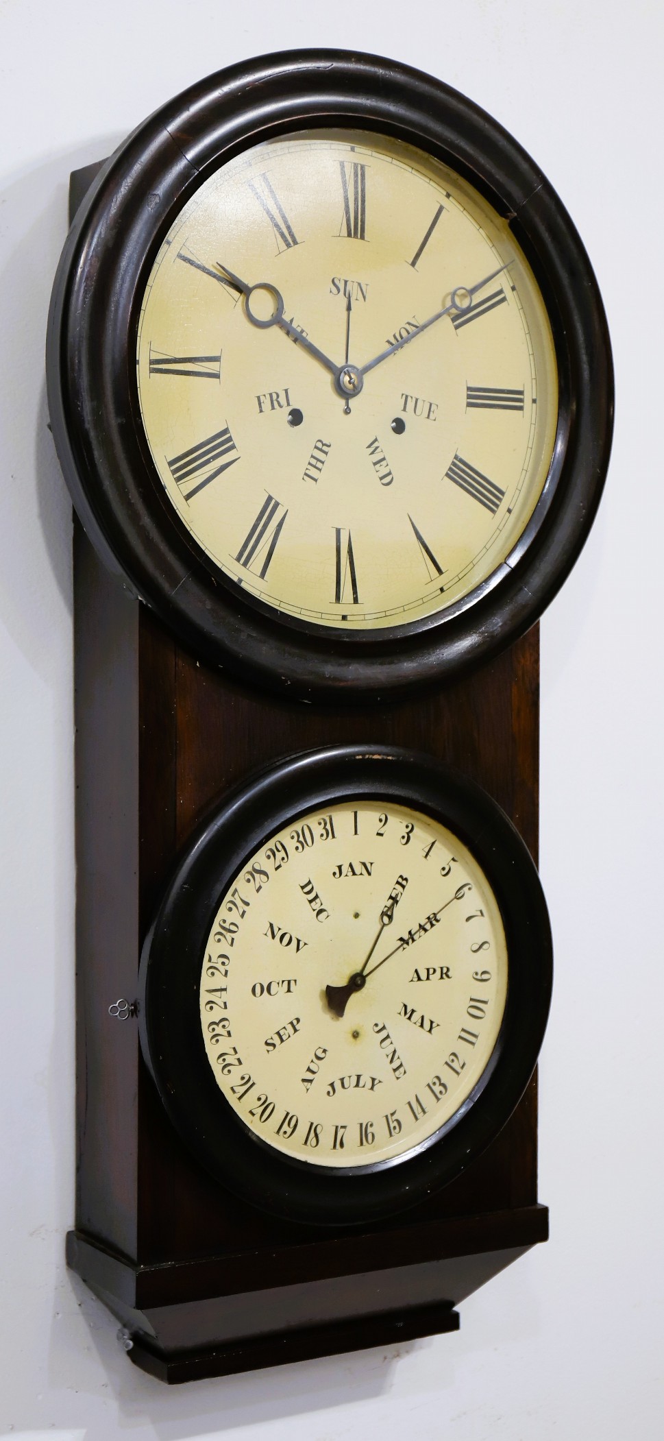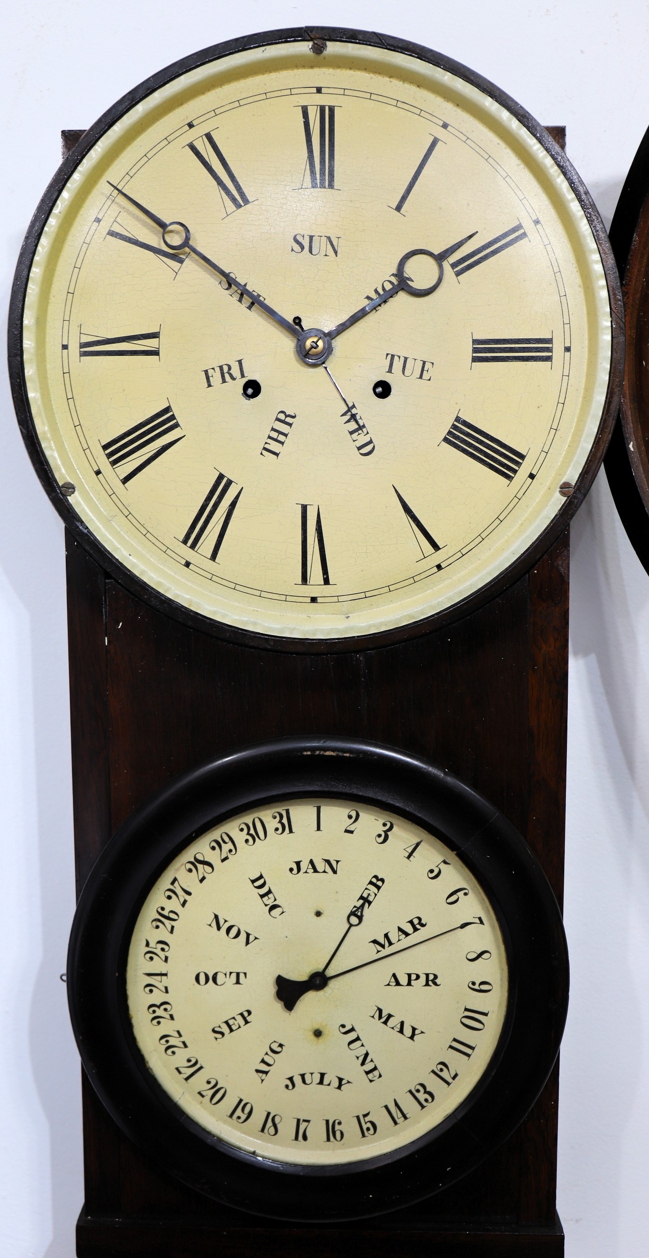 calendar clock is 30.5 inches long, veneered in mahogany with an old, dark finish. Carter calendar clocks are confusing