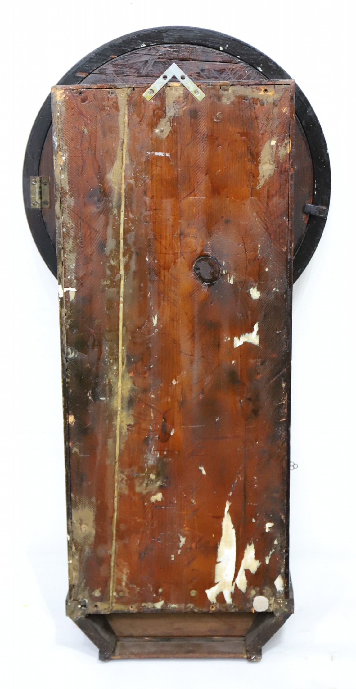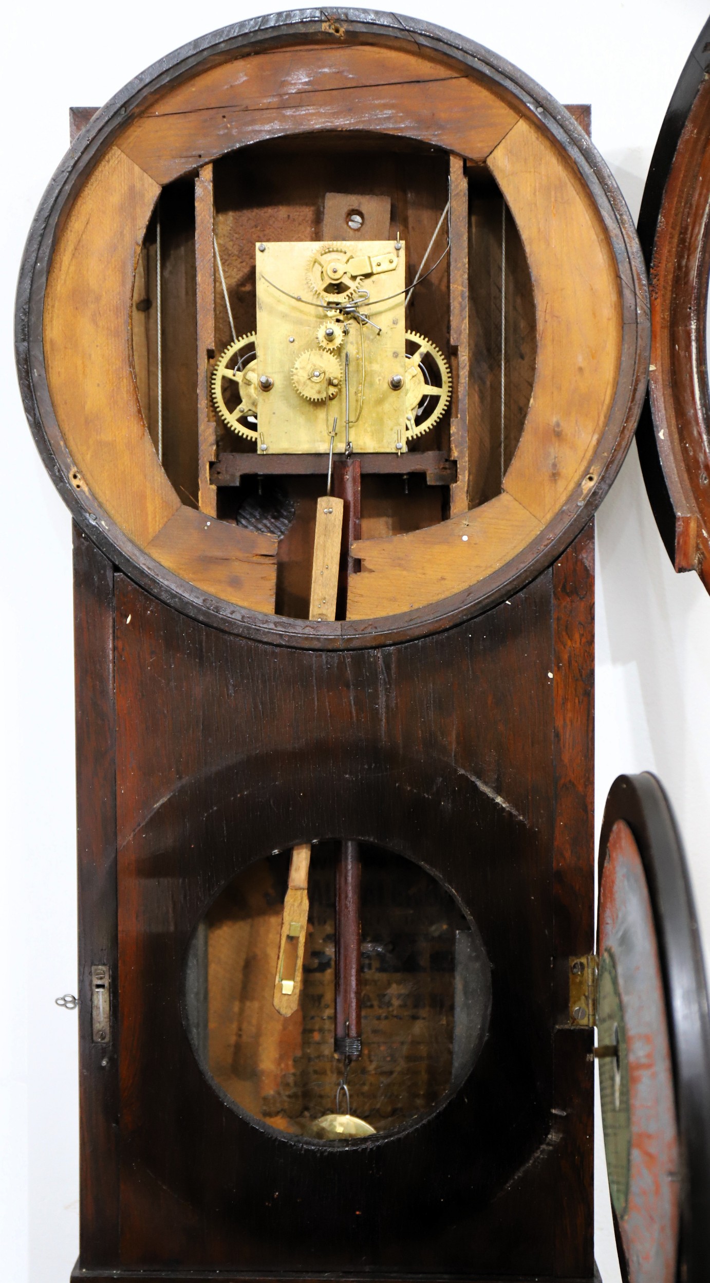 time-only movement is correct for this model and is running, driven by two 4-lb rectangular weights. The weekday hand is advancing