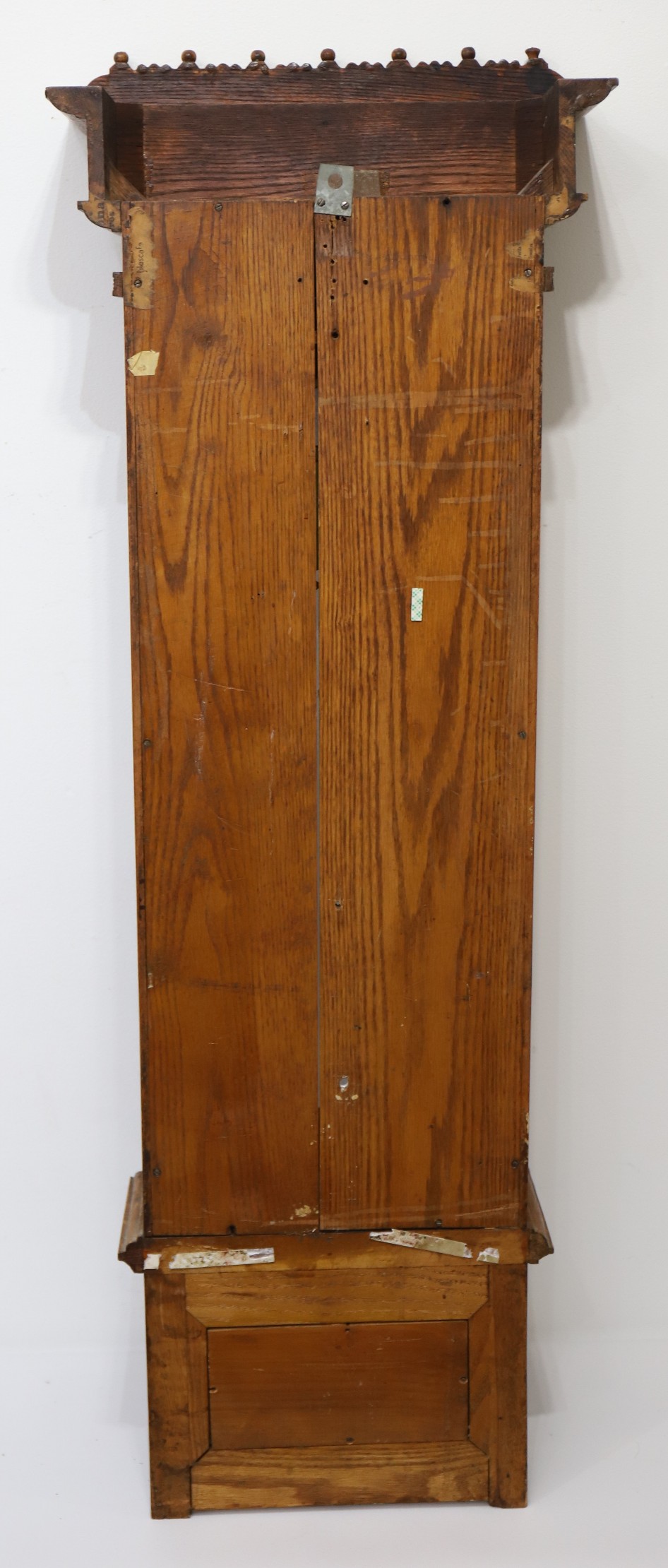 with a proper wooden pendulum stick and a badly worn bob that needs to be replaced. No label, and the backboard has separated. A fairly common model, usually in walnut; AAC sold a slightly nicer oak example in 2024 for $500. $400–$600.