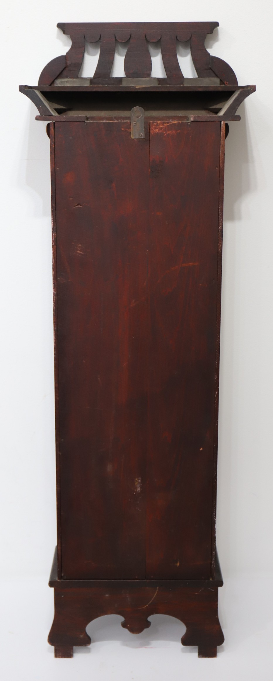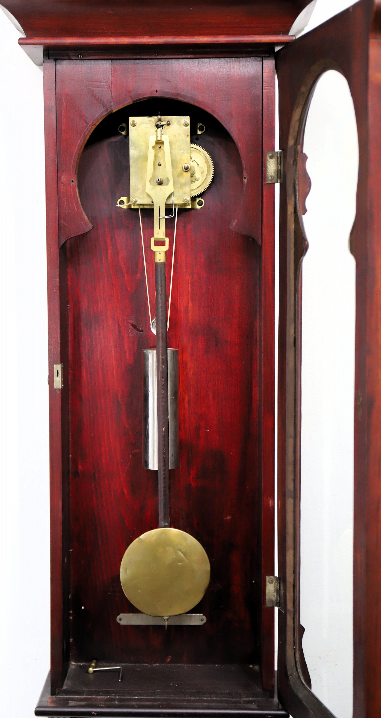 the AAC database. The 44-inch case is cherry with a “Mahogany Finish”; the door glass is original with the original putty. The dial is old paper, signed, the hands likely original, the dial bezel with light corrosion. The 8-day weight-driven, time-only