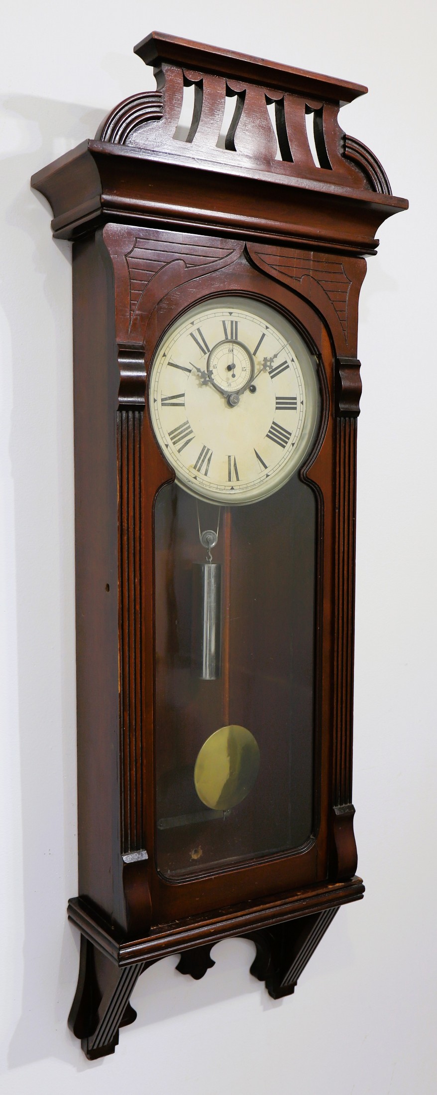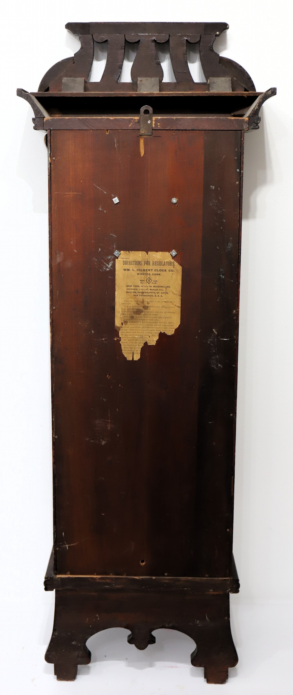 Wm. L. Gilbert Clock Co. “Regulator No. 65”, ca. 1910. The big brother to #196, at 50.5-inches tall in cherry with a beautiful old finish. The door glass is original with much of