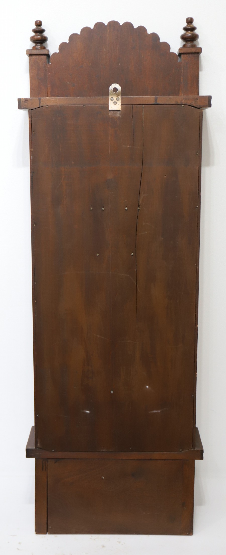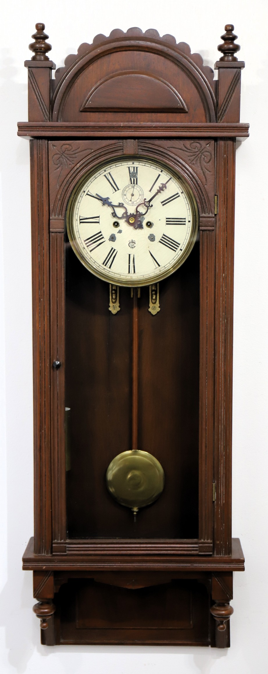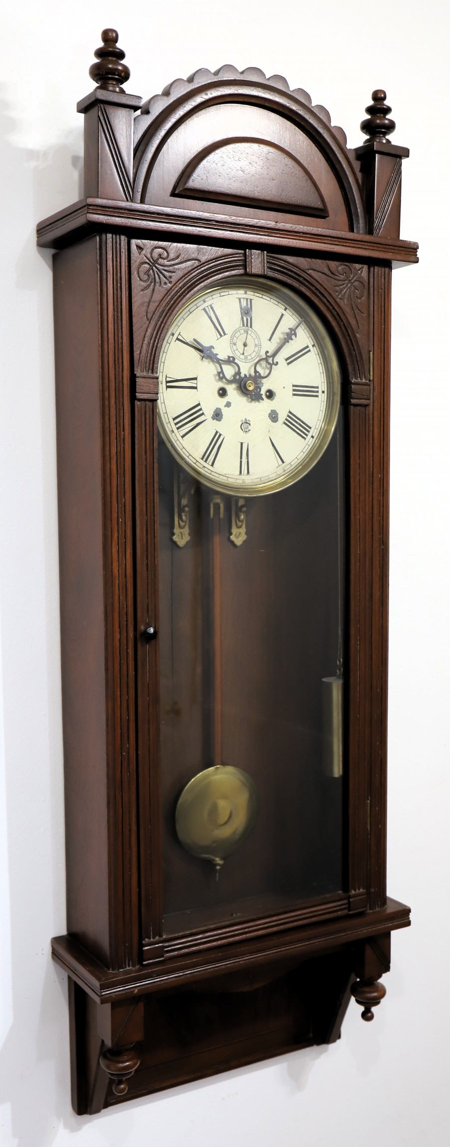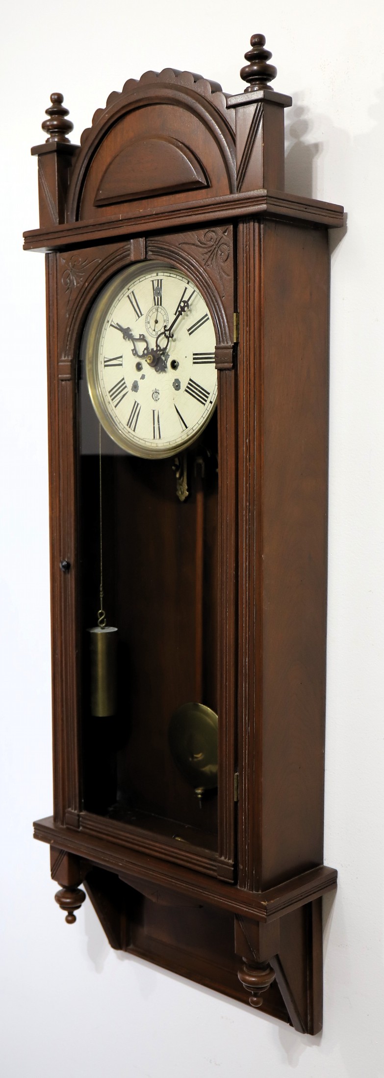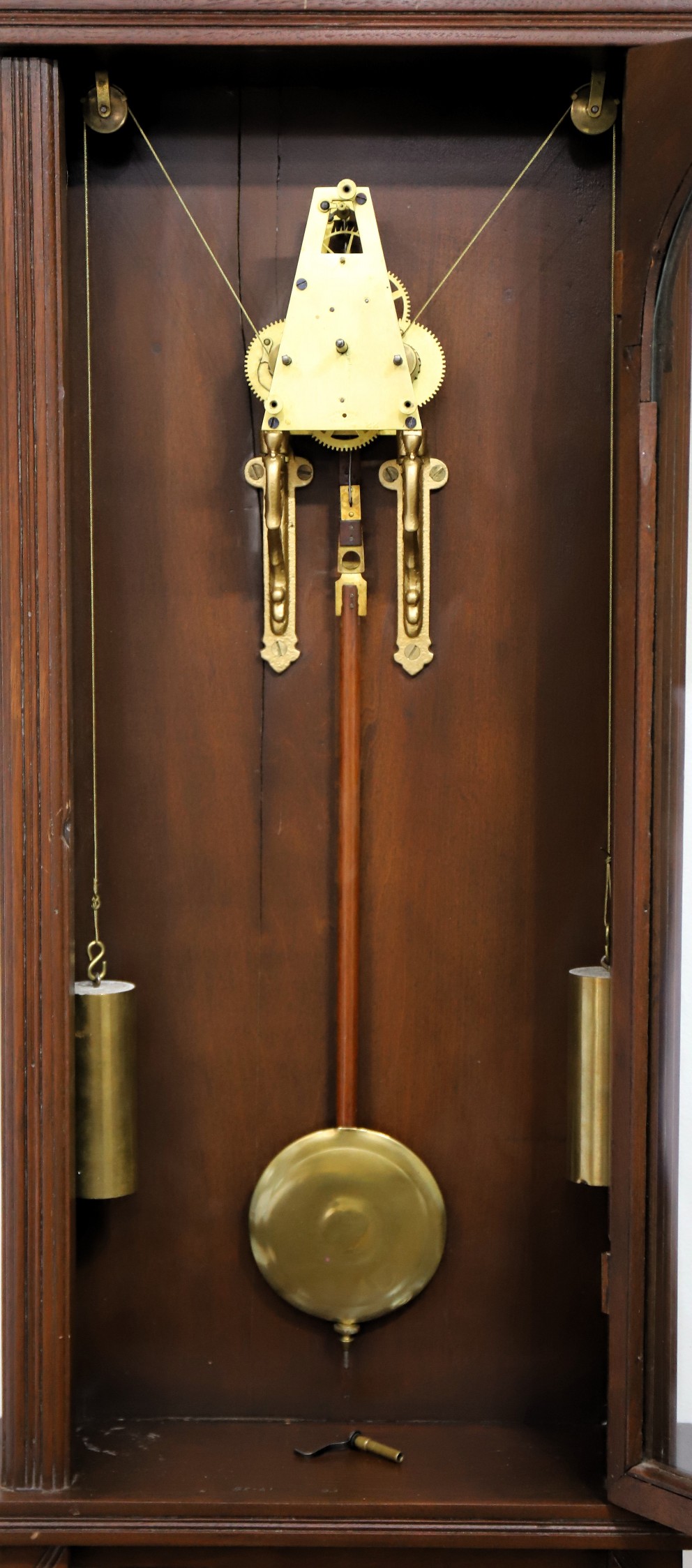 on earlier versions. The 46-inch case is walnut with a dark, older finish. The crest may be a proper, well-crafted replacement,